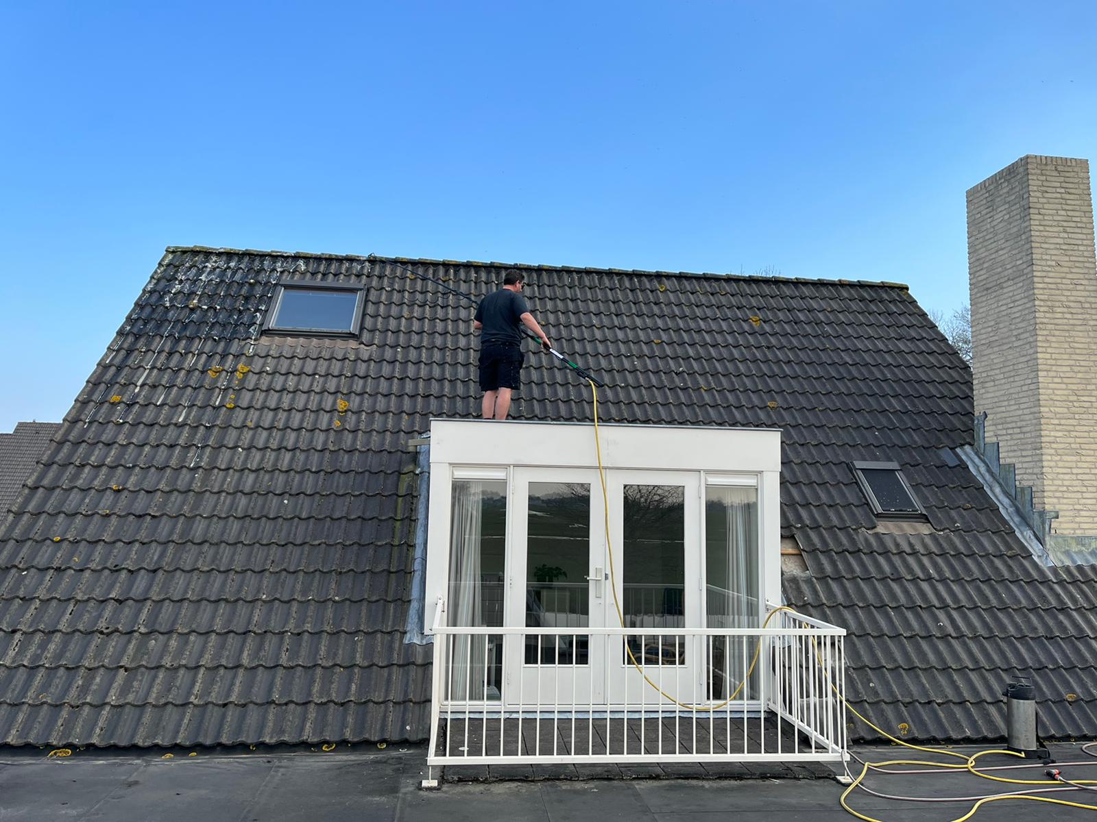 De pannendak zullen wij behandelen met een alg en mos dodend product. Vanwege de milieu eisen is het product biologisch afbreekbaar. De dakpannen worden ingespoten met het materiaal, het materiaal zorgt ervoor dat de algen en mossen dood gaan, de regen zorgt ervoor dat de algen en mossen van het dak afspoelen. Omdat het biologisch afbreek baar is, is het resultaat pas zichtbaar na enkele weken / maanden. Met deze behandelingen halen wij 85 tot 100% van de algen en mossen weg zonder schade of lekkage te veroorzaken.