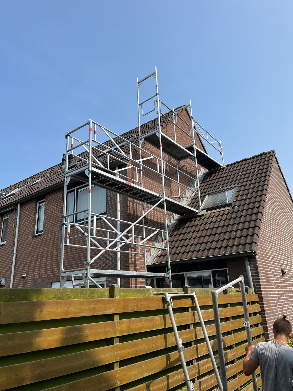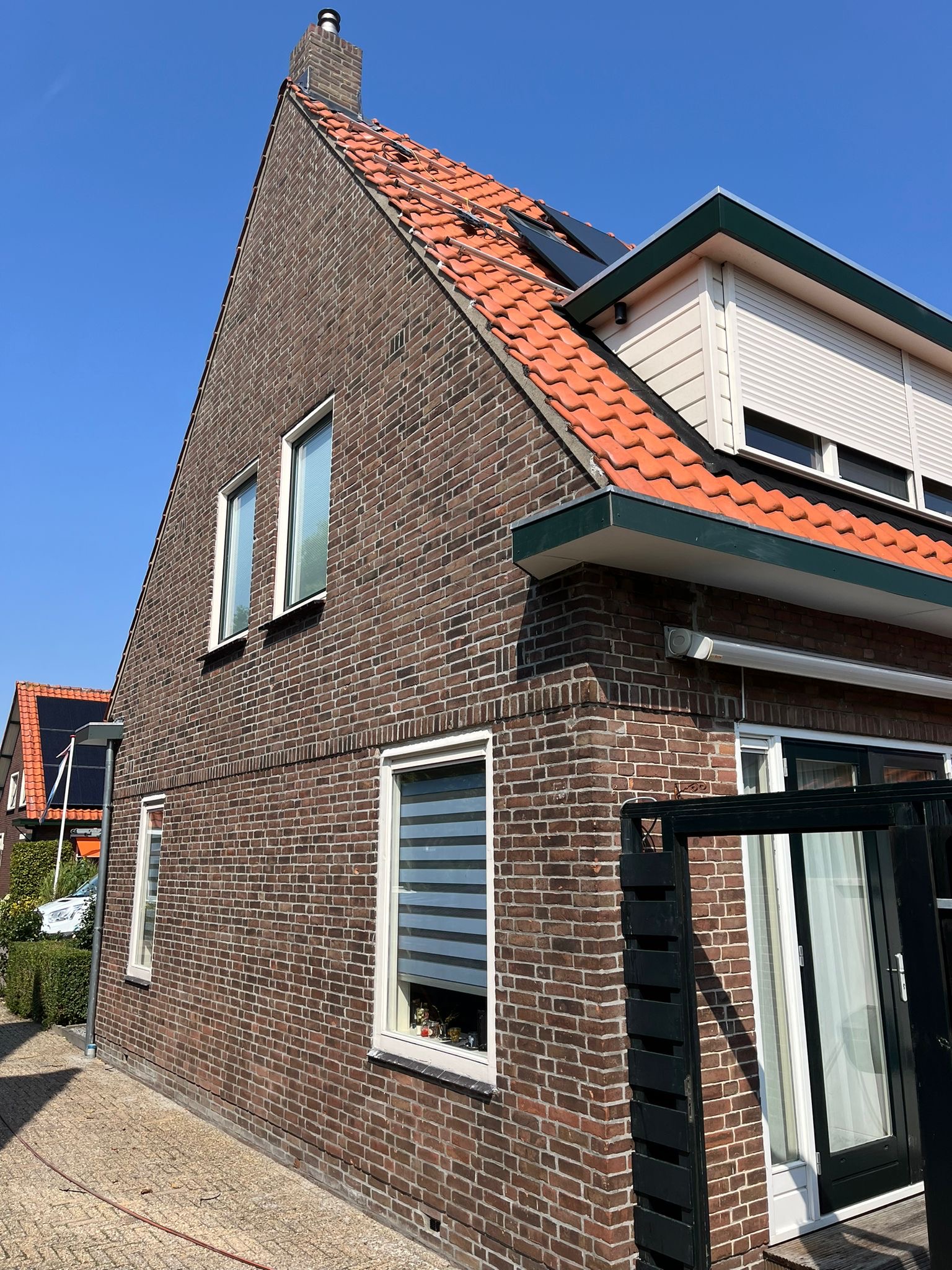 Aan de linker zijgevel van het woonhuis zullen wij het spouwlood gaan vervangen. Het metselwerk wordt 2 a 3 lagen metselwerk verwijderd over de gehele lengte. Wij zullen het metselwerk opvangen met gevelstuts zodat het metselwerk niet zal inzakken.