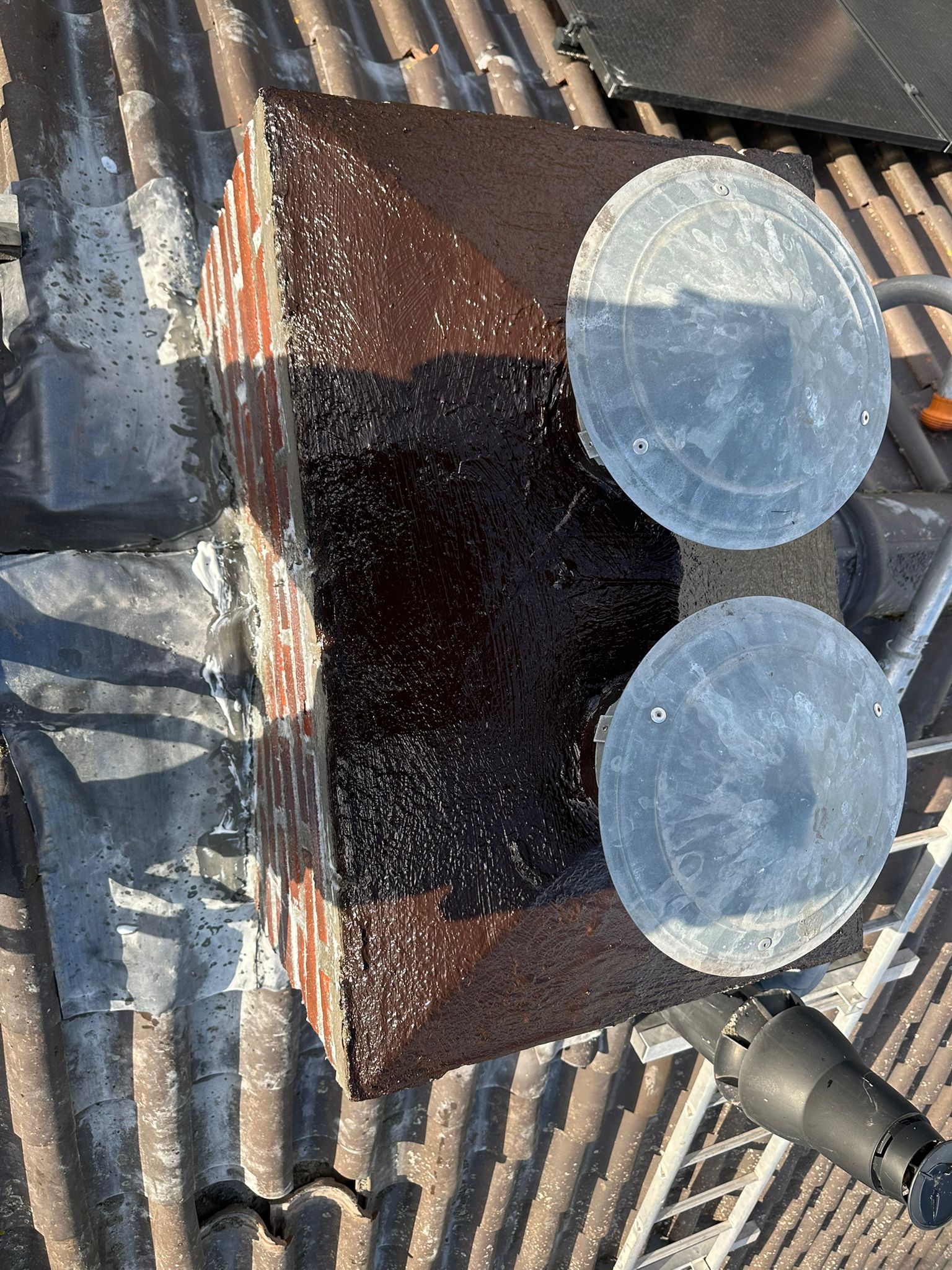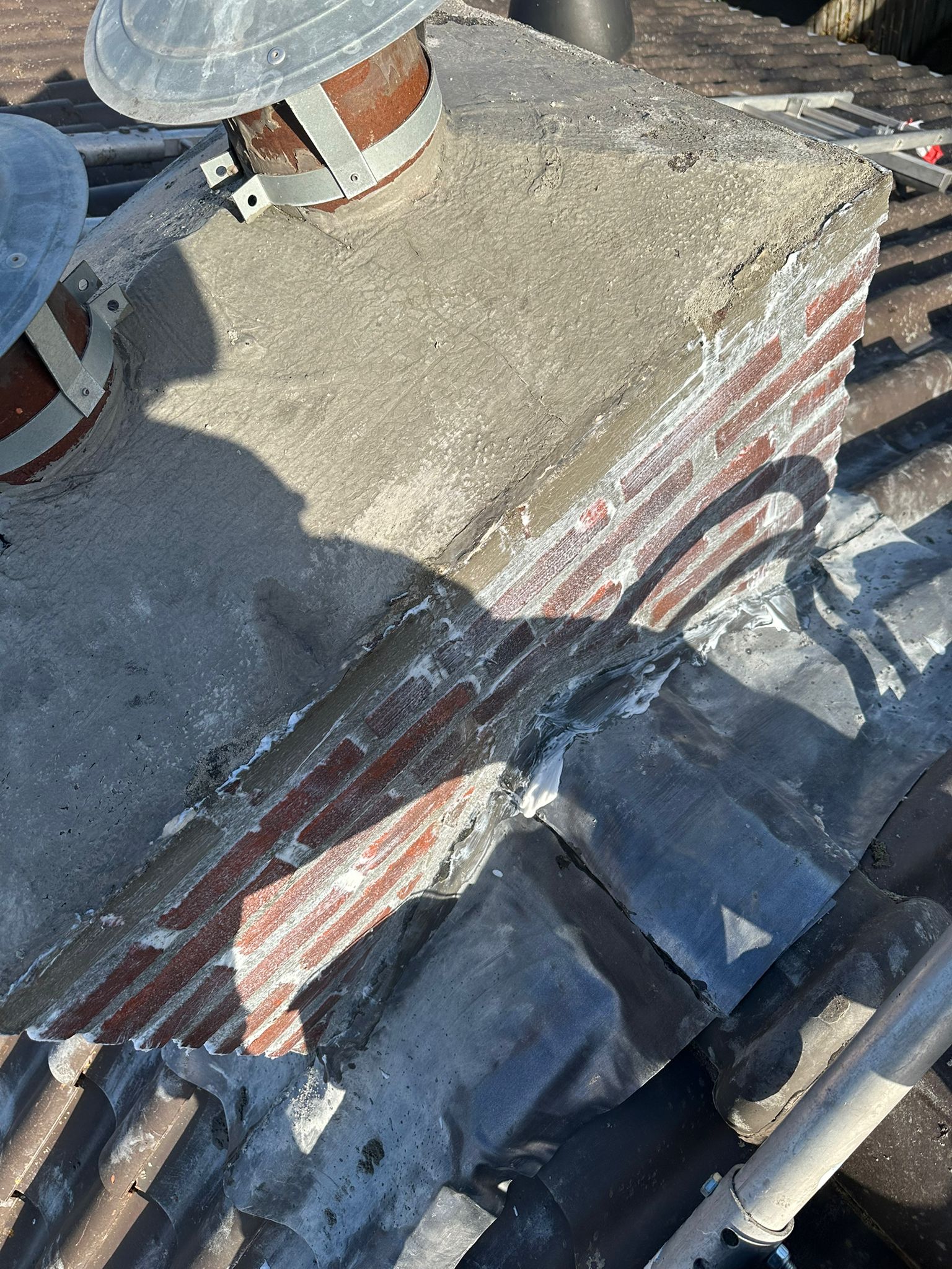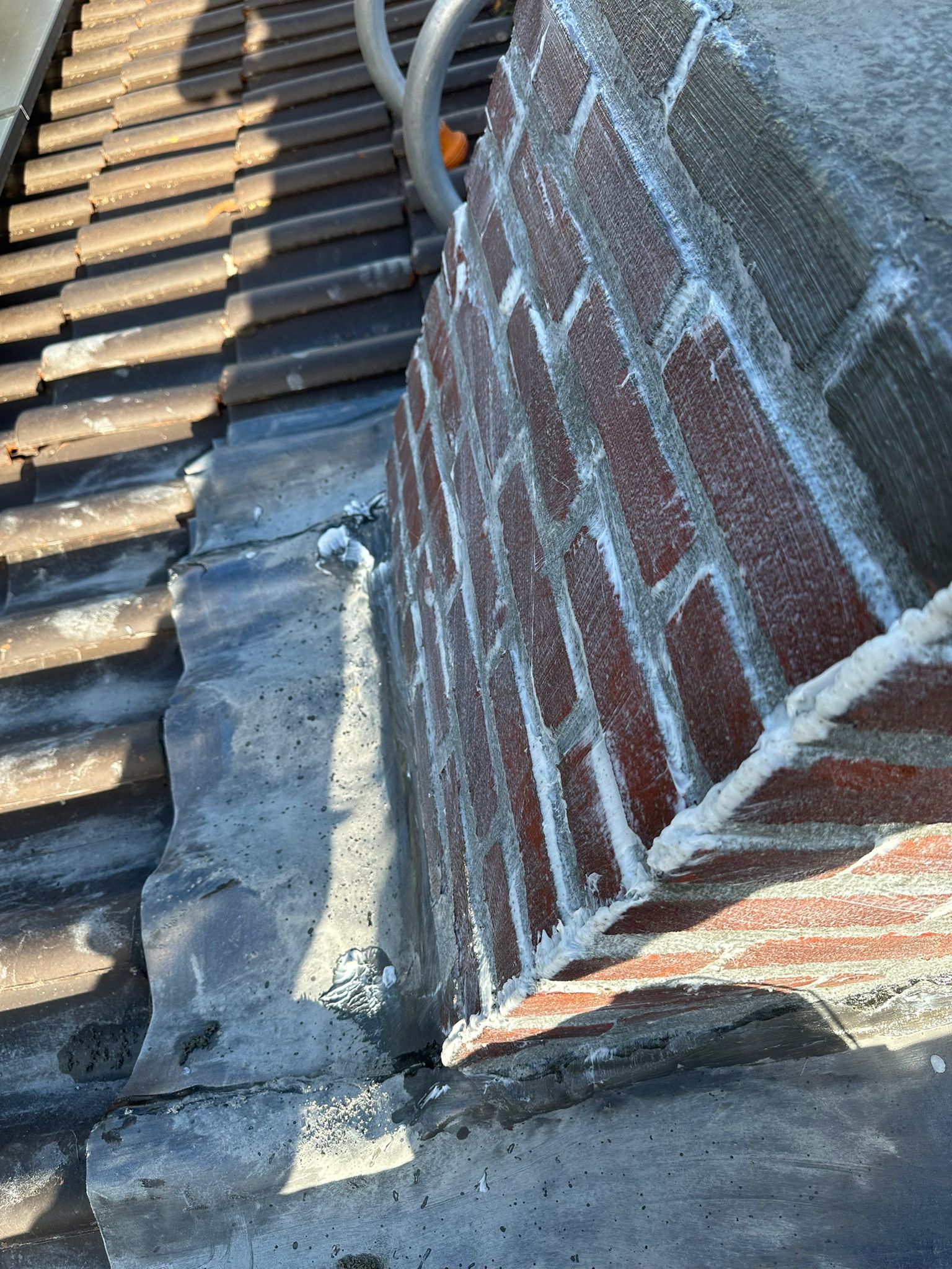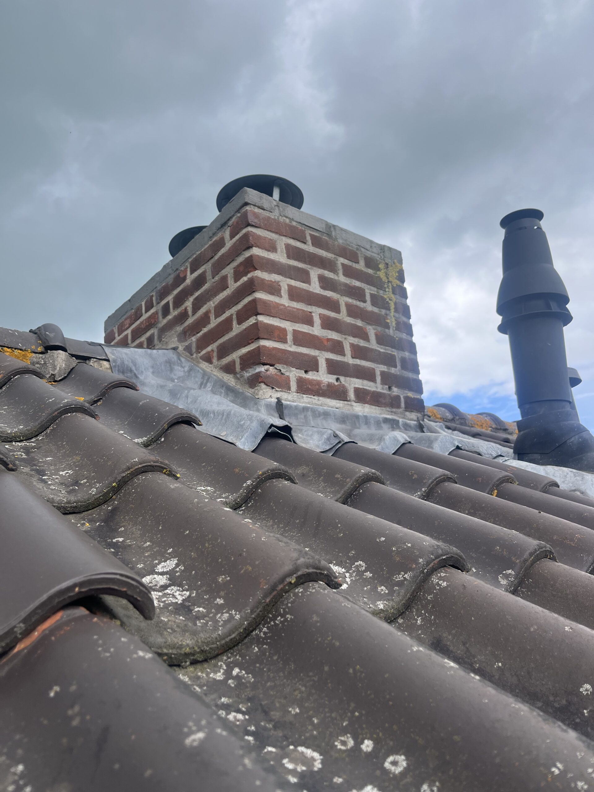 Nu het lood is aangebracht kunnen wij de stenen weer terug plaatsen. Het metselwerk wordt aangebracht, om de paar lagen stenen brengen wij openstootvoegen aan zodat het vocht ook daadwerkelijk weg kan vloeien.