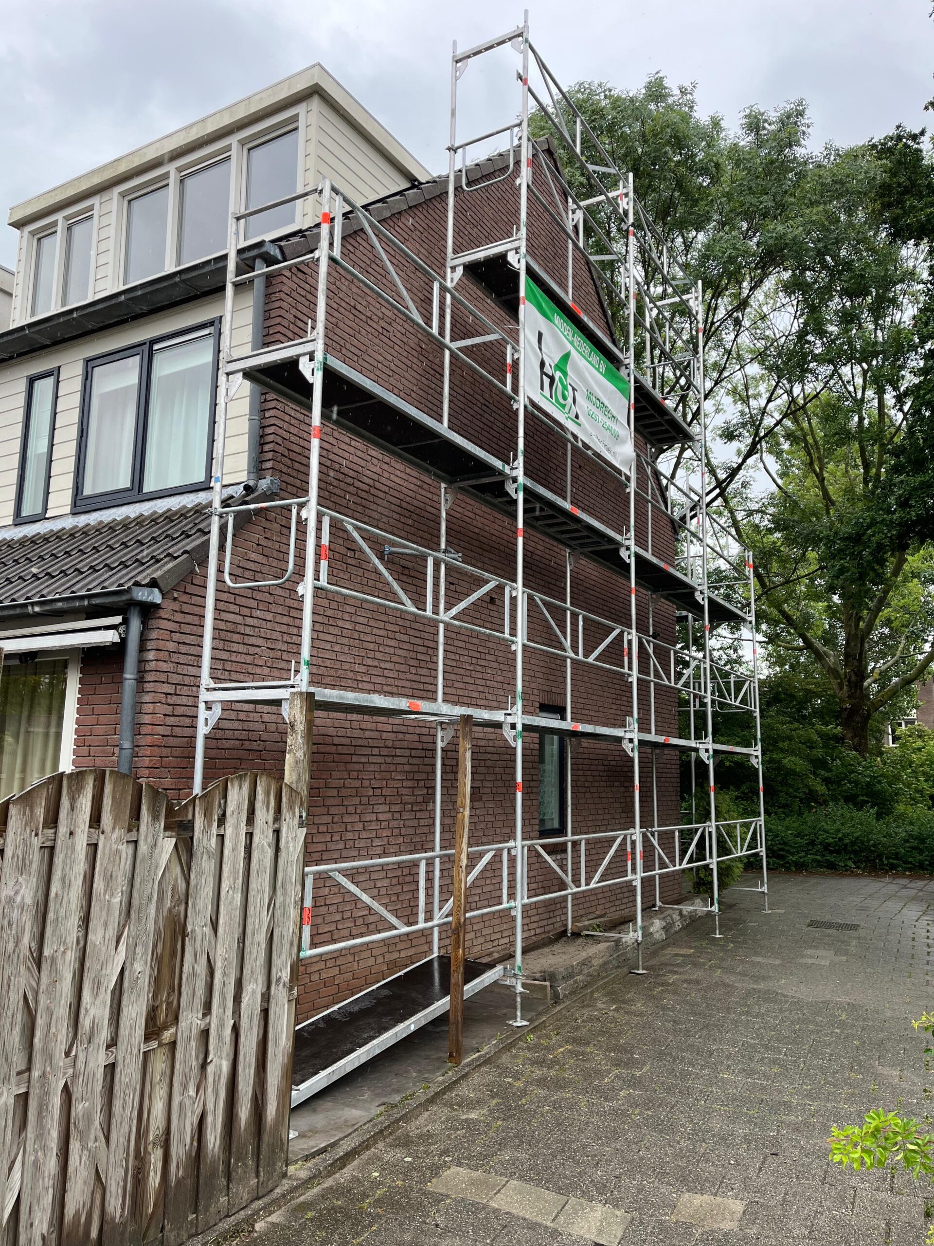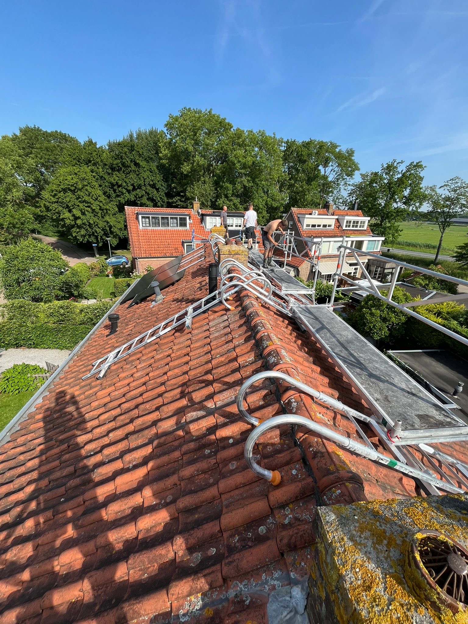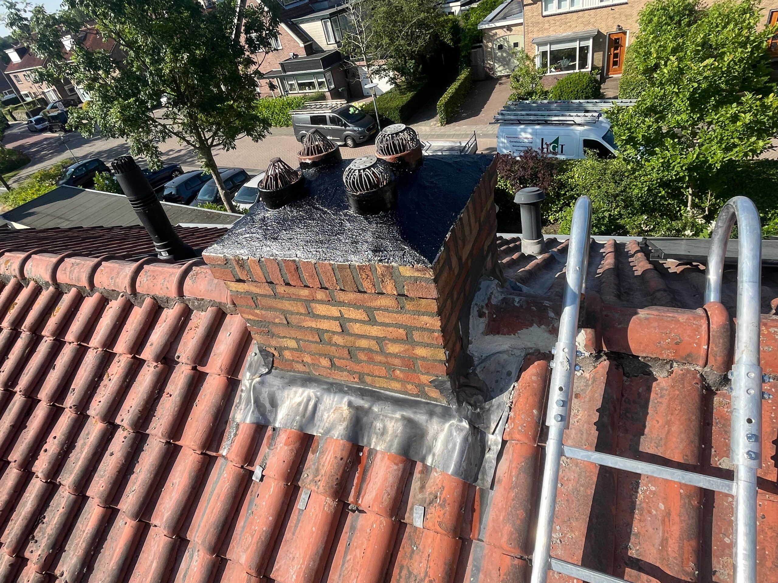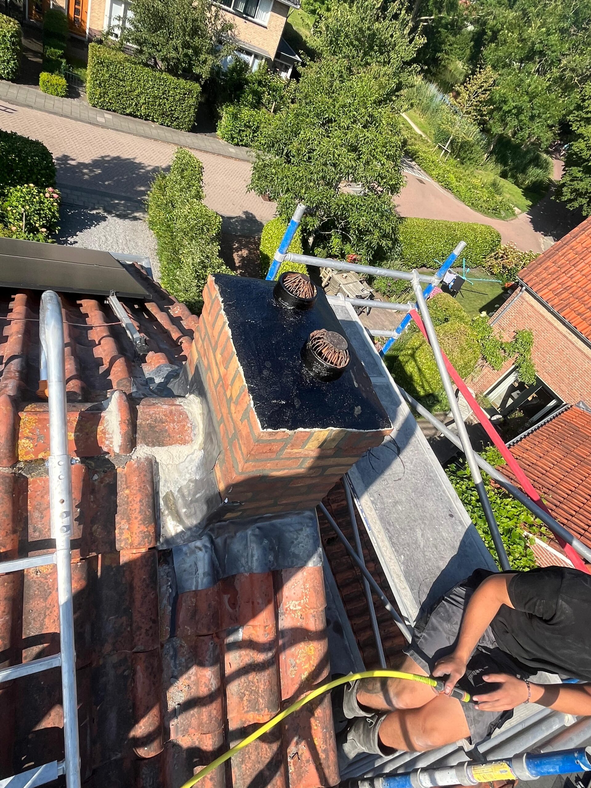 Voor aanvang van de werkzaamheden zullen wij beginnen met het toegankelijk maken van de schoorsteen. Dit wordt gedaan d.m.v. steigers en hangladders zodat wij via deze ladders bij de schoorstenen kunnen komen.