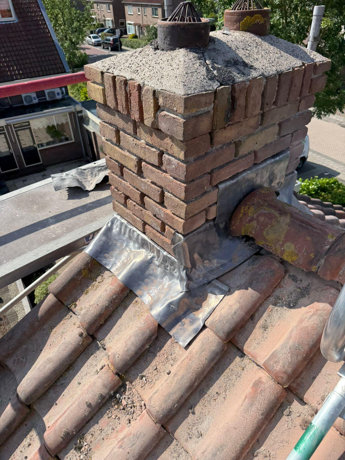 Het lood van de schoorsteen wordt compleet vervangen voor nieuw 18 ponds lood. Het oude bestaande lood wordt verwijderd en afgevoerd, daar waar het nieuw lood komt zullen wij het metselwerk inslijpen tot een diepte van ongeveer 30 a 35 mm. De ondergrond zullen wij stofvrij maken, nu kan het nieuwe lood worden aangebracht. Het lood wordt in de gevel vastgezet met loodklemmen. Als het lood is aanbracht wordt de schoorsteen gevoegd.