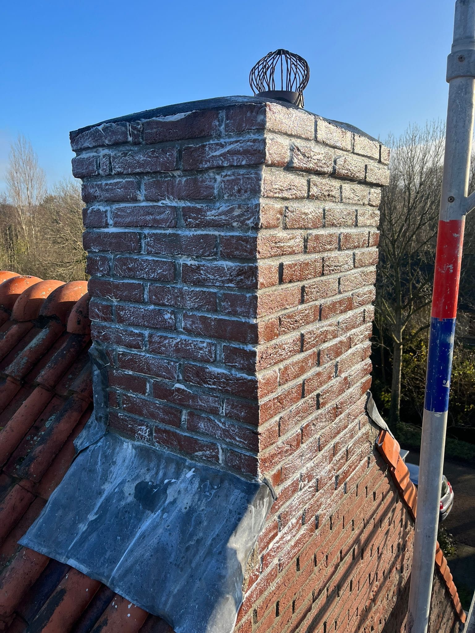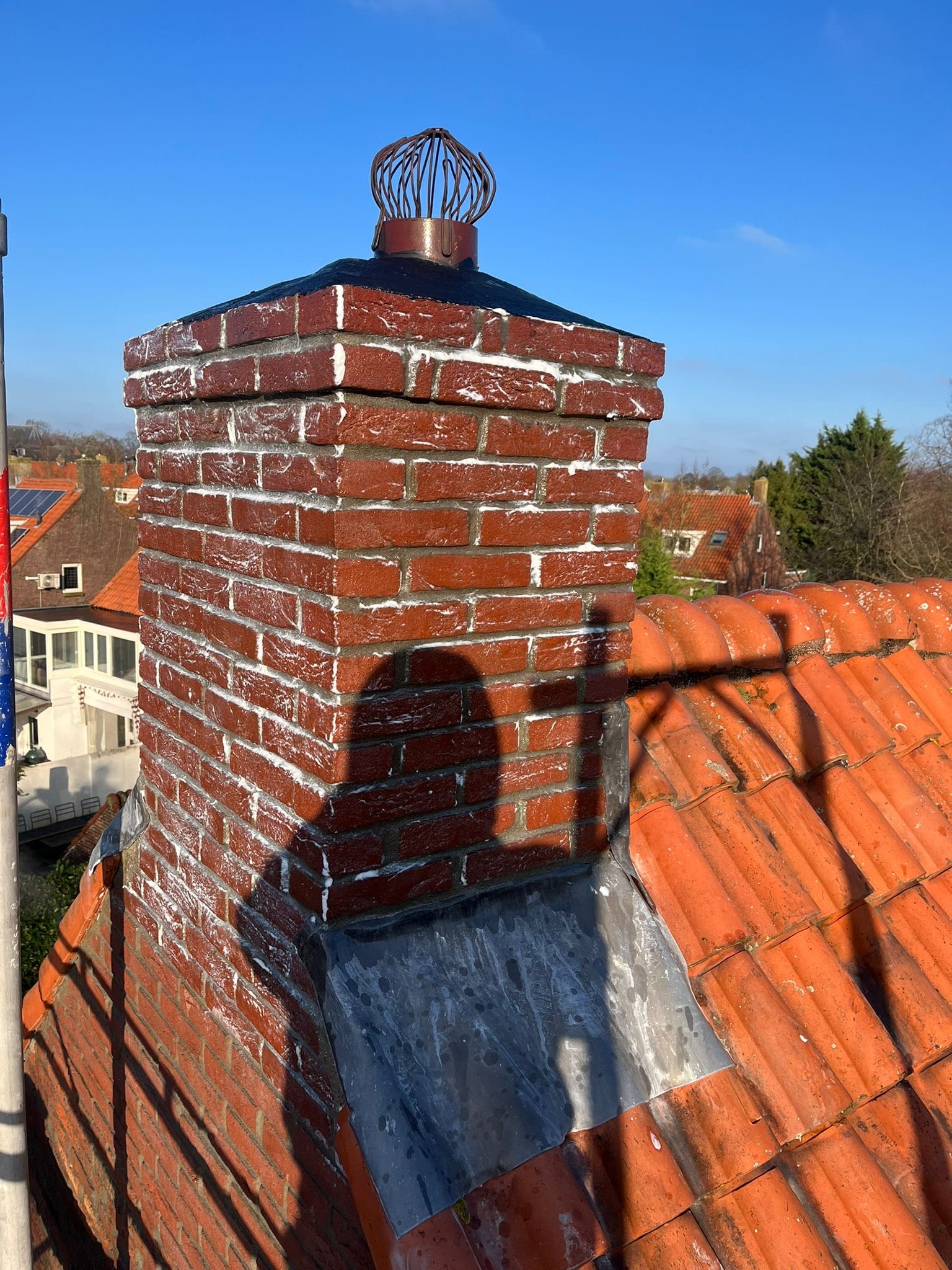 De bovenkant van de schoorsteen wordt meegenomen met het reinigen. (cement deklaag) Mocht deze kapot zijn of beschadigd zijn dan zullen wij dit repareren of vervangen. Naderhand zullen wij de cement deklaag behandelen met fillcoat. Dit is een coating dit voorkomt dat regenkant via de bovenkant van de schoorsteen kan indringen. Het dak wordt na het beëindigen van de werkzaamheden weer schoon opgeleverd, incl. het schoonmaken van de dakgoten.