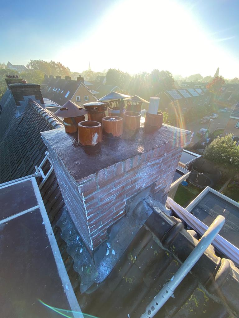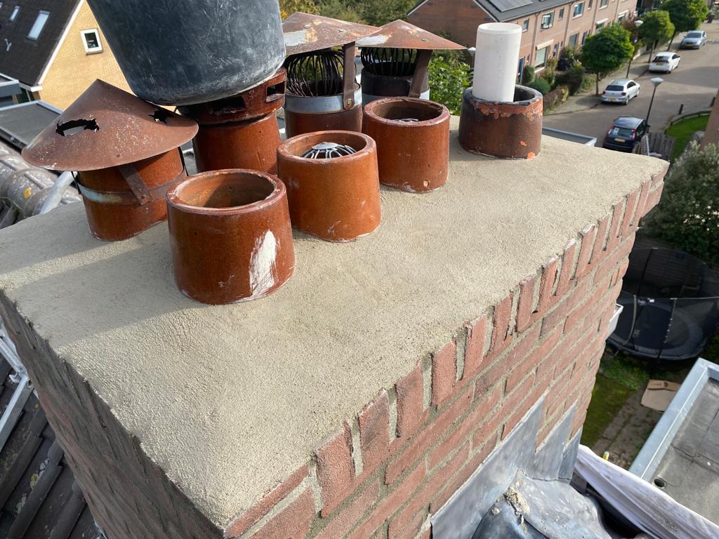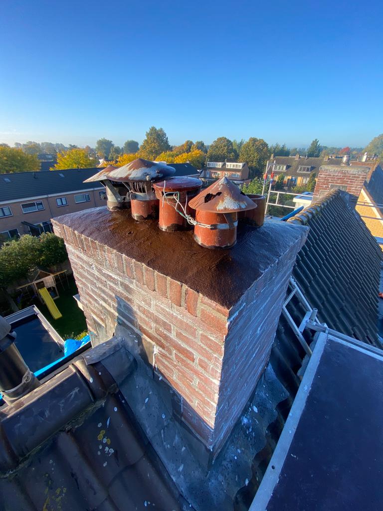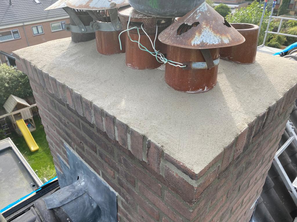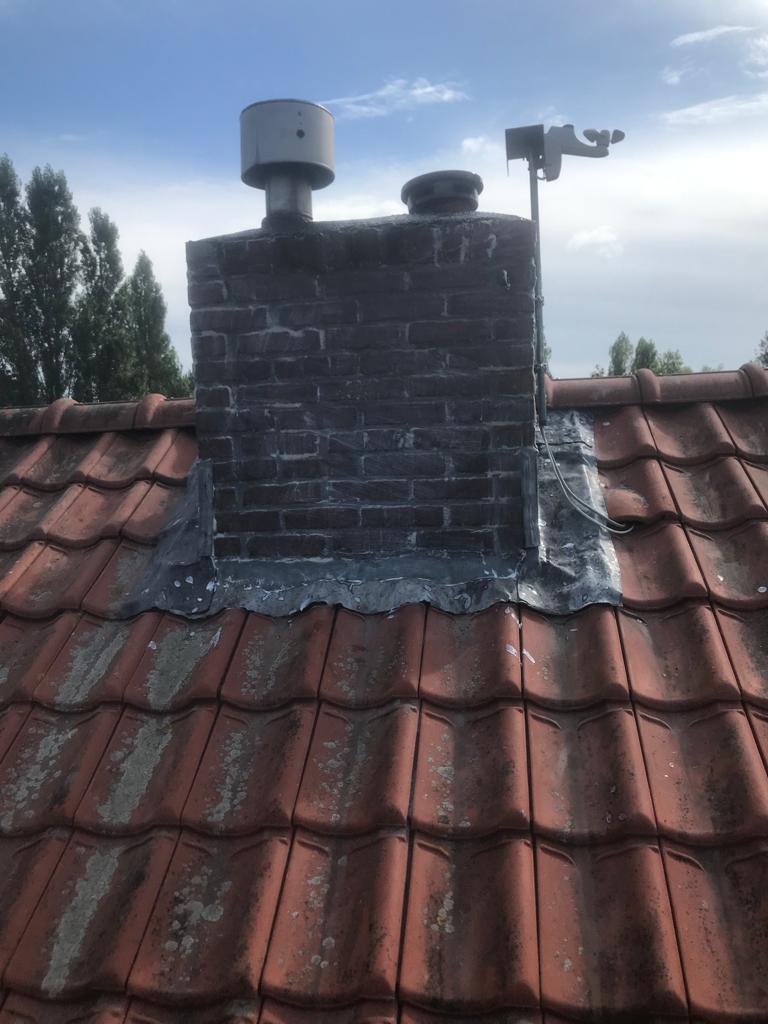 3) Het uithakken/slijpen, HD-reinigen, opnieuw voegen, impregneren en afmeren van de schoorstenen. (schoorsteen onderhoud)