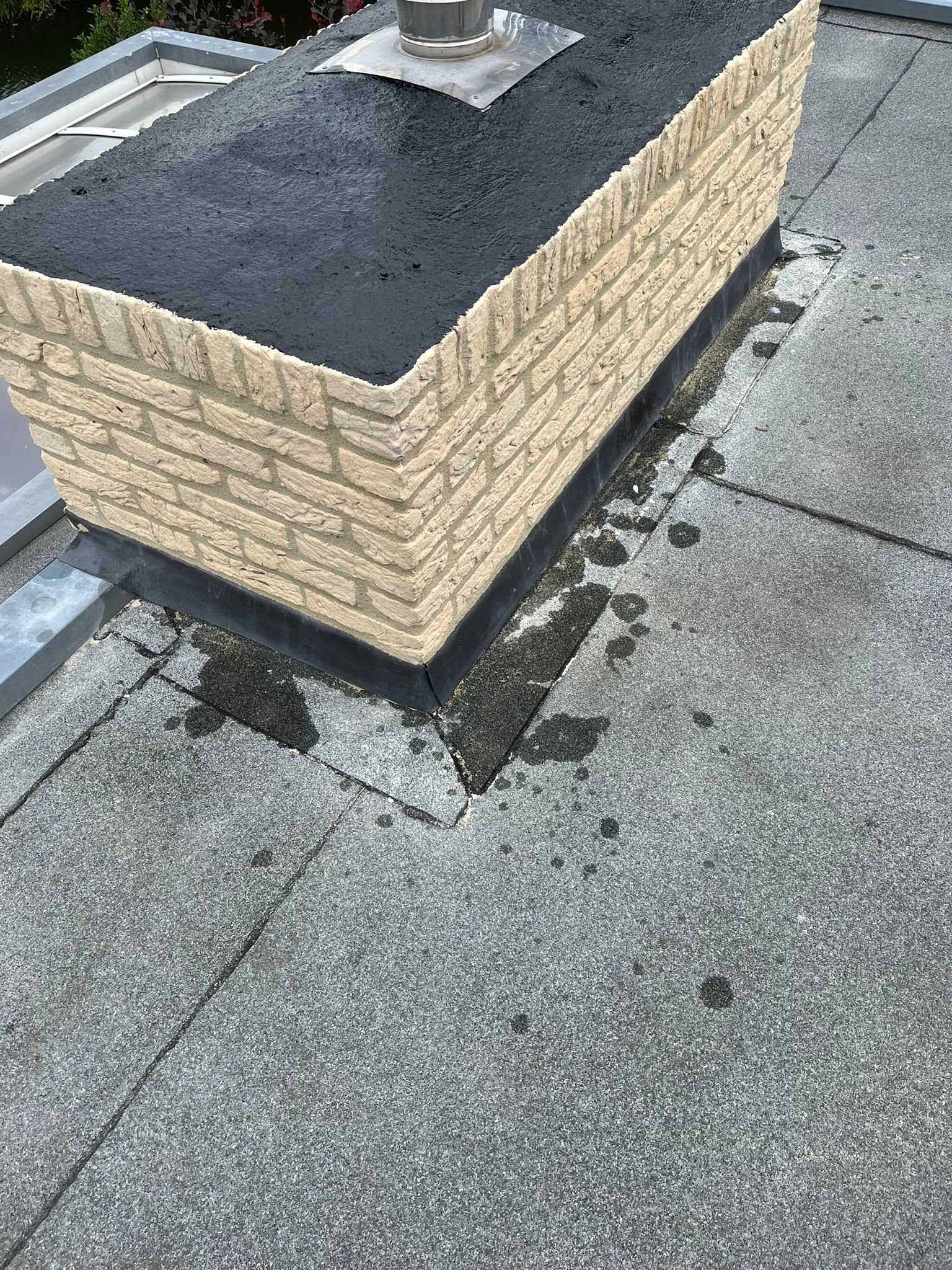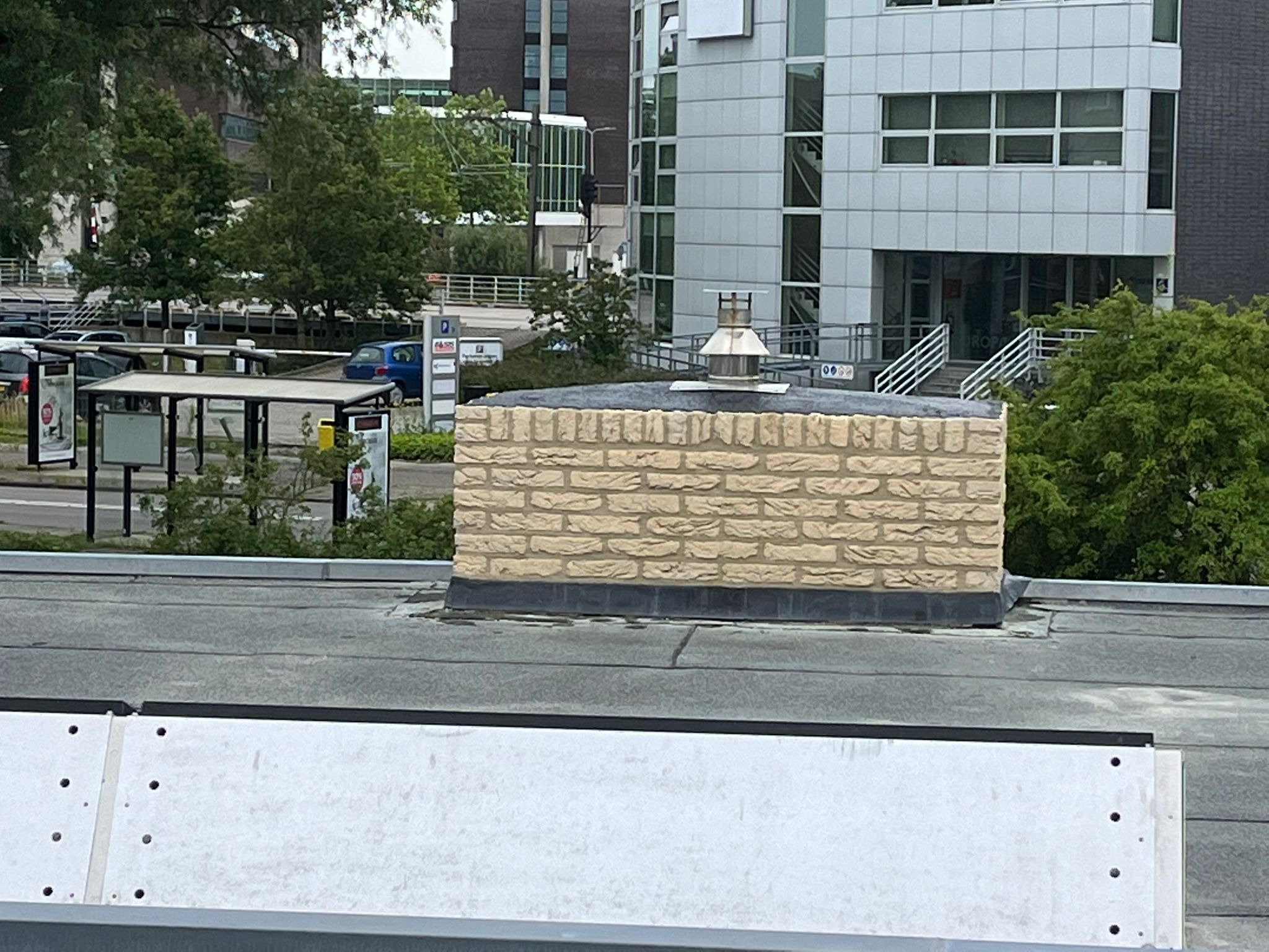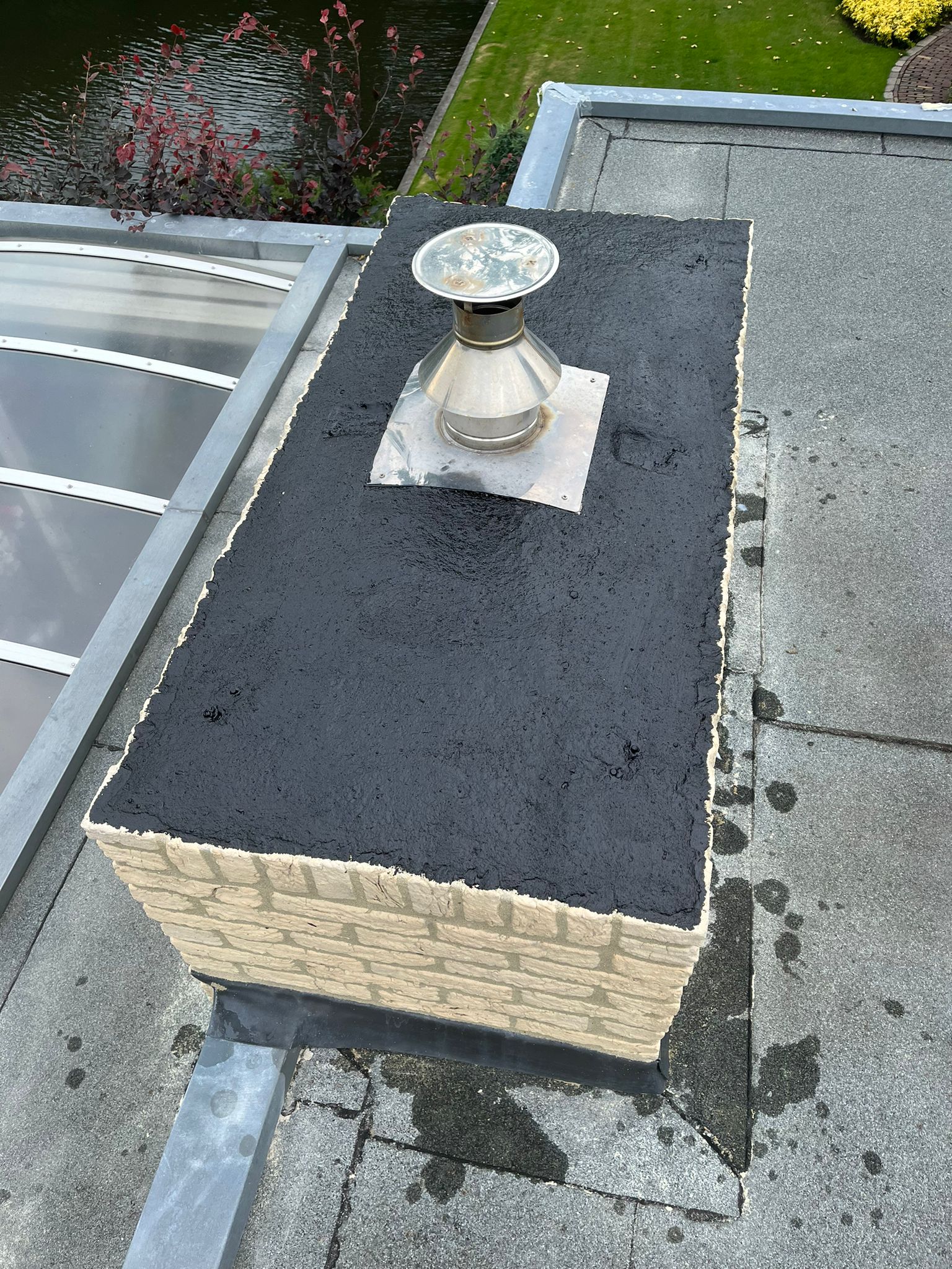 3) Het uithakken/slijpen, HD-reinigen, opnieuw voegen, impregneren en afmeren van de schoorstenen. (schoorsteen onderhoud)