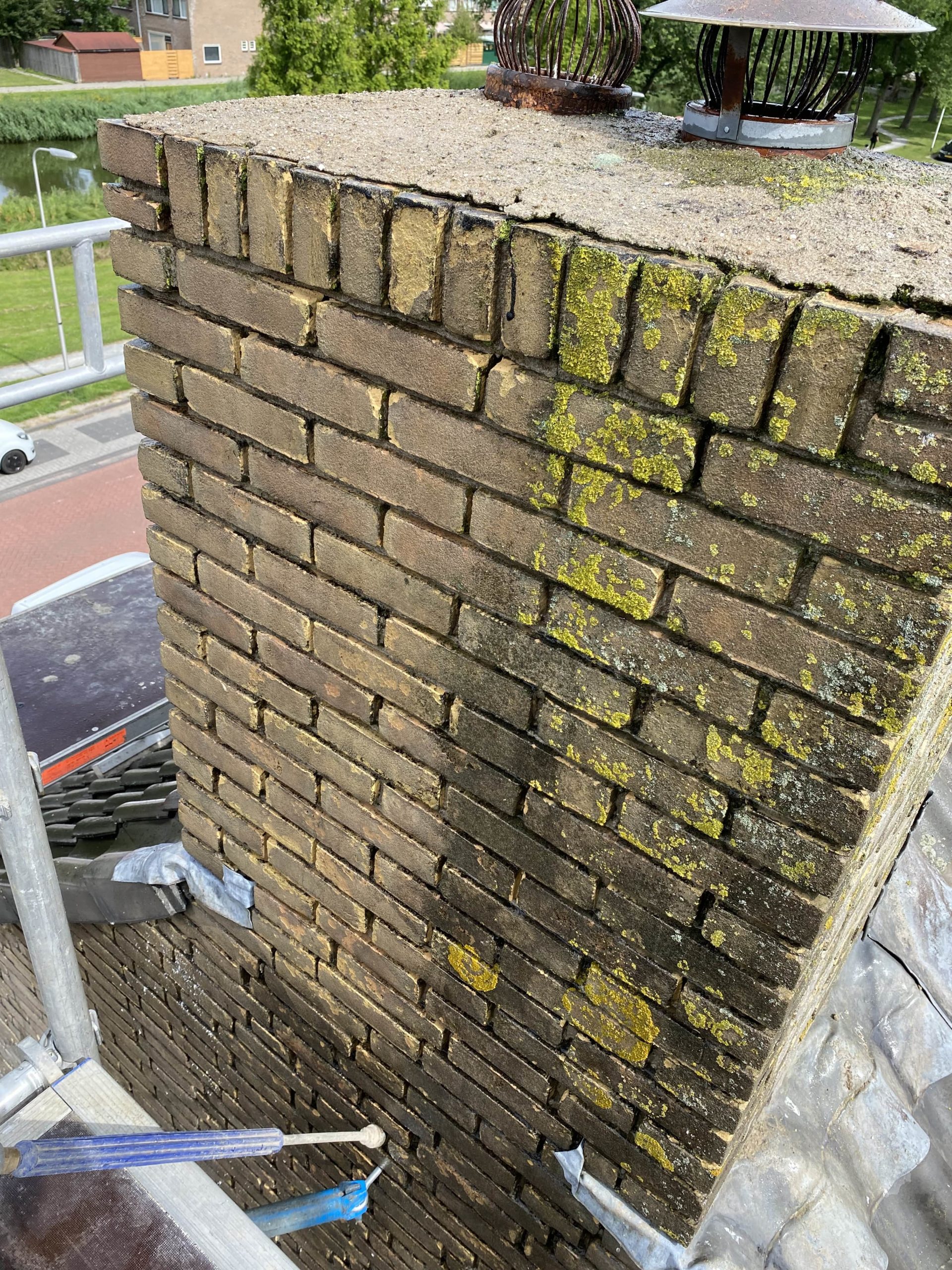 Voor aanvang van de werkzaamheden zullen wij beginnen met het toegankelijk maken van de schoorsteen. Dit wordt gedaan d.m.v. steigers en hangladders zodat wij via deze ladders bij de schoorstenen kunnen komen.