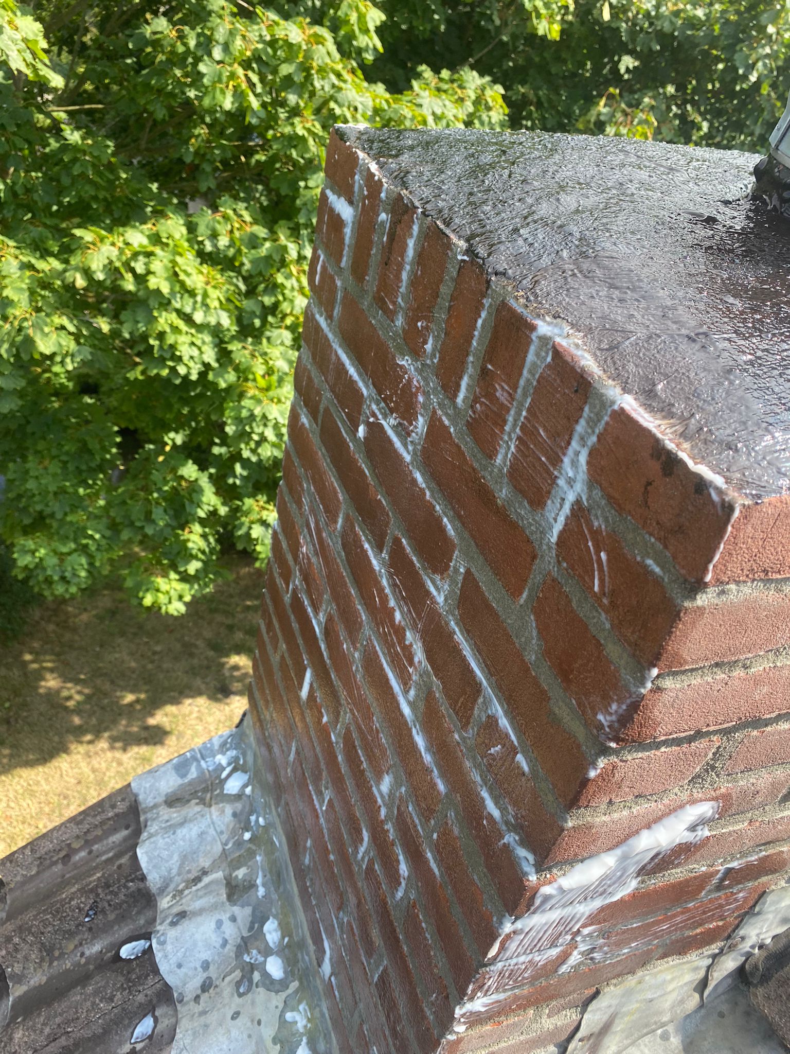 3) Het uithakken/slijpen, HD-reinigen, opnieuw voegen, impregneren en afmeren van de schoorsteen. (schoorsteen onderhoud)
