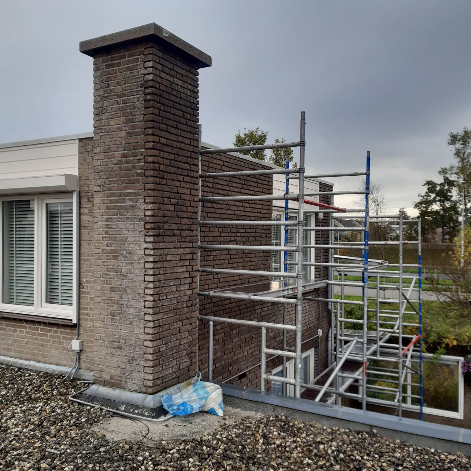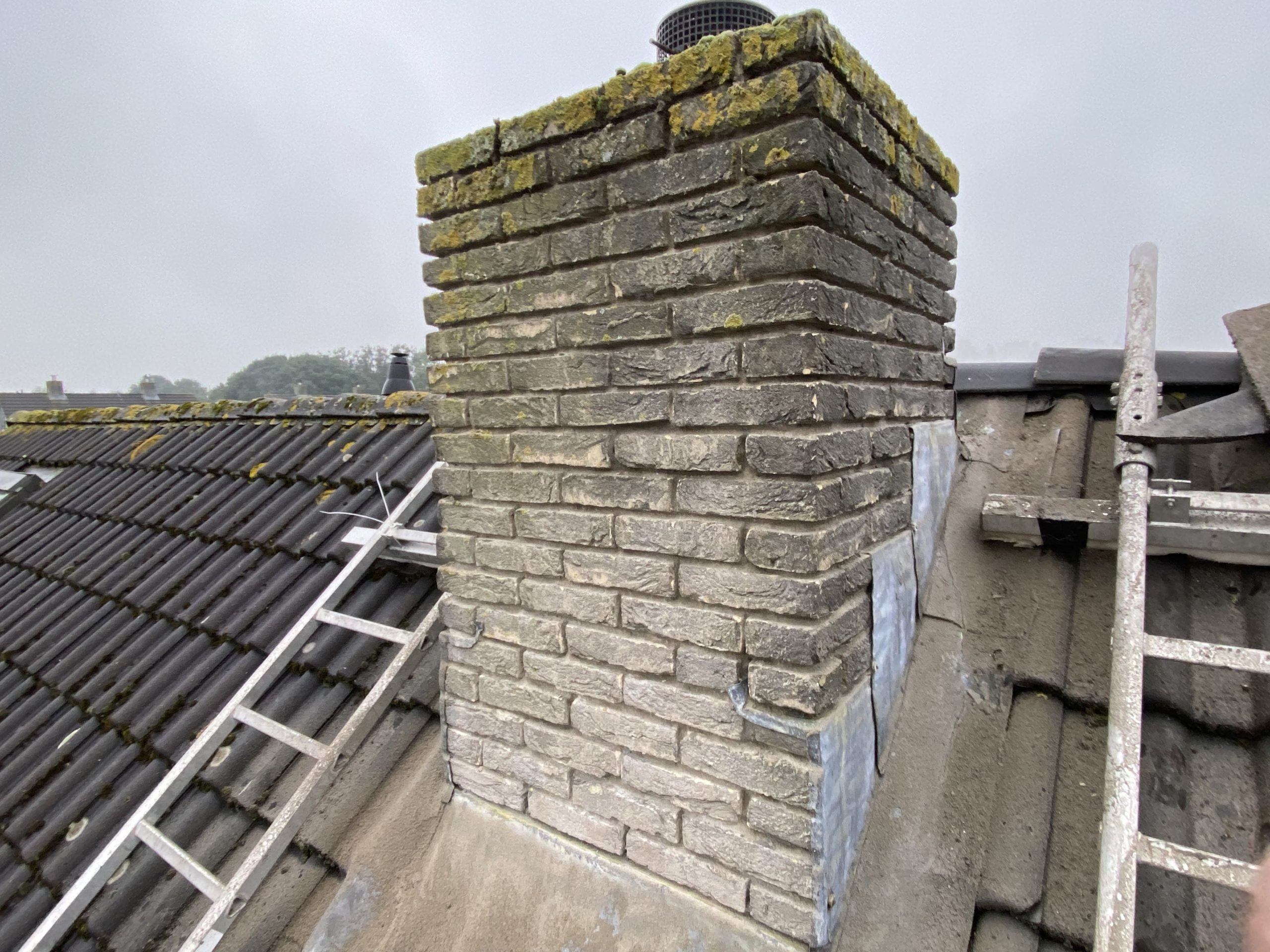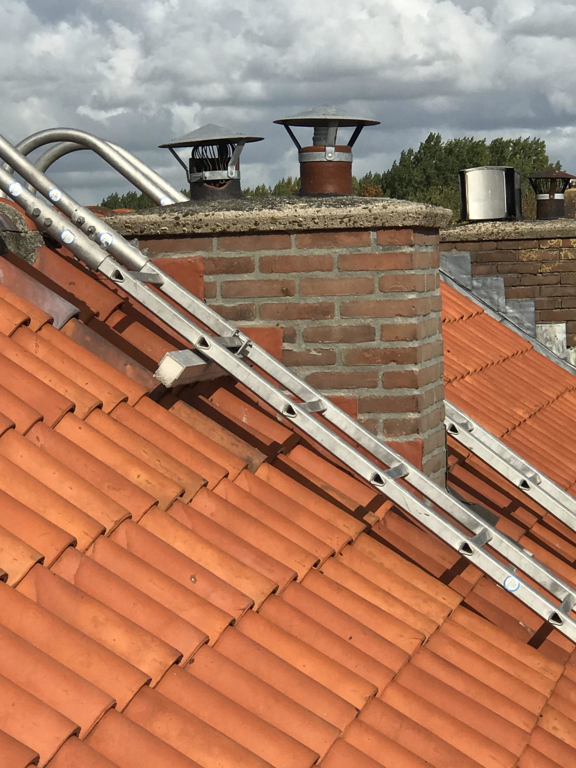 Voor aanvang van de werkzaamheden zullen wij beginnen met het toegankelijk maken van de schoorsteen. Dit wordt gedaan d.m.v. steigers en hangladders zodat wij via deze ladders bij de schoorstenen kunnen komen.