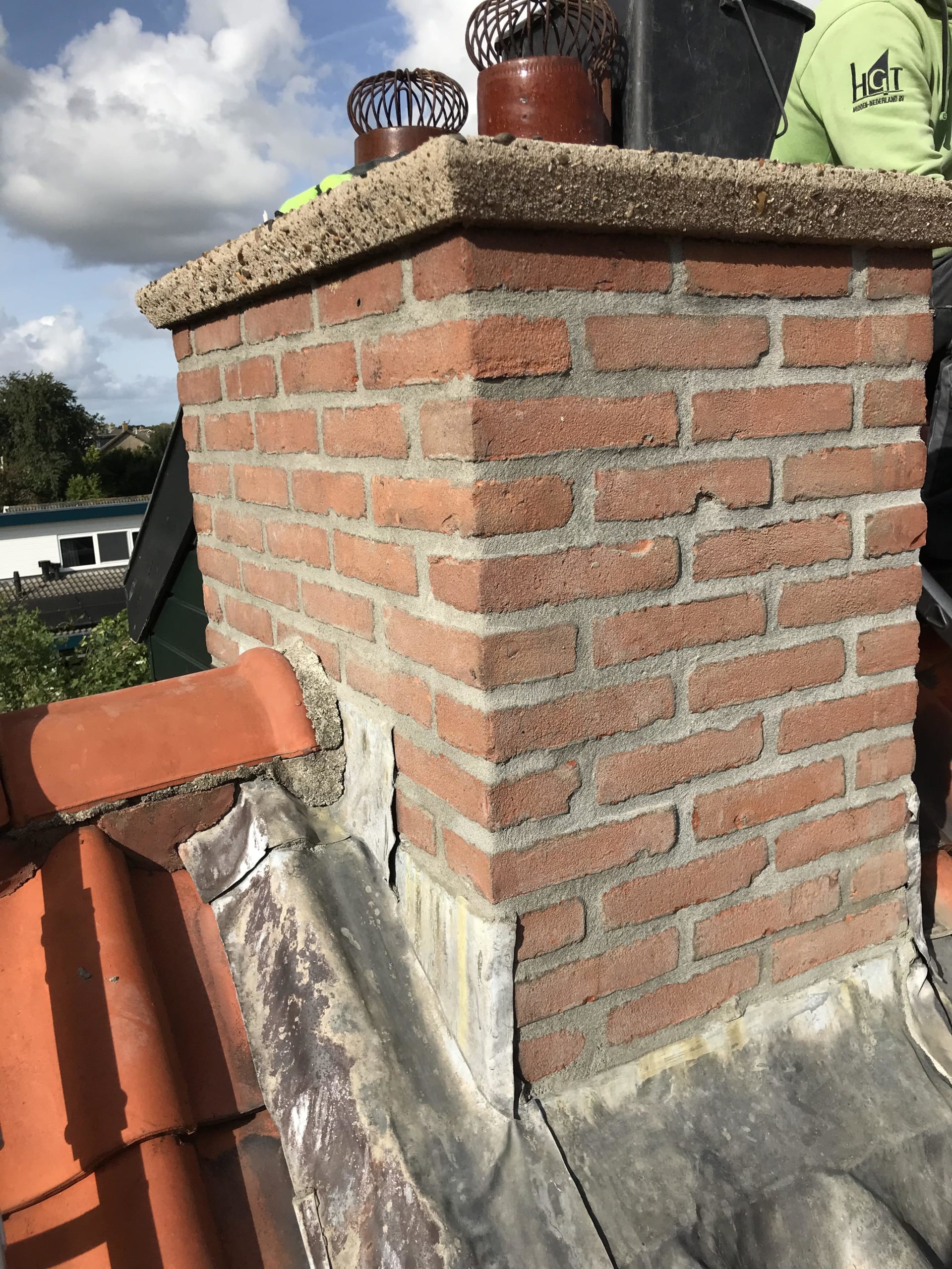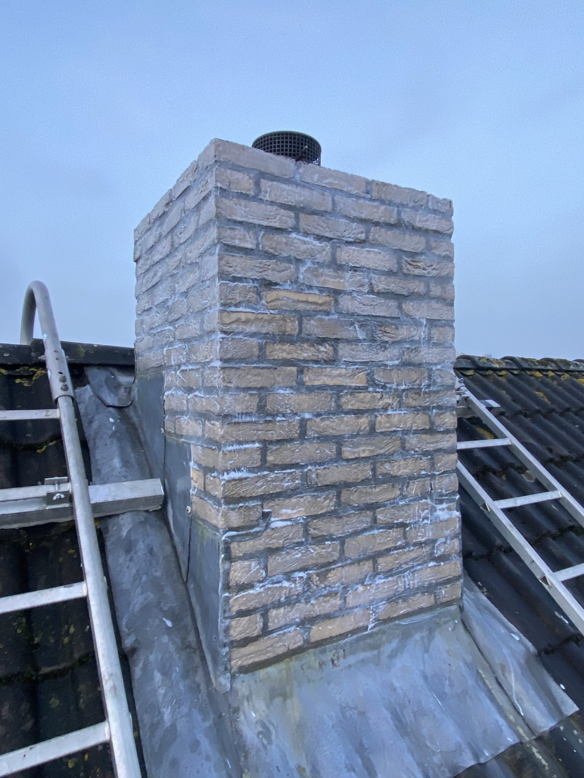4) Het uithakken, stralen of HD reinigen, opnieuw voegen, impregneren en afsmeren van de schoorsteen.