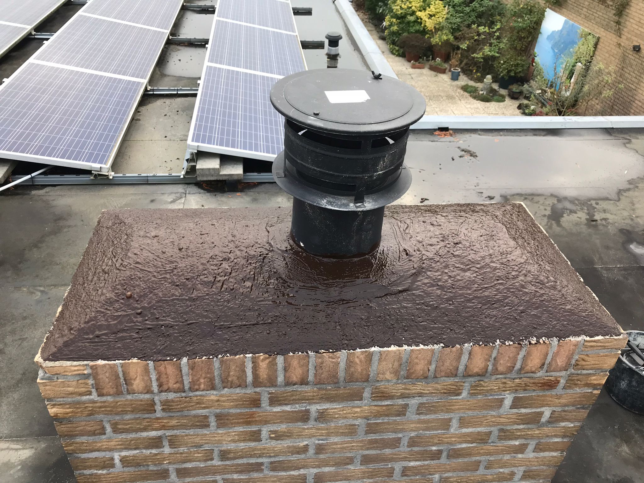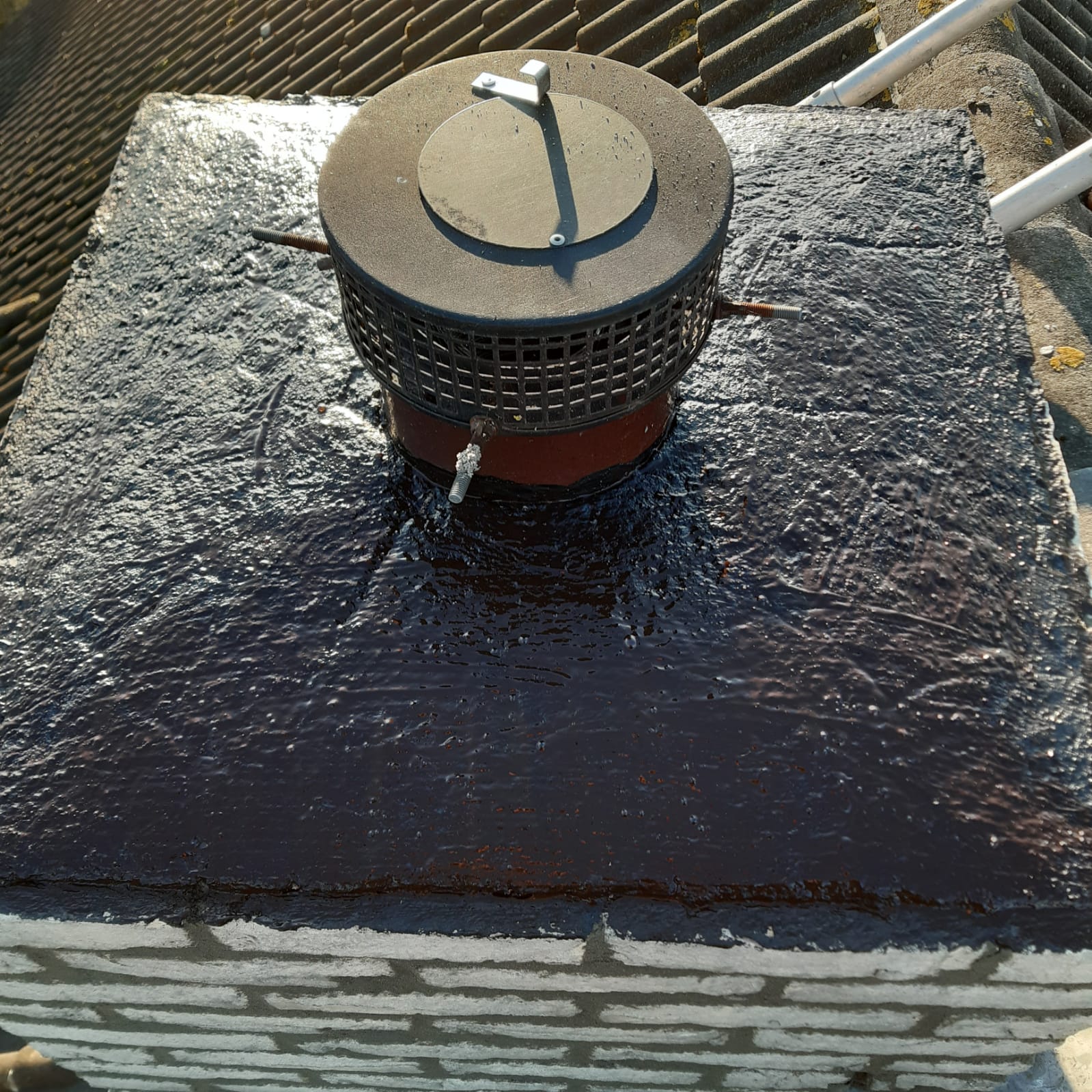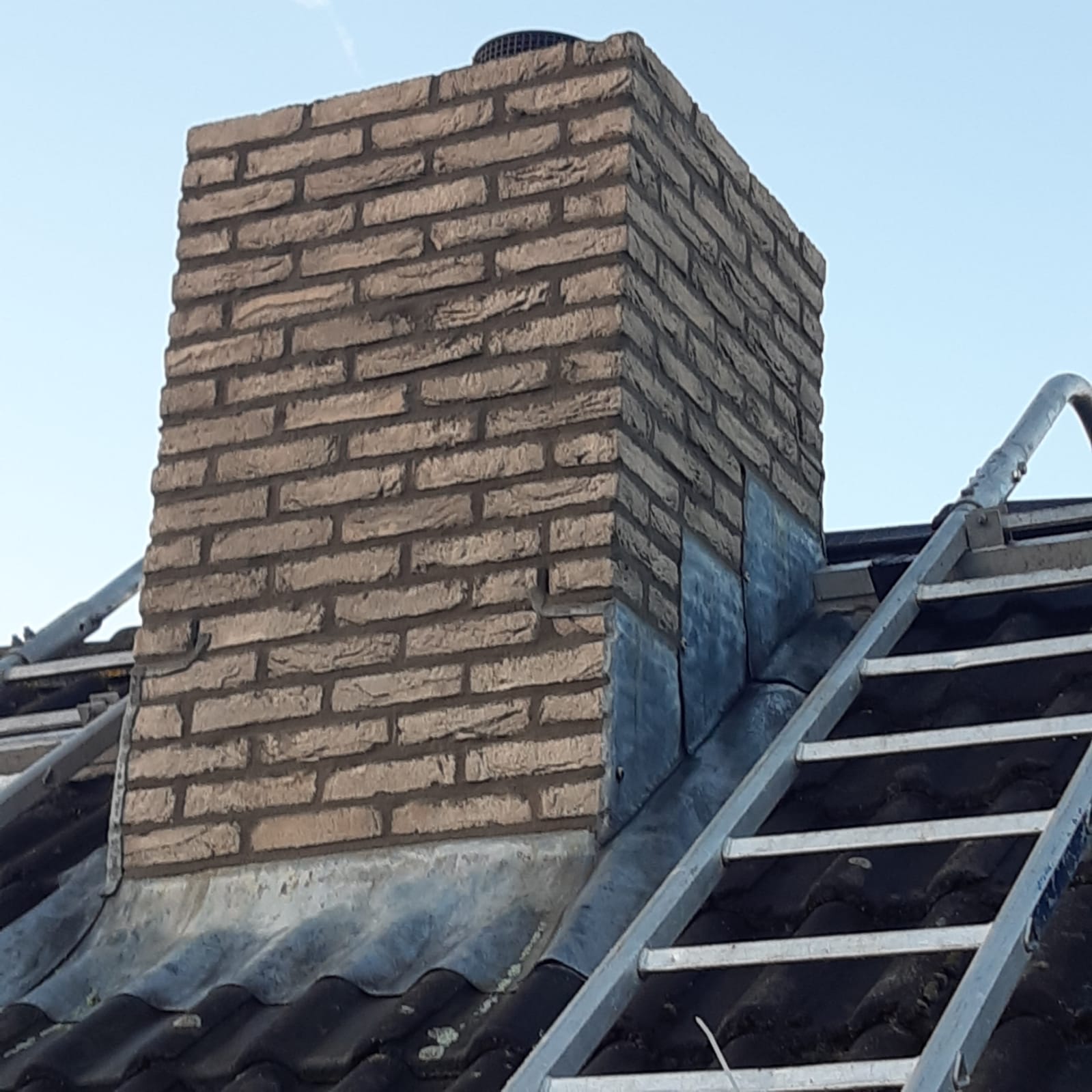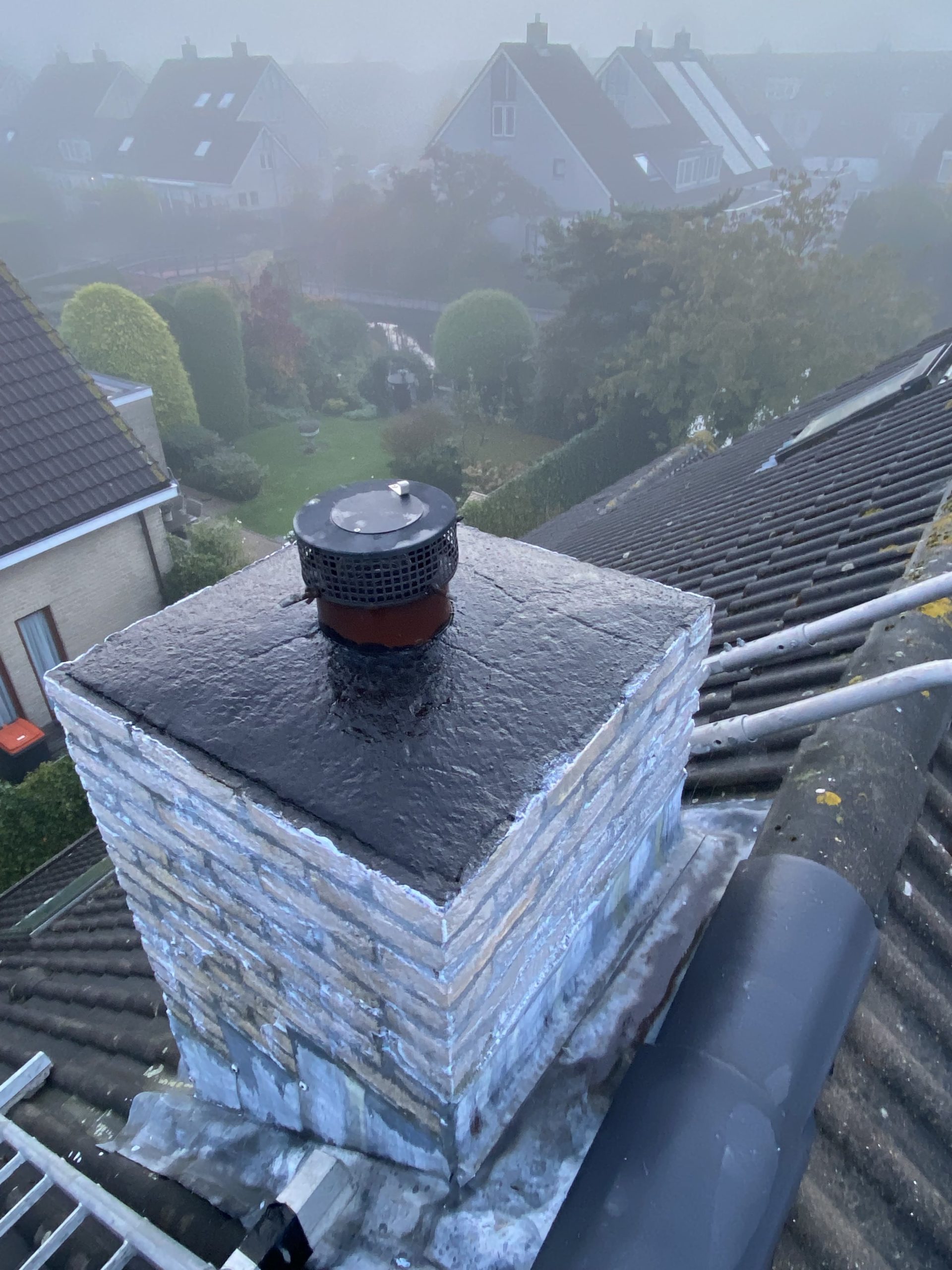 De bovenkant van de schoorsteen wordt meegenomen met het reinigen. (cement deklaag) Mocht deze kapot zijn of beschadigd zijn dan zullen wij dit repareren of vervangen. Naderhand zullen wij de cement deklaag behandelen met fillcoat. Dit is een coating dit voorkomt dat regenkant via de bovenkant van de schoorsteen kan indringen. Het dak wordt na het beëindigen van de werkzaamheden weer schoon opgeleverd, incl. het schoonmaken van de dakgoten.