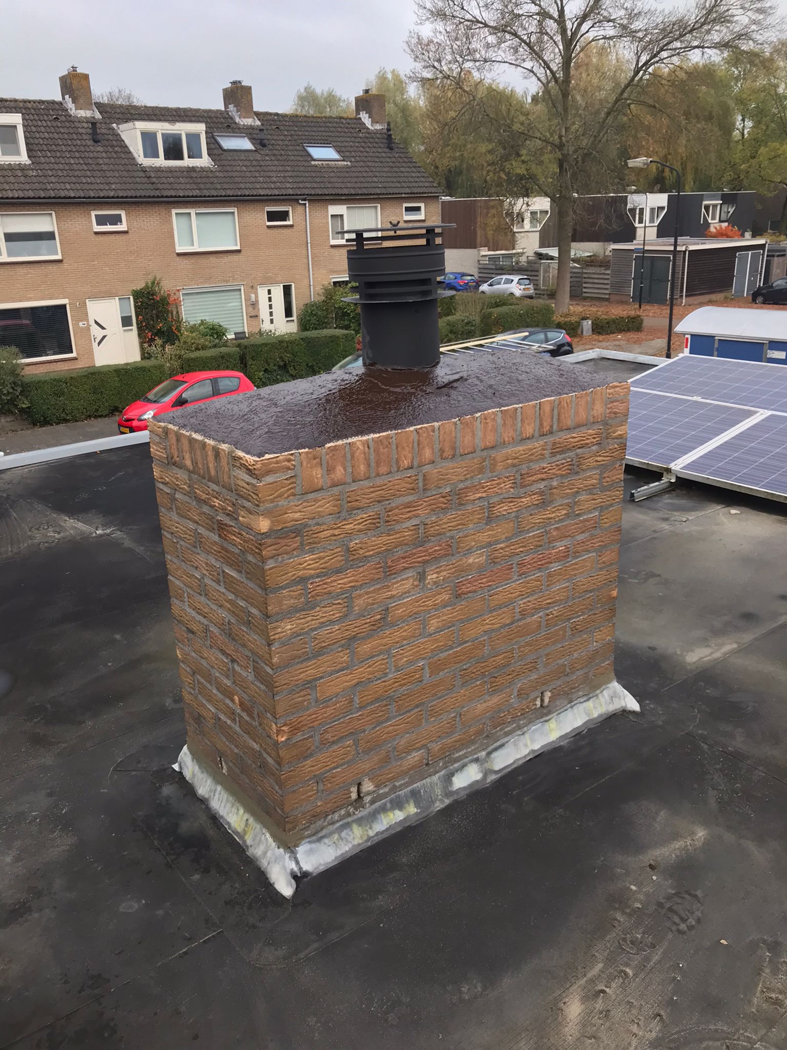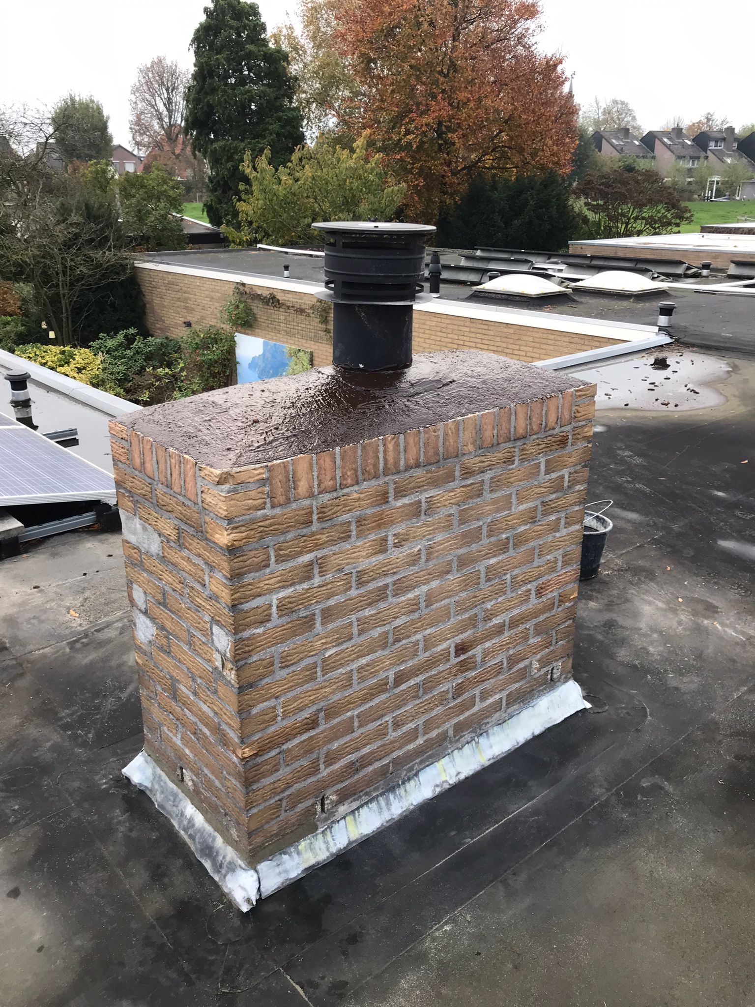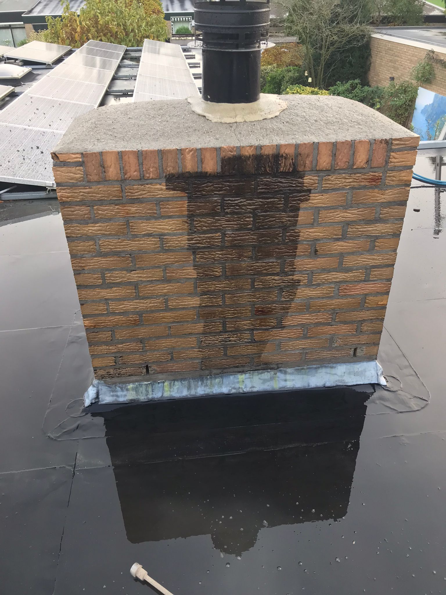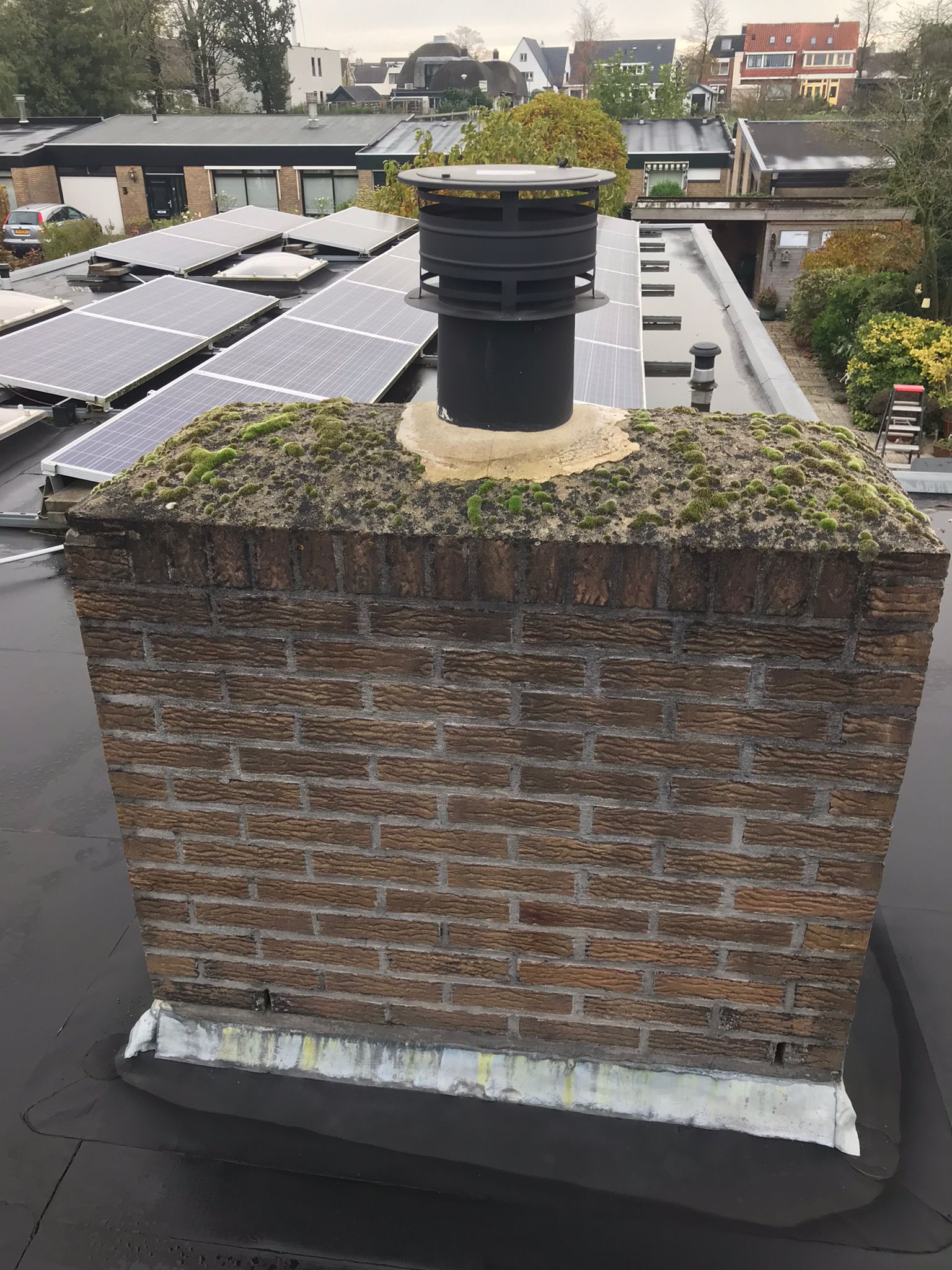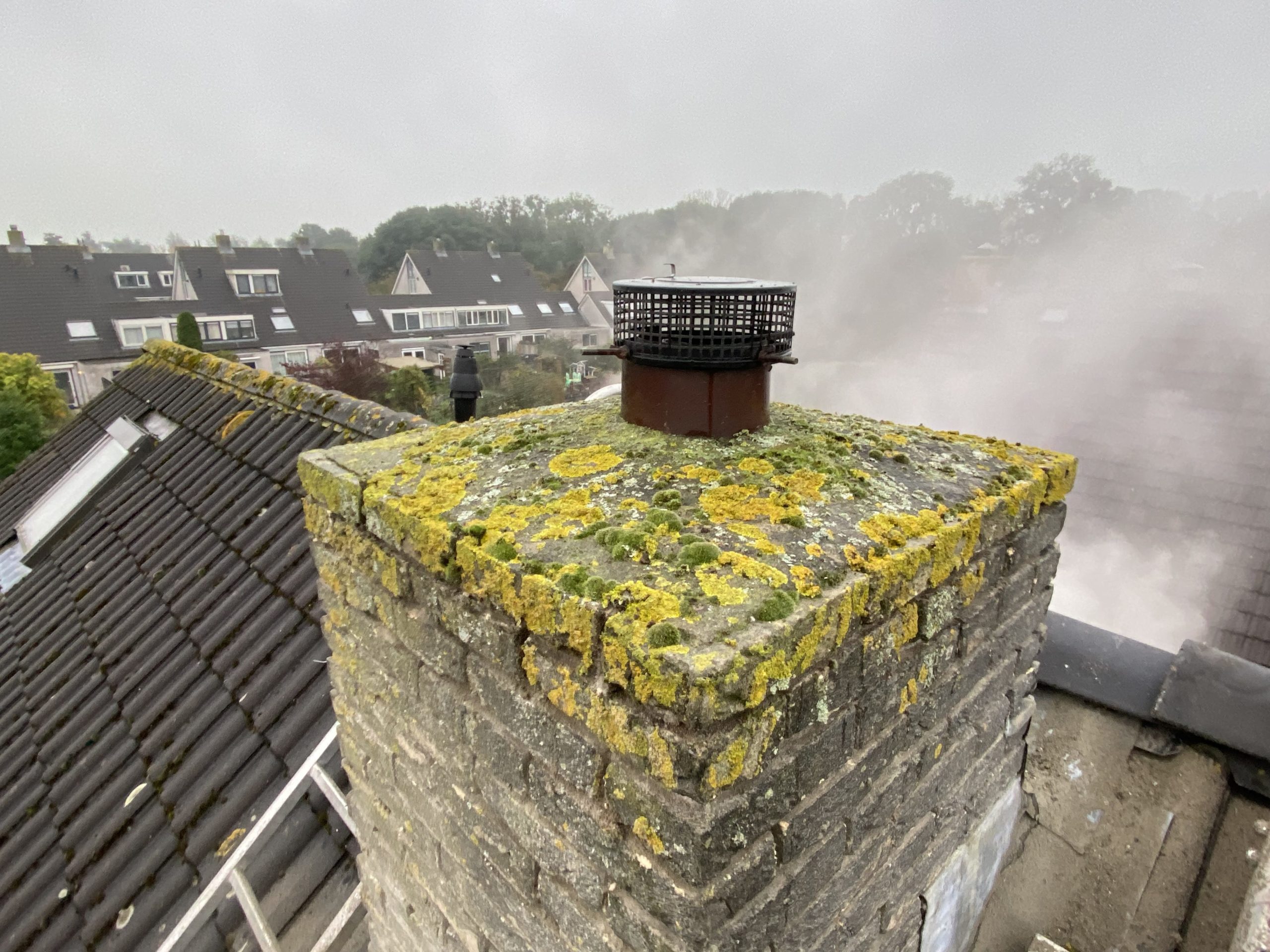 De bovenkant van de schoorsteen wordt meegenomen met het reinigen. (cement deklaag) Mocht deze kapot zijn of beschadigd zijn dan zullen wij dit repareren of vervangen. Naderhand zullen wij de cement deklaag behandelen met fillcoat. Dit is een coating dit voorkomt dat regenkant via de bovenkant van de schoorsteen kan indringen. Het dak wordt na het beëindigen van de werkzaamheden weer schoon opgeleverd, incl. het schoonmaken van de dakgoten.