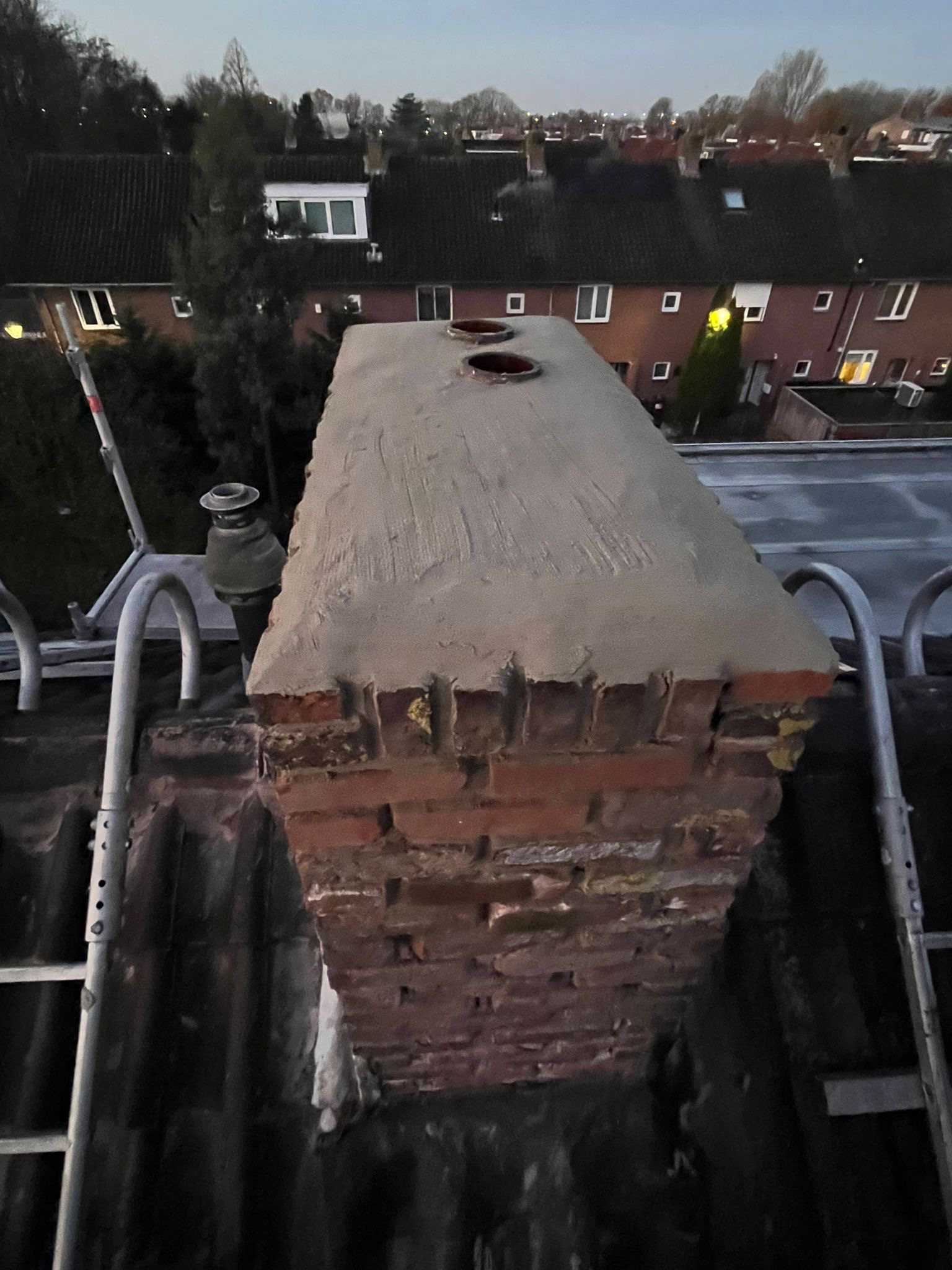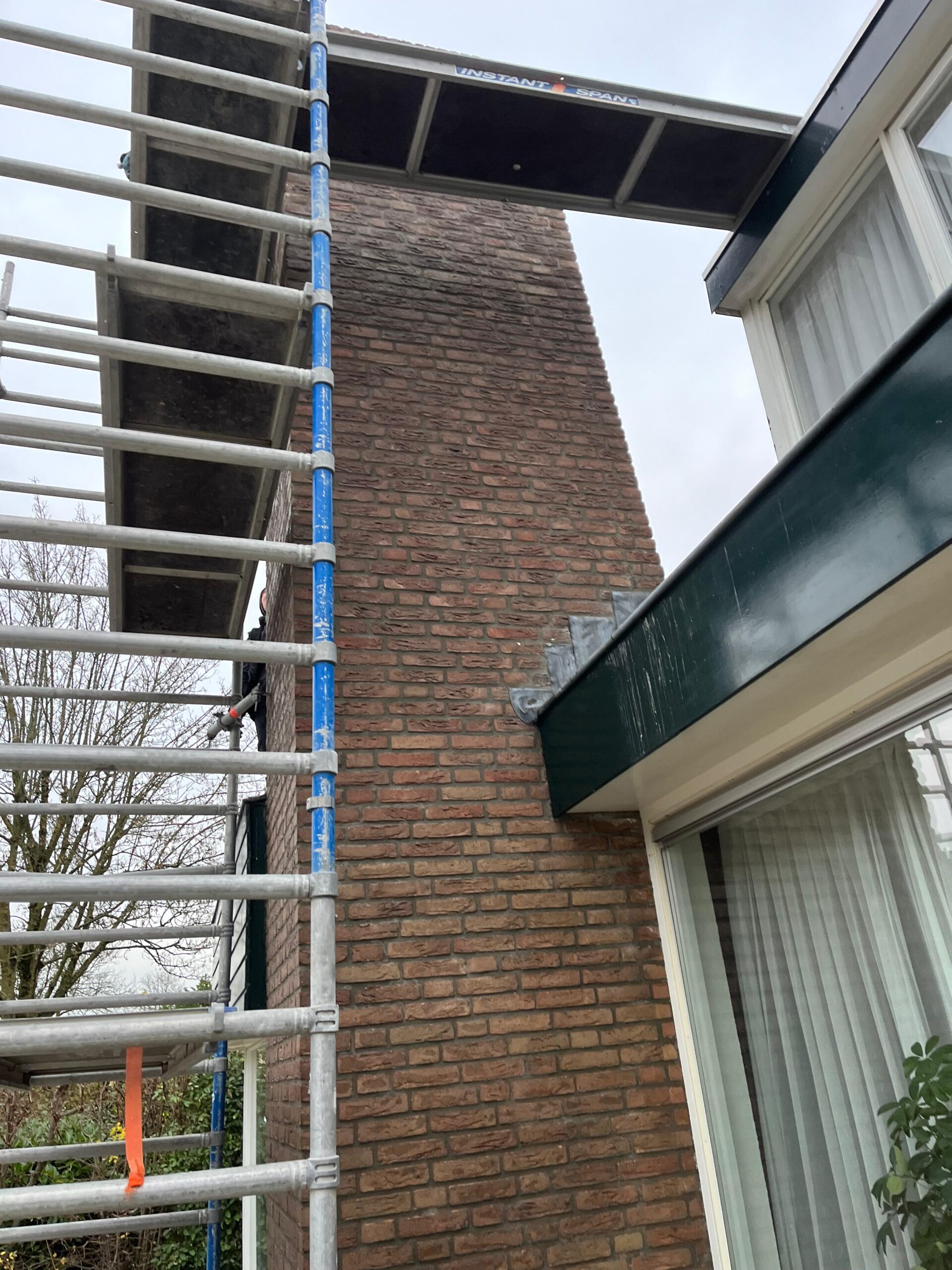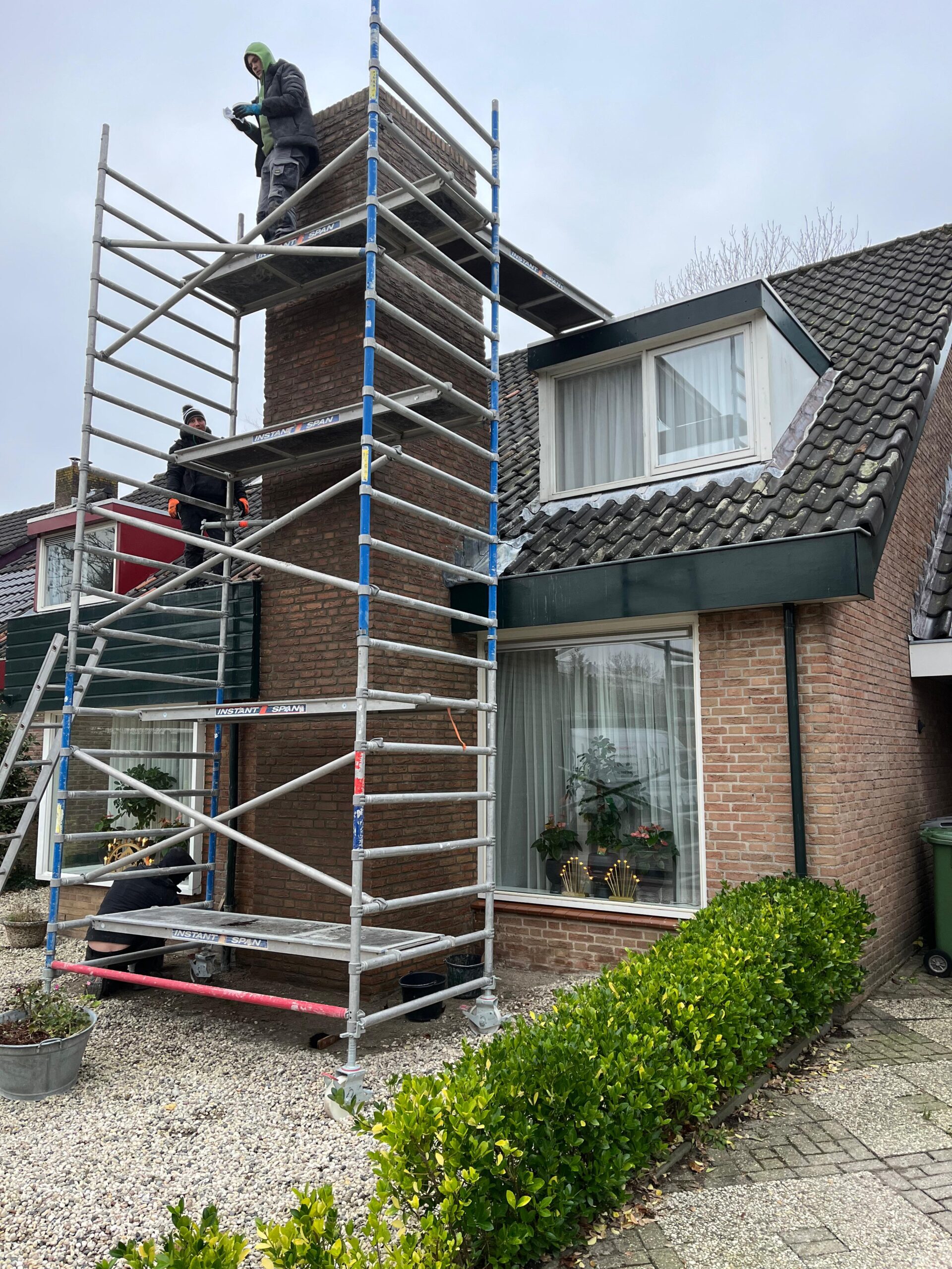 Voor aanvang van de werkzaamheden zullen wij beginnen met het toegankelijk maken van de schoorsteen. Dit wordt gedaan d.m.v. steigers en hangladders zodat wij via deze ladders bij de schoorstenen kunnen komen.