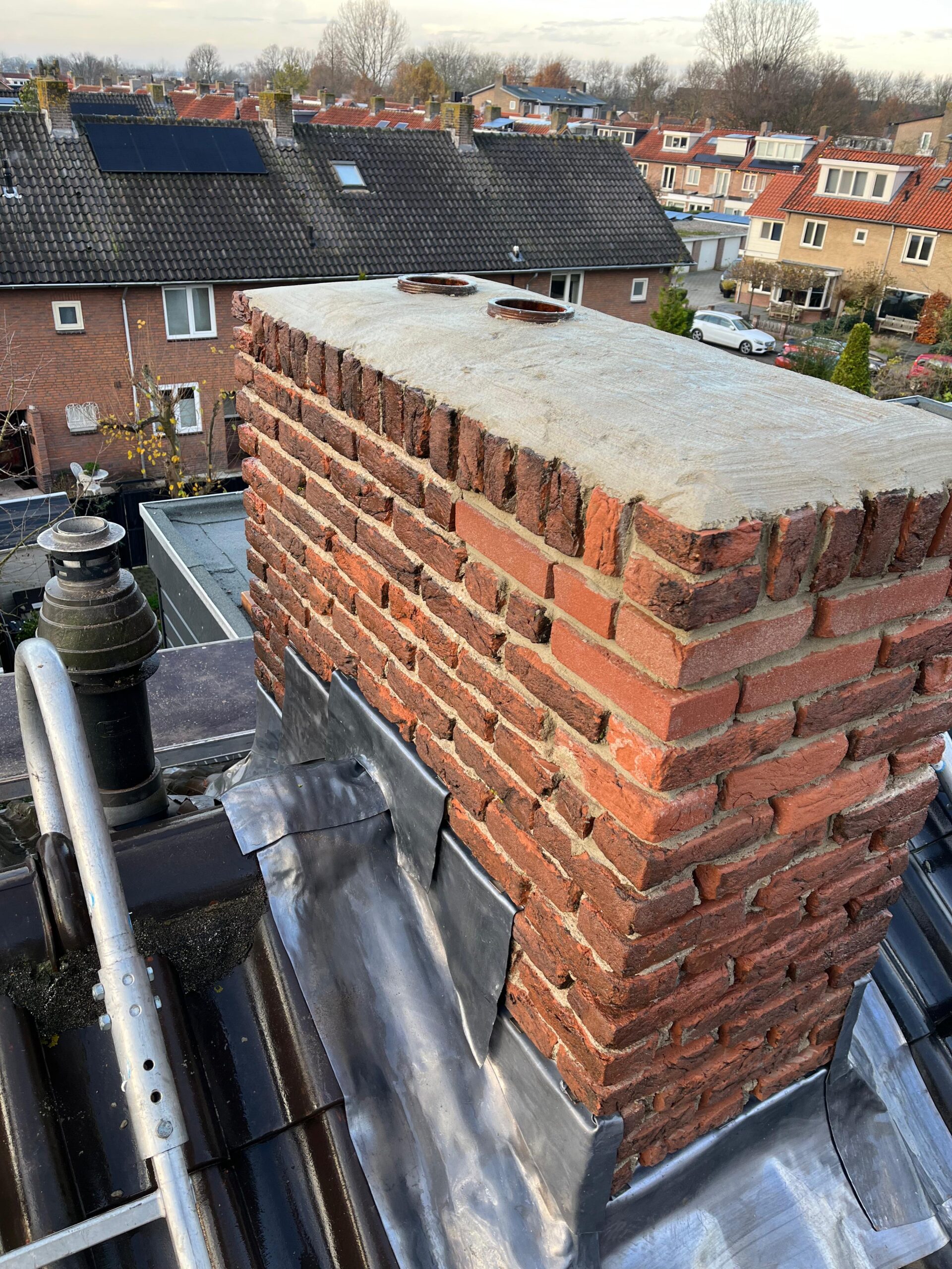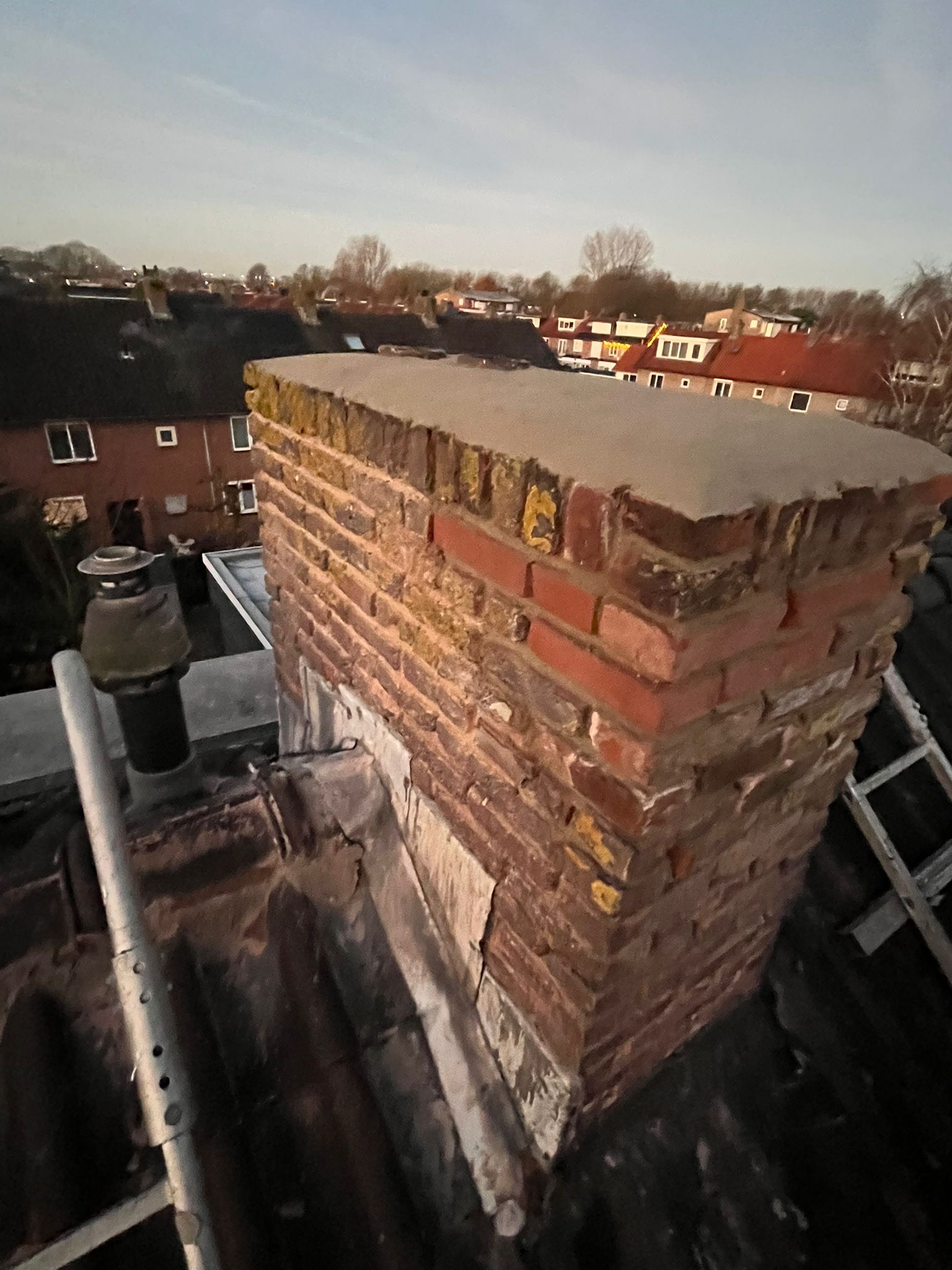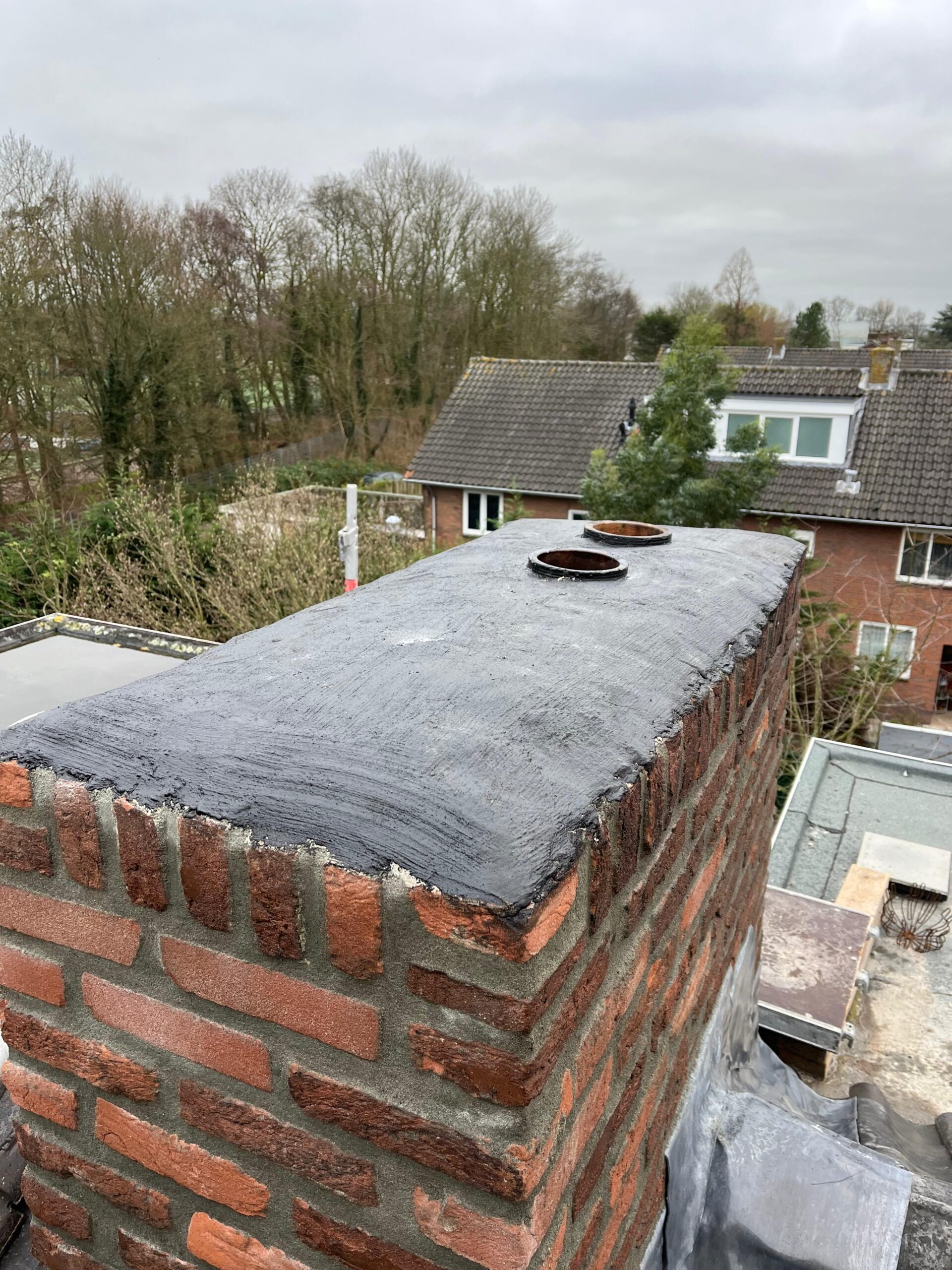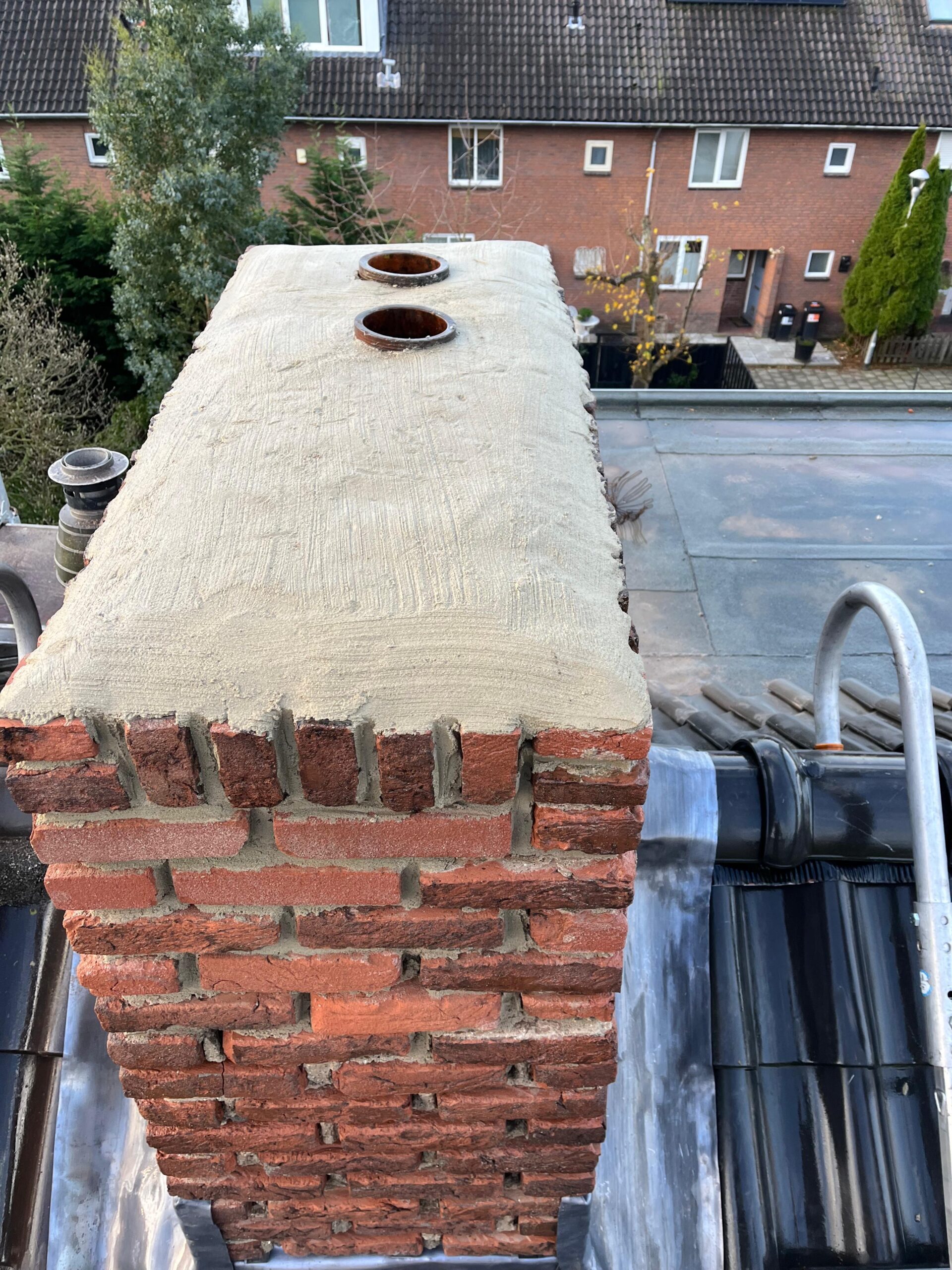 De bovenkant van de schoorsteen wordt meegenomen met het reinigen. (cement deklaag) mocht deze kapot zijn of beschadigd zijn dan zullen wij dit repareren of vervangen. Naderhand zullen wij de cement deklaag behandelen met fillcoat. Dit is een coating dit voorkomt dat regenkant via de bovenkant van de schoorsteen kan indringen. Het dak wordt na het beëindigen van de werkzaamheden weer schoon opgeleverd, incl. het schoonmaken van de dakgoten.