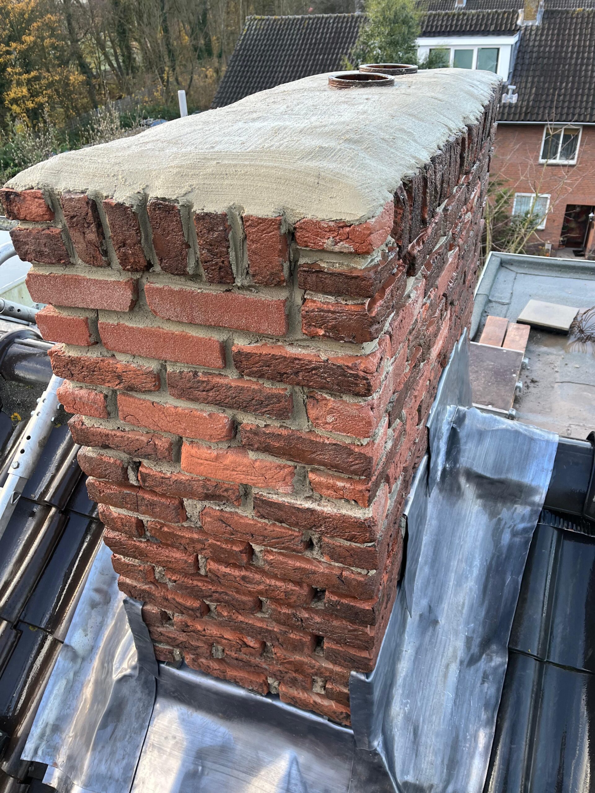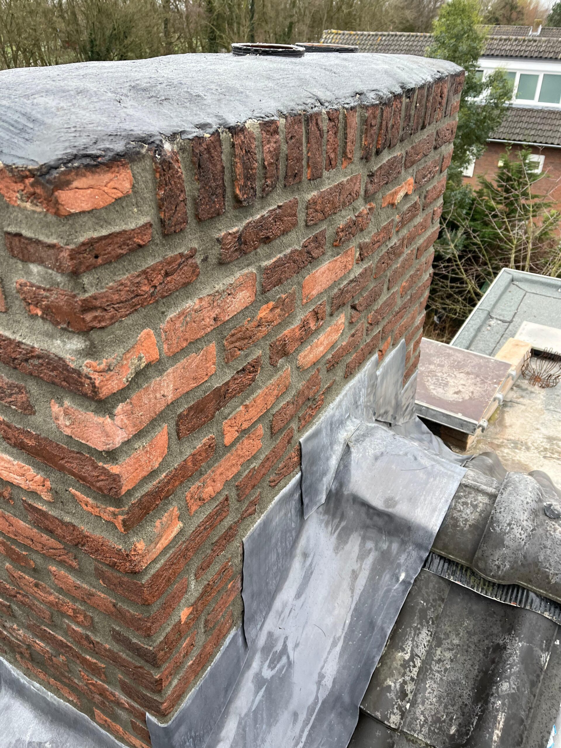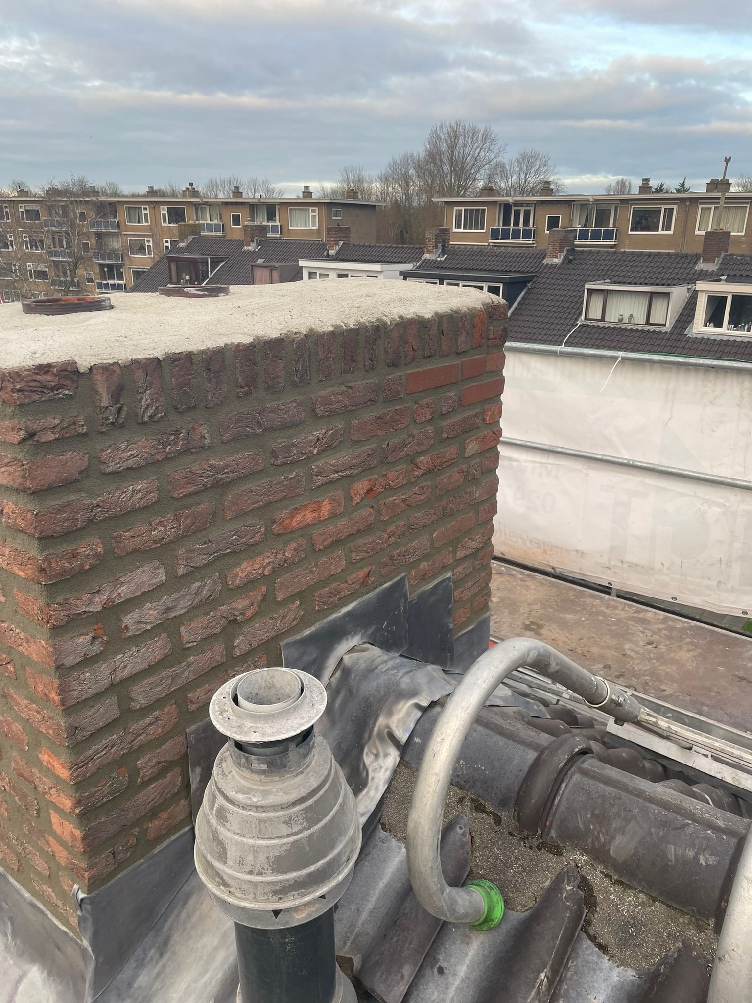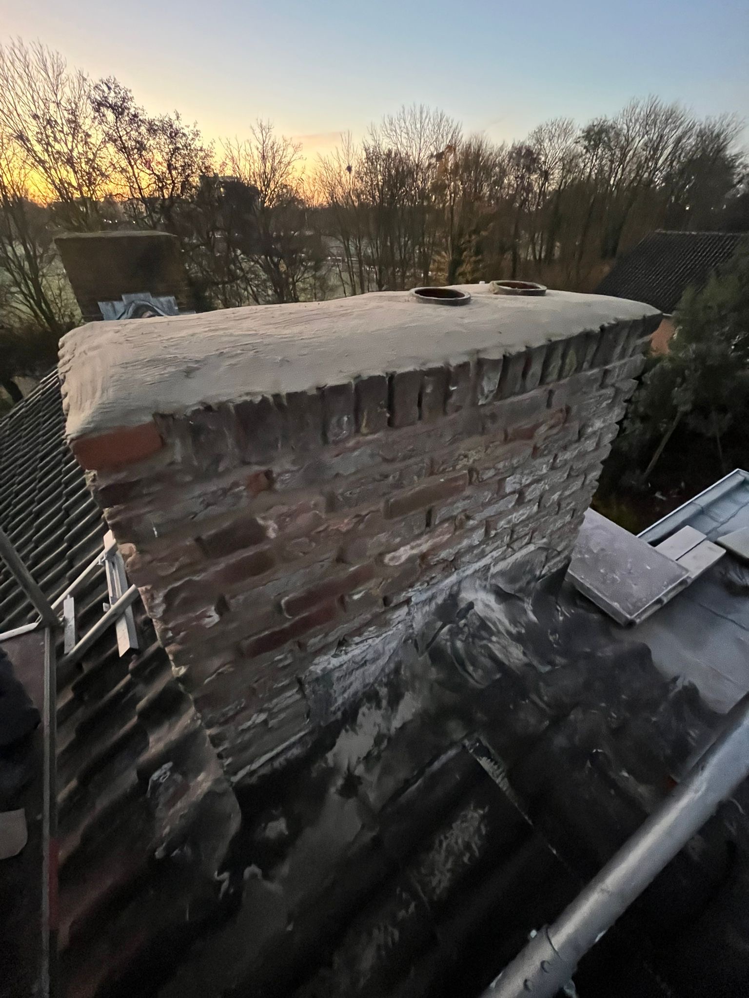 De bovenkant van de schoorsteen wordt meegenomen met het reinigen. (cement deklaag) mocht deze kapot zijn of beschadigd zijn dan zullen wij dit repareren of vervangen. Naderhand zullen wij de cement deklaag behandelen met fillcoat. Dit is een coating dit voorkomt dat regenkant via de bovenkant van de schoorsteen kan indringen. Het dak wordt na het beëindigen van de werkzaamheden weer schoon opgeleverd, incl. het schoonmaken van de dakgoten.