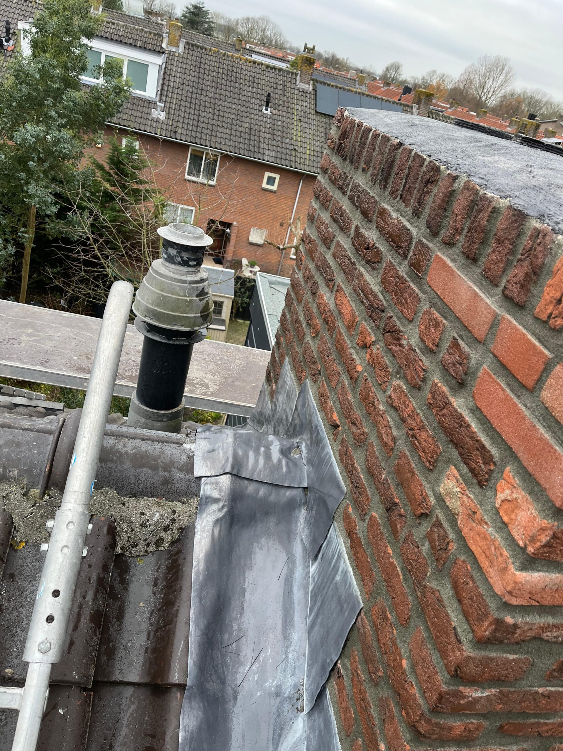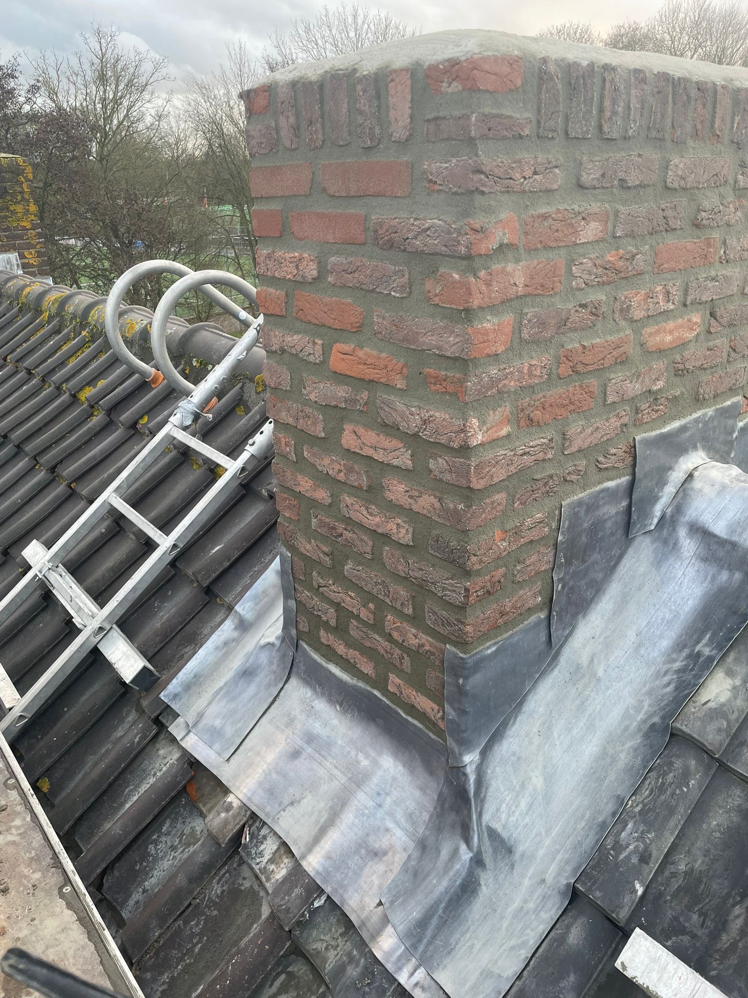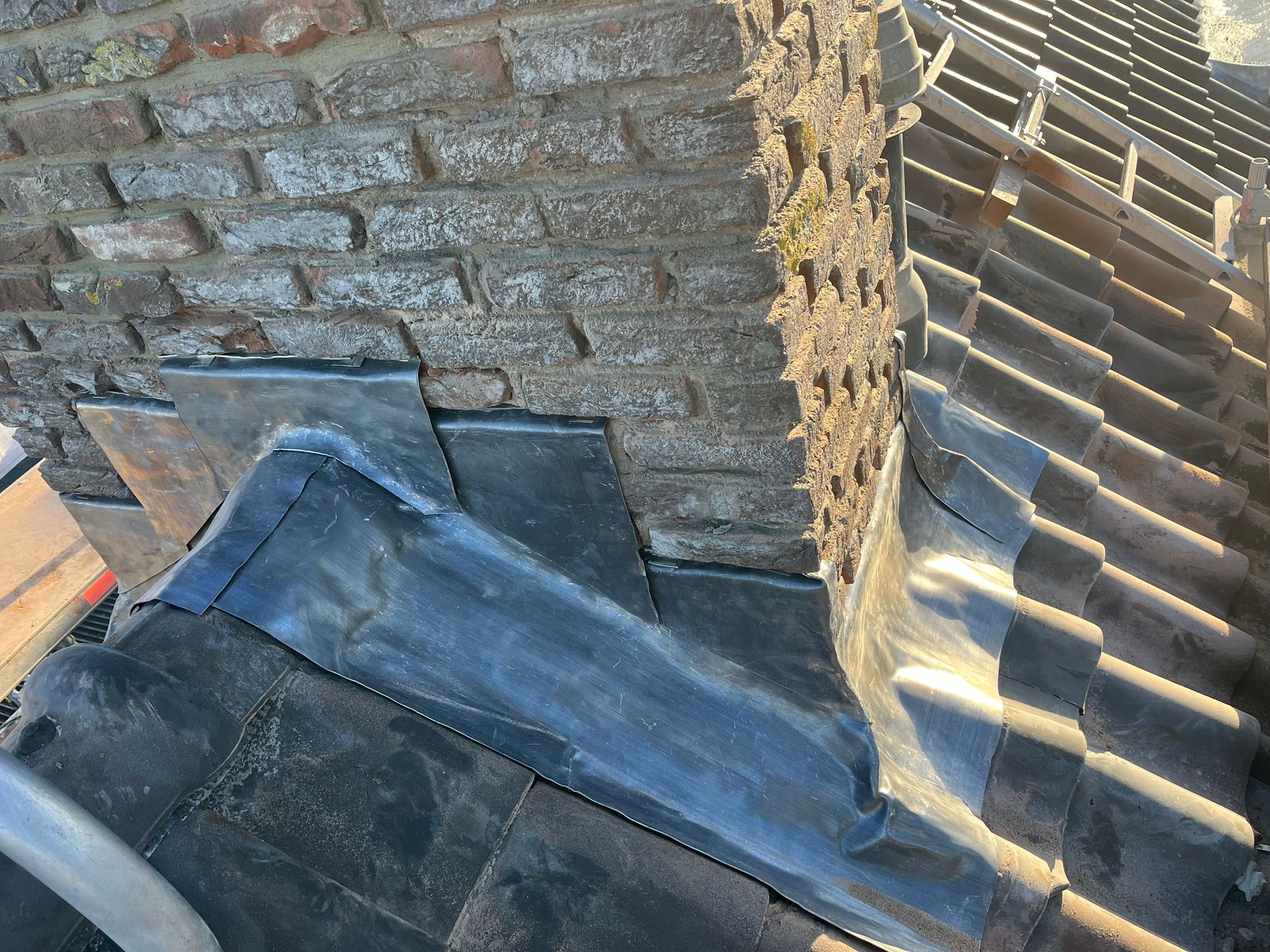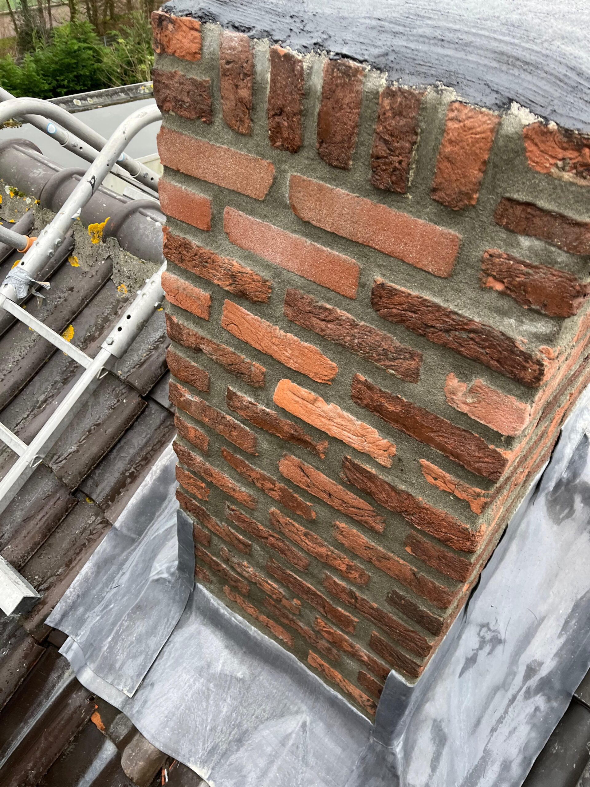 Het lood van de schoorsteen wordt compleet vervangen voor nieuw 18 ponds lood. Het oude bestaande lood wordt verwijderd en afgevoerd, daar waar het nieuw lood komt zullen wij het metselwerk inslijpen tot een diepte van ongeveer 30 a 35 mm. De ondergrond zullen wij stofvrij maken, nu kan het nieuwe lood worden aangebracht. Het lood wordt in de gevel vastgezet met loodklemmen. Als het lood is aanbracht wordt de schoorsteen gevoegd.