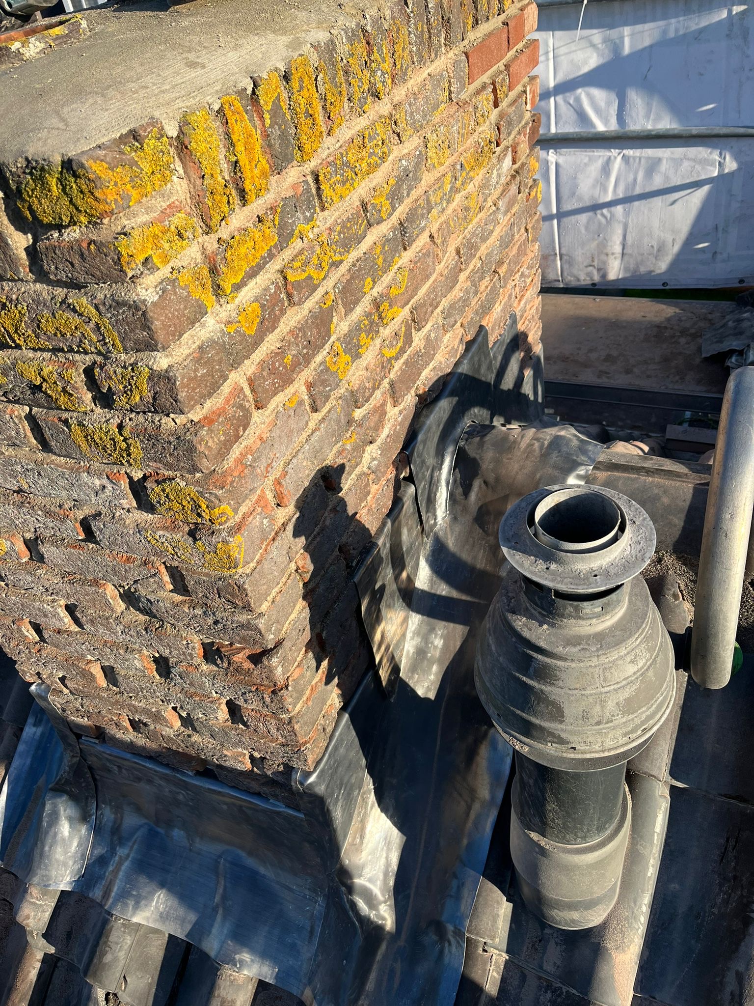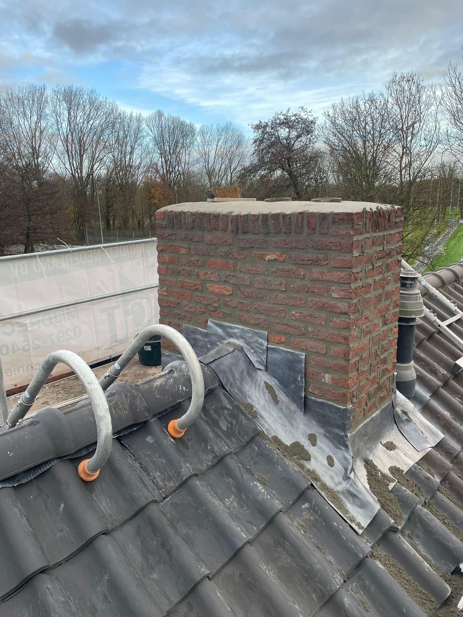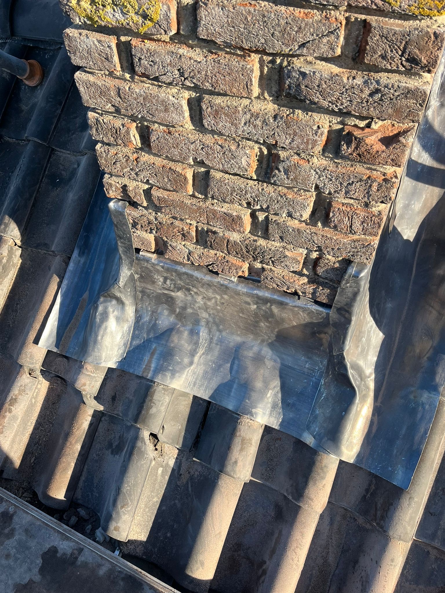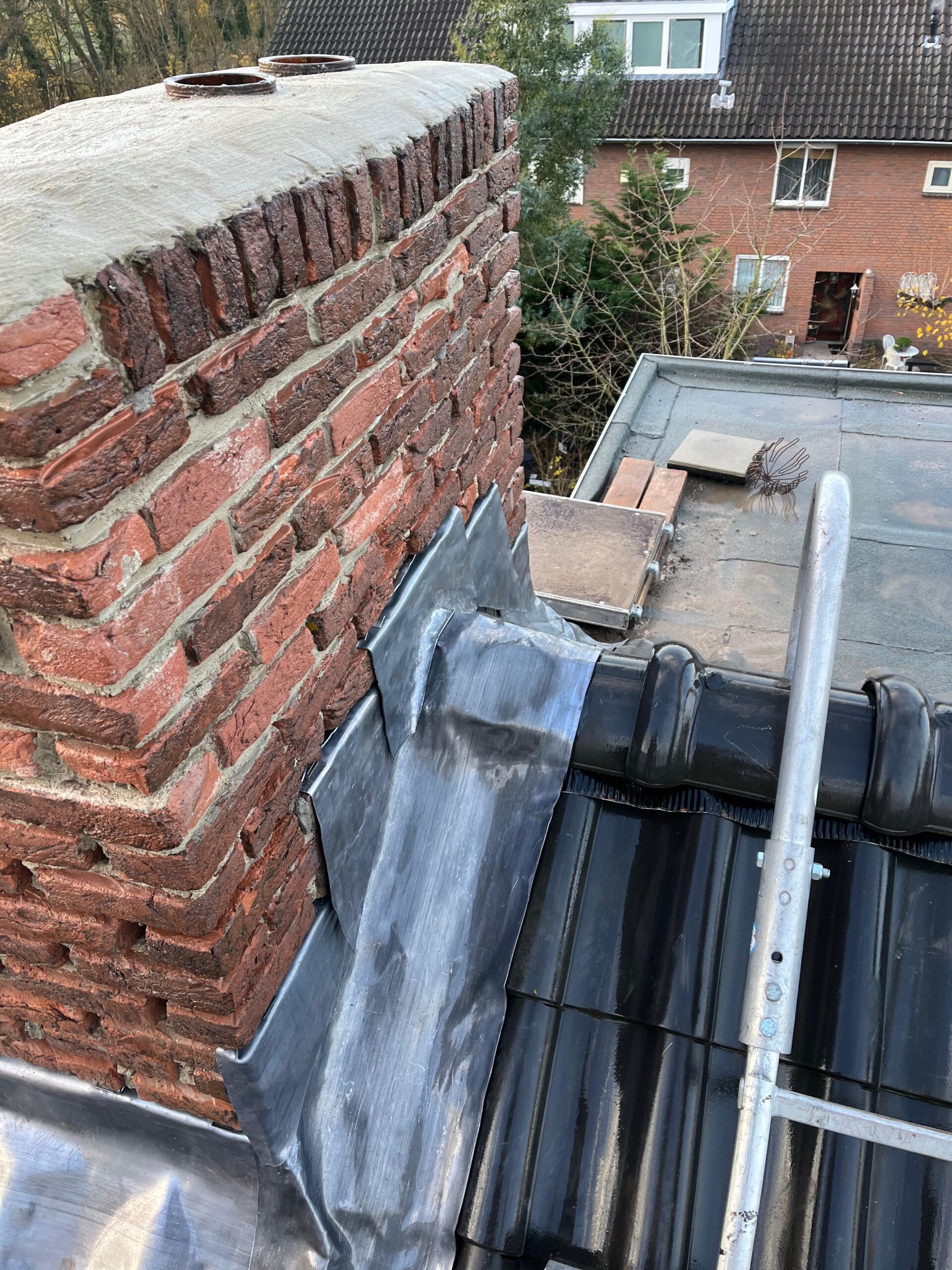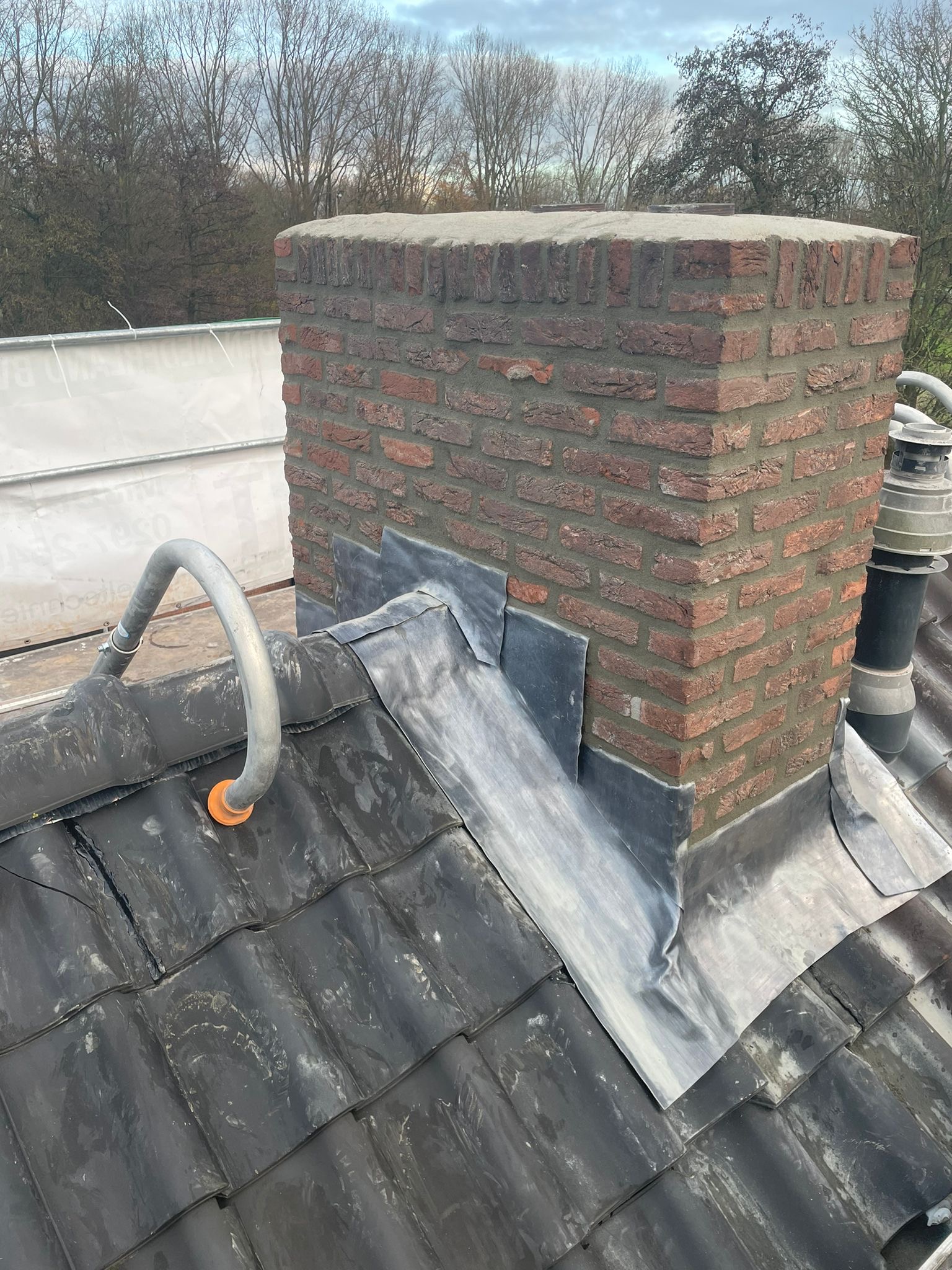 Het lood van de schoorsteen wordt compleet vervangen voor nieuw 18 ponds lood. Het oude bestaande lood wordt verwijderd en afgevoerd, daar waar het nieuw lood komt zullen wij het metselwerk inslijpen tot een diepte van ongeveer 30 a 35 mm. De ondergrond zullen wij stofvrij maken, nu kan het nieuwe lood worden aangebracht. Het lood wordt in de gevel vastgezet met loodklemmen. Als het lood is aanbracht wordt de schoorsteen gevoegd.