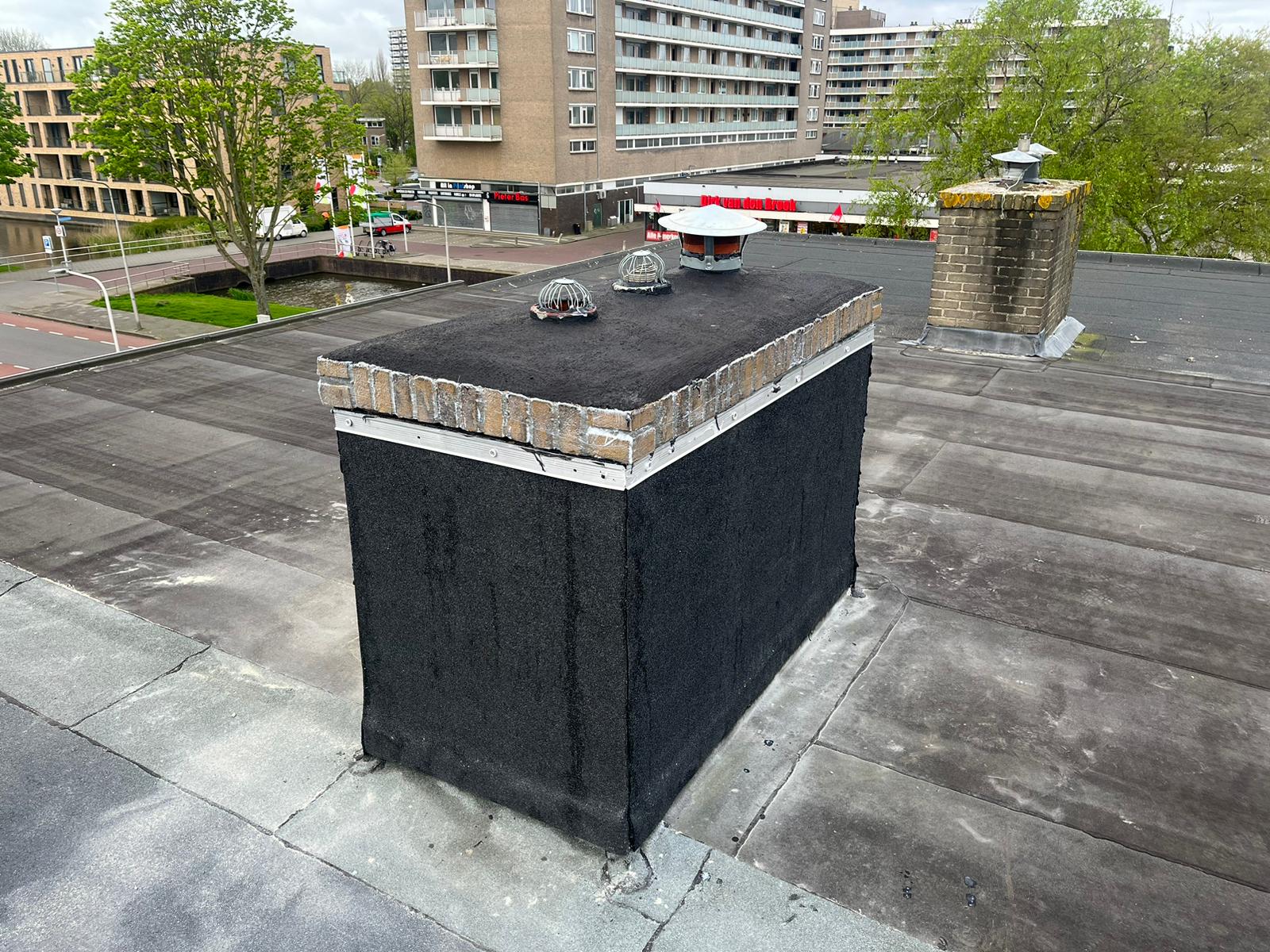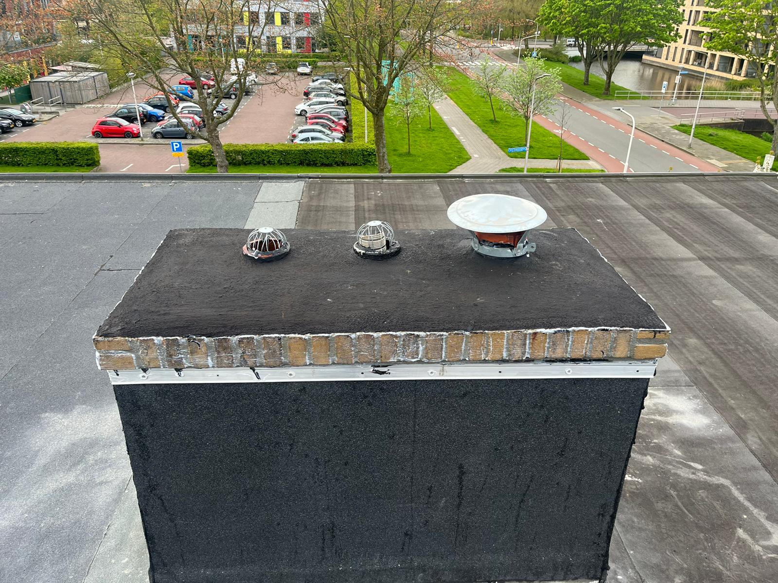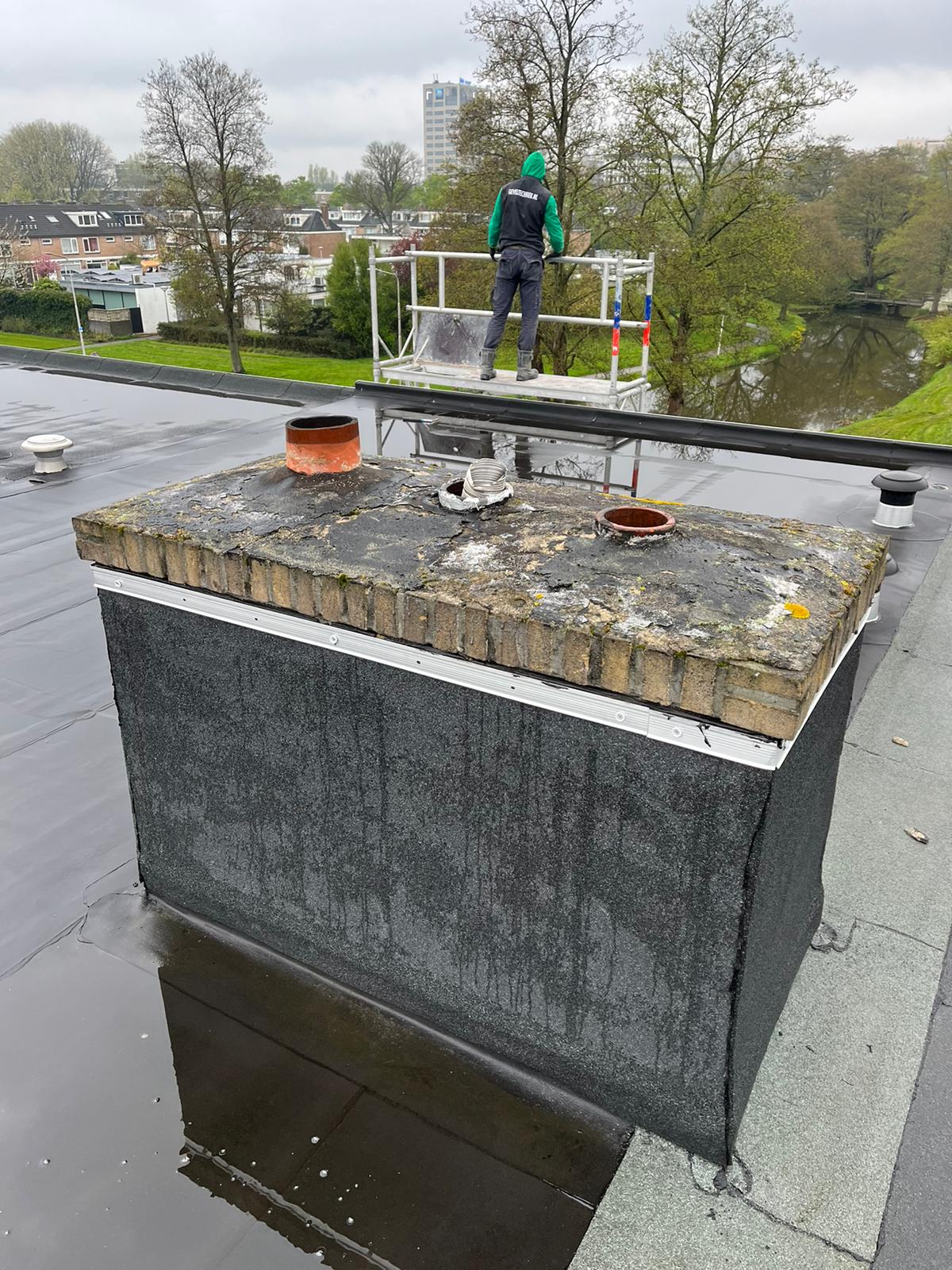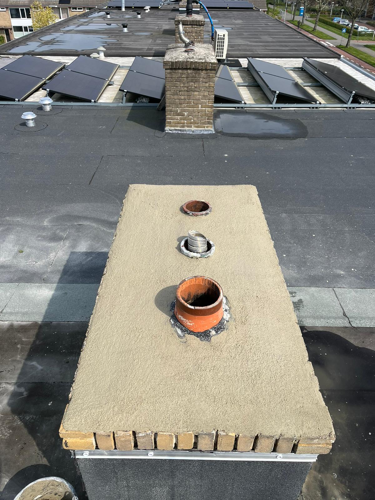 De bovenkant van de schoorsteen wordt meegenomen met het reinigen. (cement deklaag) Mocht deze kapot zijn of beschadigd zijn dan zullen wij dit repareren of vervangen. Naderhand zullen wij de cement deklaag behandelen met fillcoat. Dit is een coating dit voorkomt dat regenkant via de bovenkant van de schoorsteen kan indringen. Het dak wordt na het beëindigen van de werkzaamheden weer schoon opgeleverd, incl. het schoonmaken van de dakgoten.