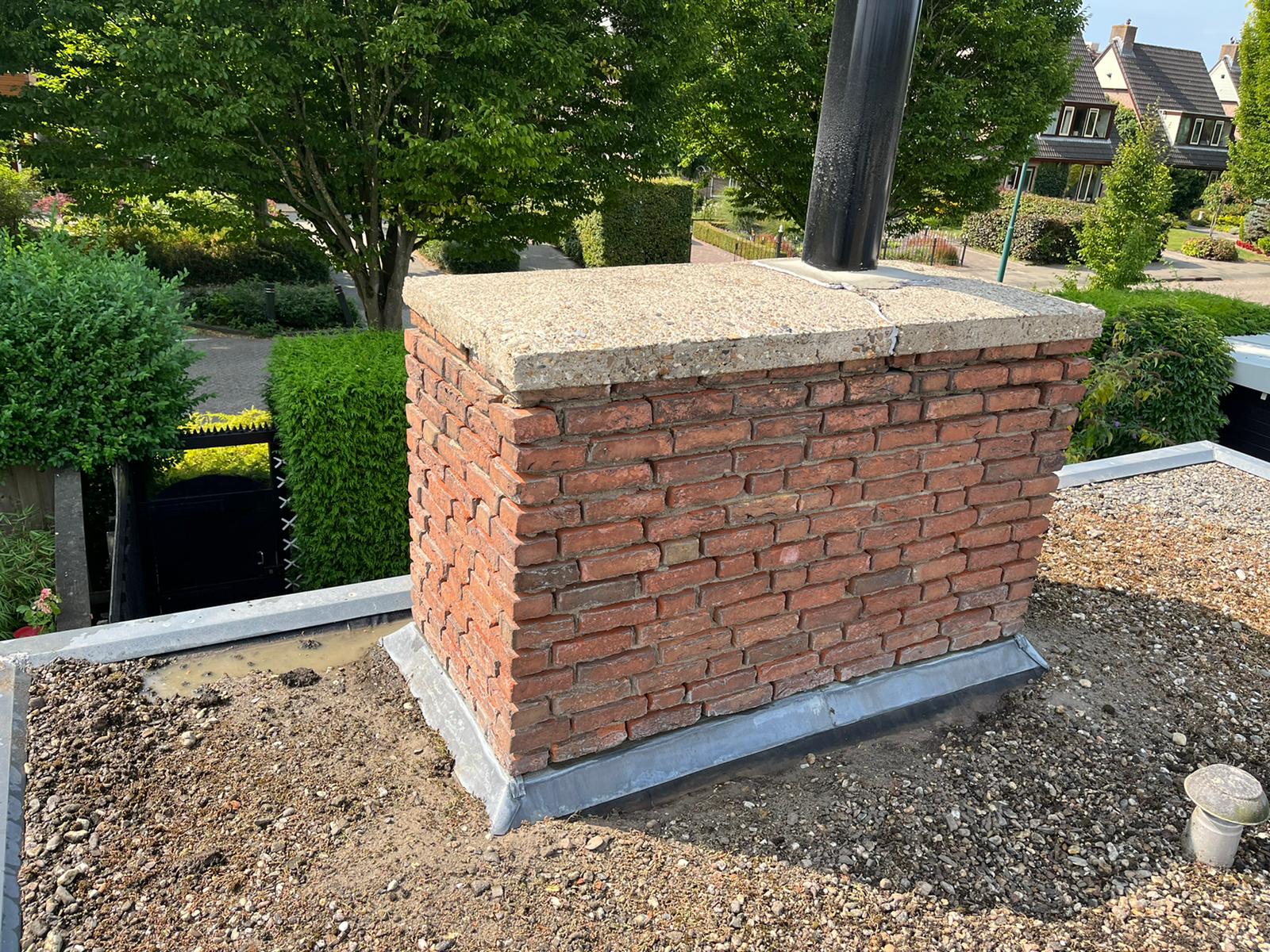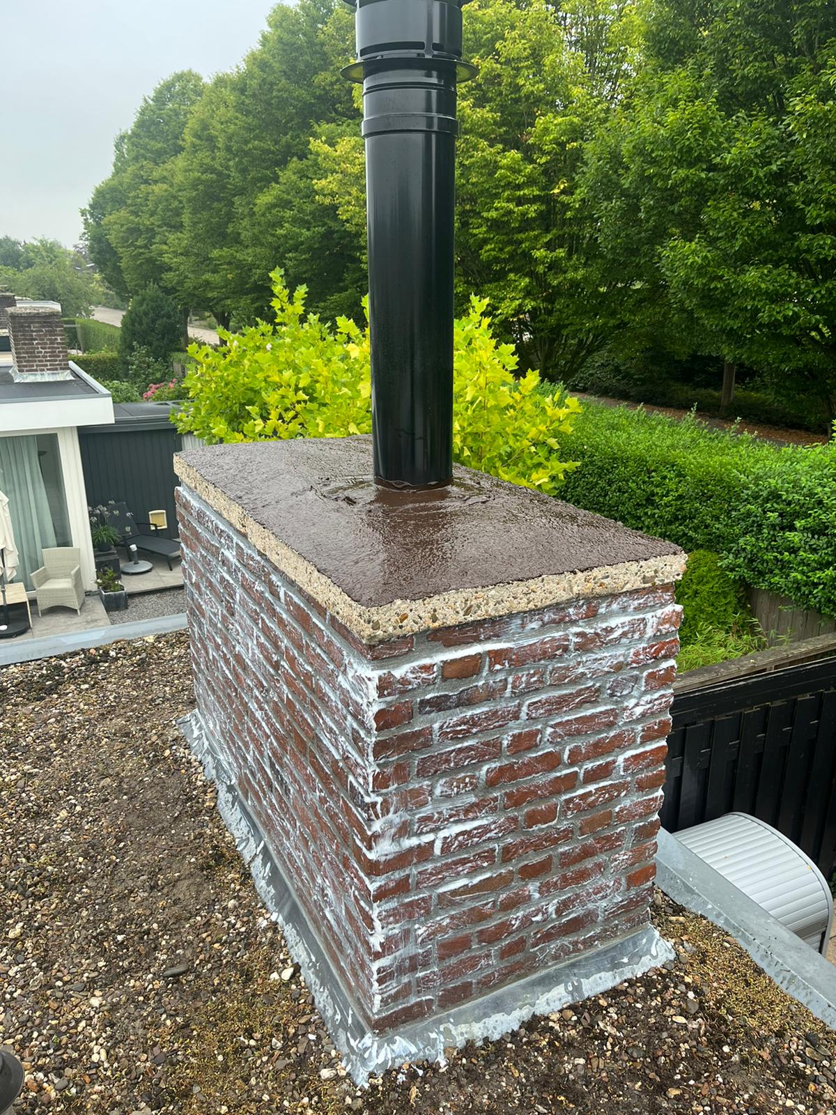 De bovenkant van de schoorsteen wordt meegenomen met het reinigen. (cement deklaag) Mocht deze kapot zijn of beschadigd zijn dan zullen wij dit repareren of vervangen. Naderhand zullen wij de cement deklaag behandelen met fillcoat. Dit is een coating dit voorkomt dat regenkant via de bovenkant van de schoorsteen kan indringen. Het dak wordt na het beëindigen van de werkzaamheden weer schoon opgeleverd, incl. het schoonmaken van de dakgoten.