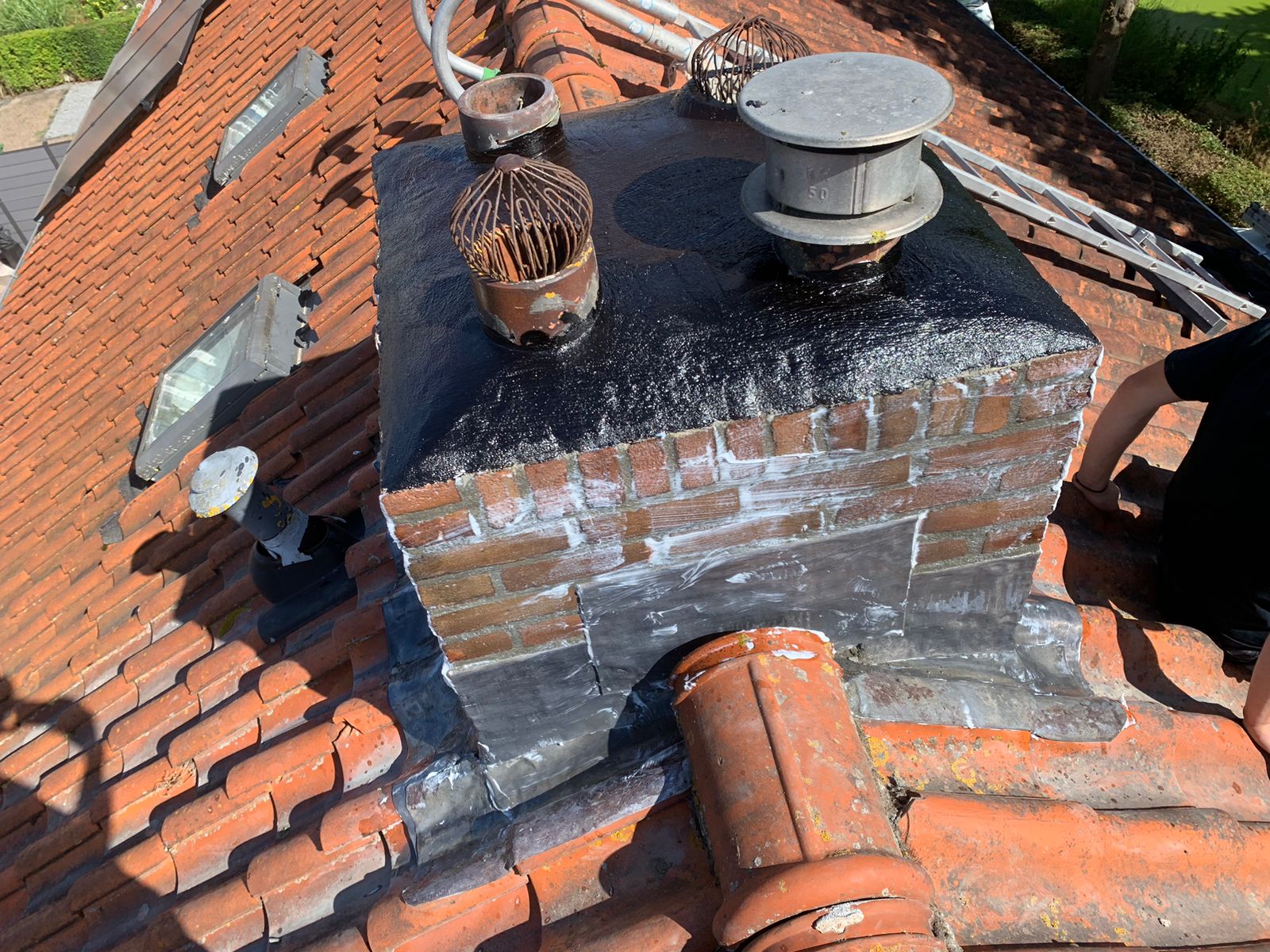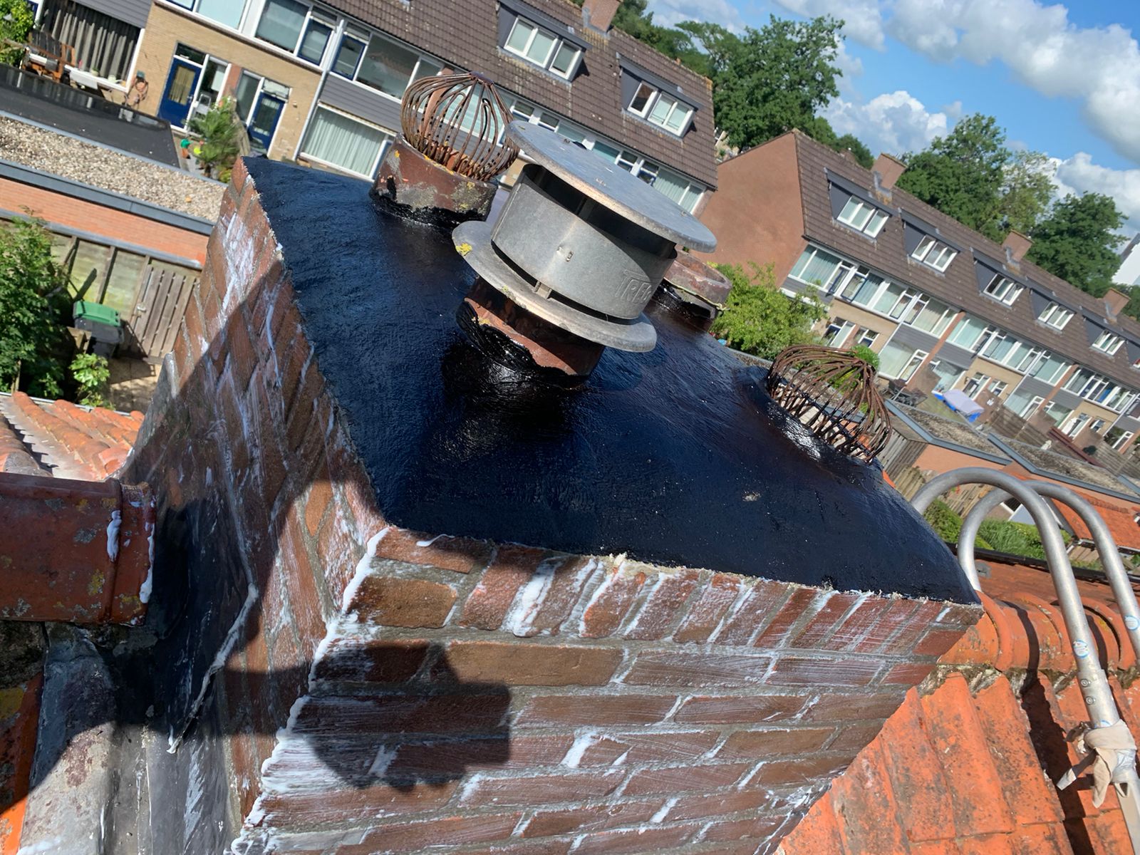 De bovenkant van de schoorsteen wordt meegenomen met het reinigen. (cement deklaag) mocht deze kapot zijn of beschadigd zijn dan zullen wij dit repareren of vervangen. Naderhand zullen wij de cement deklaag behandelen met fillcoat. Dit is een coating dit voorkomt dat regenkant via de bovenkant van de schoorsteen kan indringen. Het dak wordt na het beëindigen van de werkzaamheden weer schoon opgeleverd, incl. het schoonmaken van de dakgoten.