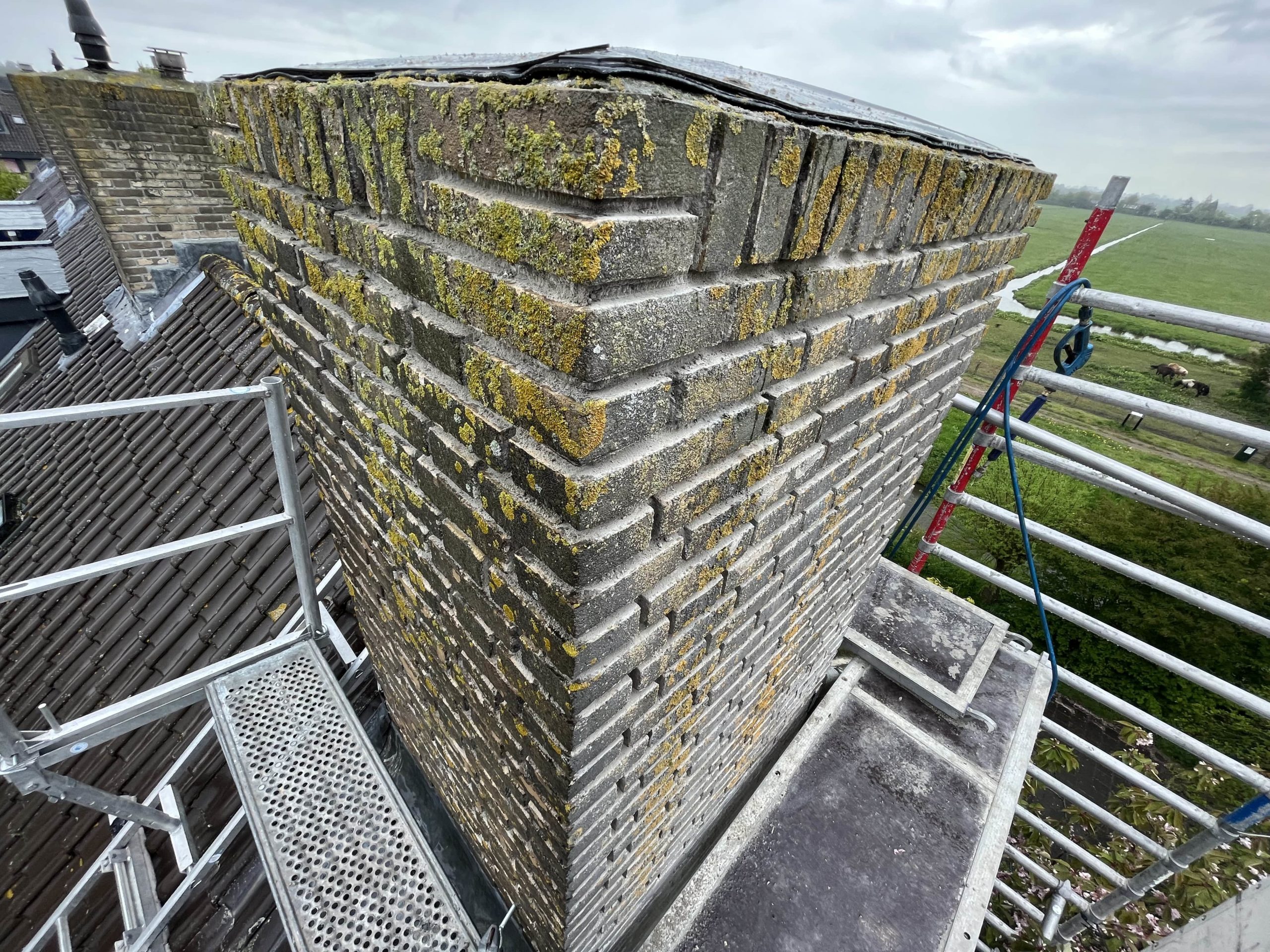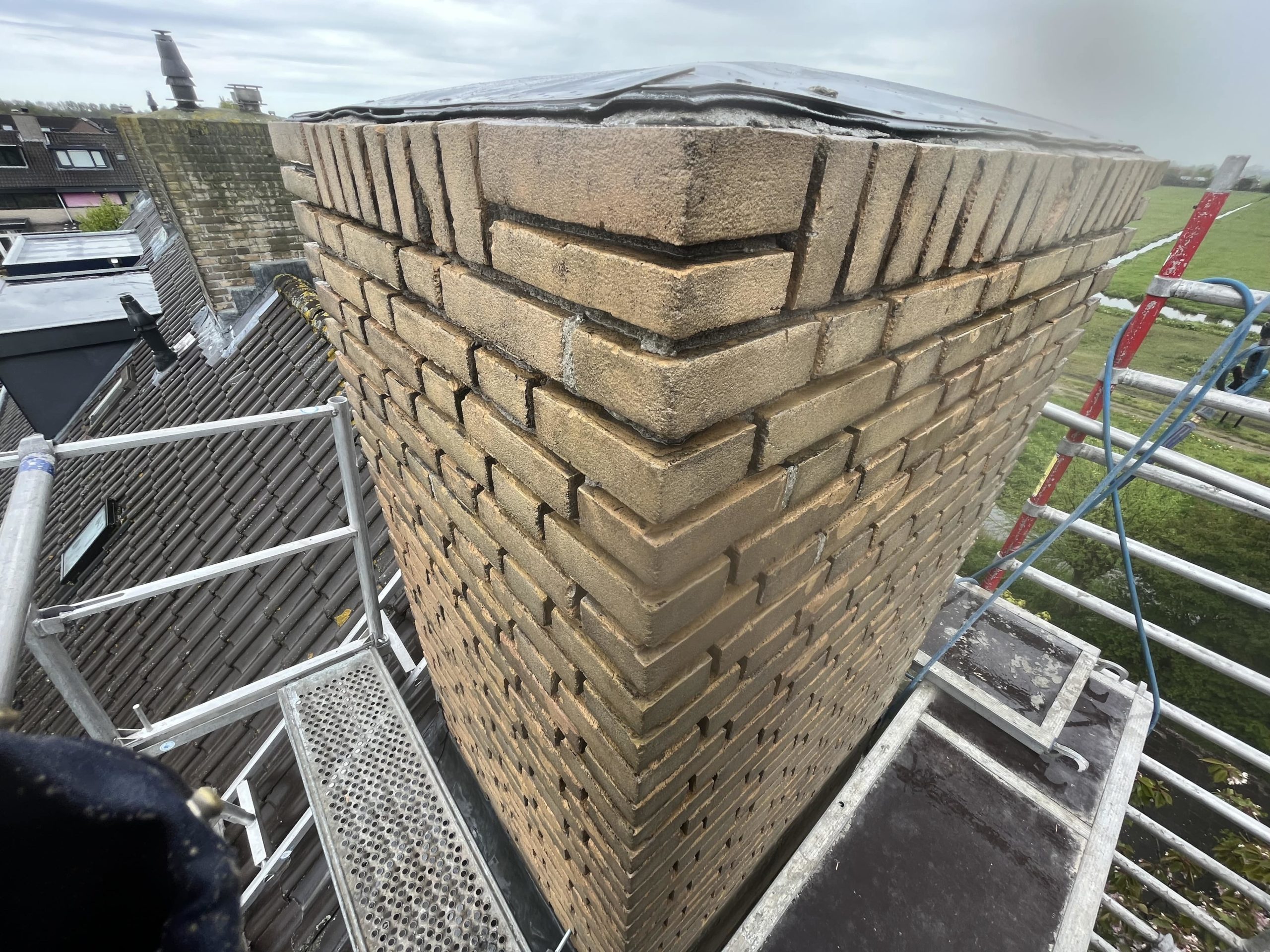 Het bestaande voegwerk van de schoorsteen wordt door ons verwijderd. Het voegwerk wordt met behulp van pneumatische hakhamers en elektrische slijptollen uitgehakt tot een diepte van minimaal 10 mm of tot aan de metselmortel. Na het uithakken/slijpen van het bestaande voegwerk wordt de schoorsteen gereinigd.