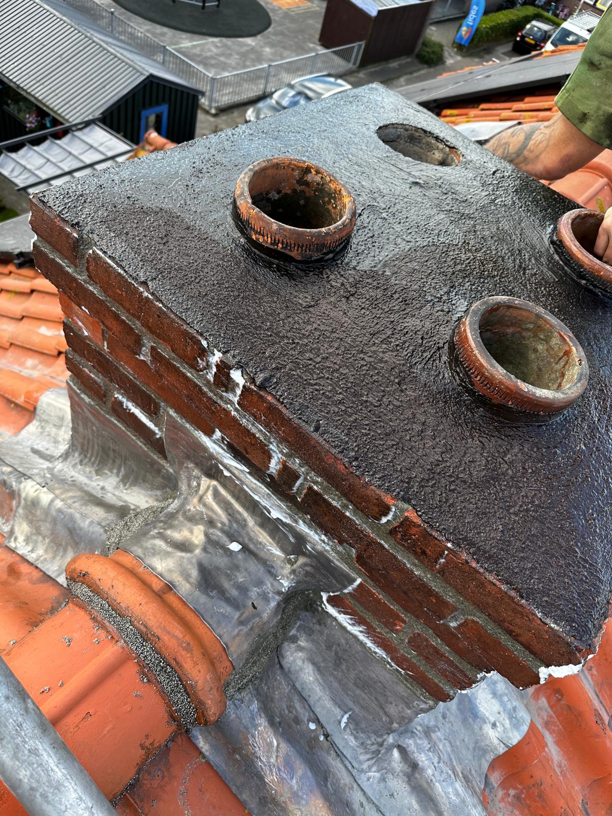 De bovenkant van de schoorsteen wordt meegenomen met het reinigen. (cement deklaag) mocht deze kapot zijn of beschadigd zijn dan zullen wij dit repareren of vervangen. Naderhand zullen wij de cement deklaag behandelen met fillcoat. Dit is een coating dit voorkomt dat regenkant via de bovenkant van de schoorsteen kan indringen. Het dak wordt na het beëindigen van de werkzaamheden weer schoon opgeleverd, incl. het schoonmaken van de dakgoten.
