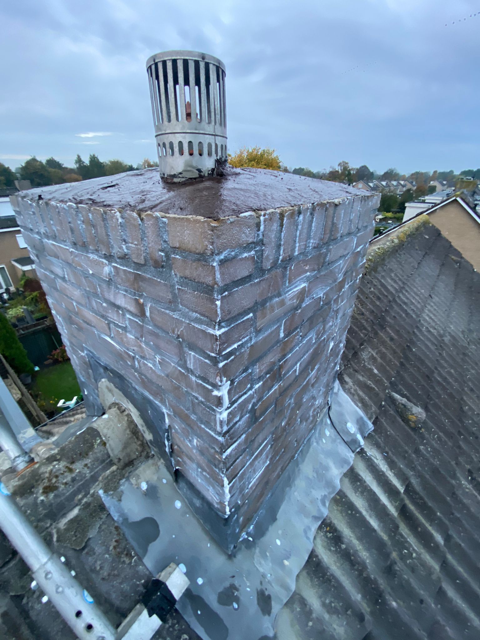 De bovenkant van de schoorsteen wordt meegenomen met het reinigen. (cement deklaag) Mocht deze kapot zijn of beschadigd zijn dan zullen wij dit repareren of vervangen. Naderhand zullen wij de cement deklaag behandelen met fillcoat. Dit is een coating dit voorkomt dat regenkant via de bovenkant van de schoorsteen kan indringen. Het dak wordt na het beëindigen van de werkzaamheden weer schoon opgeleverd, incl. het schoonmaken van de dakgoten.