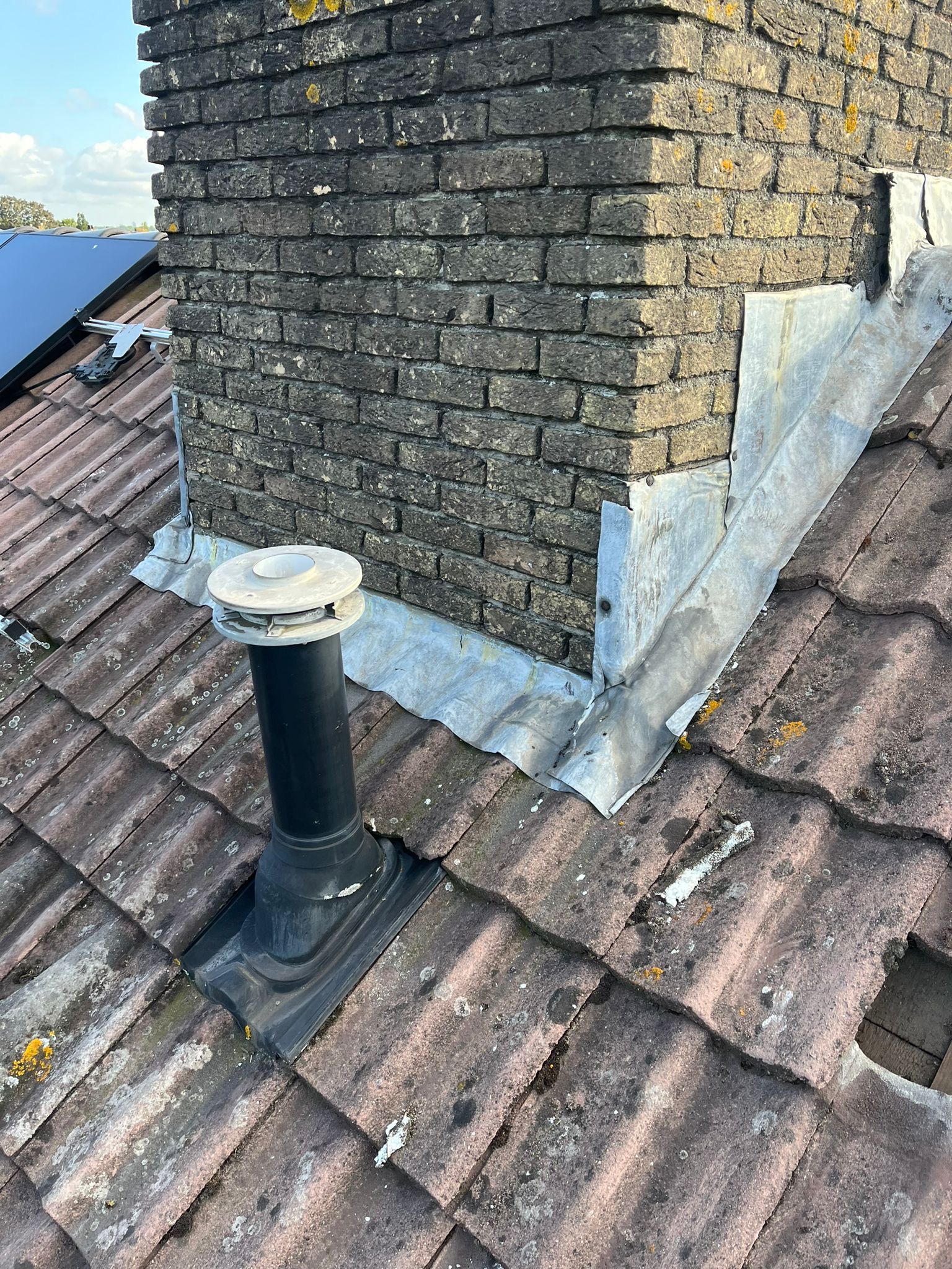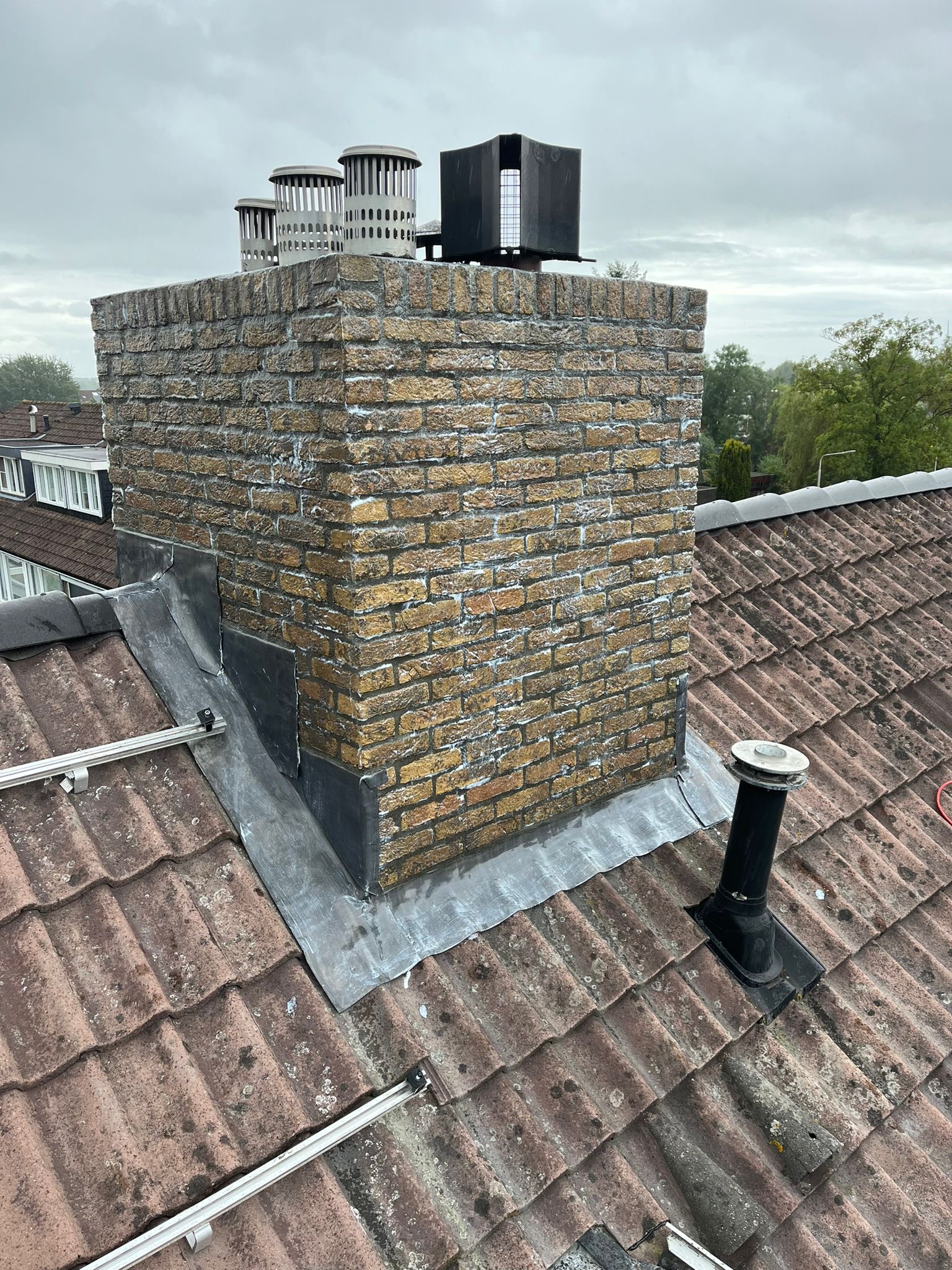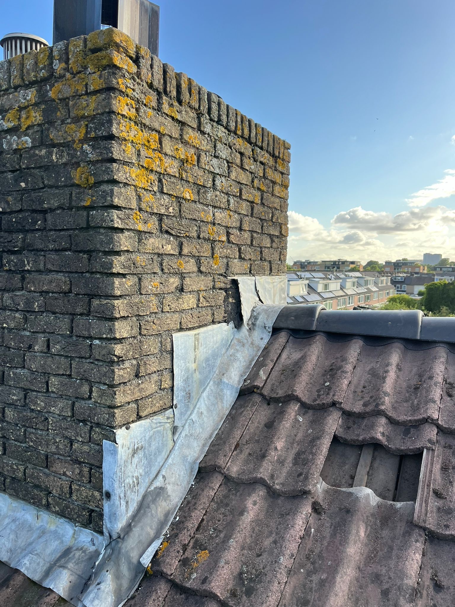 Het lood van de schoorsteen wordt compleet vervangen voor nieuw 18 ponds lood. Het oude bestaande lood wordt verwijderd en afgevoerd, daar waar het nieuw lood komt zullen wij het metselwerk inslijpen tot een diepte van ongeveer 30 a 35 mm. De ondergrond zullen wij stofvrij maken, nu kan het nieuwe lood worden aangebracht. Het lood wordt in de gevel vastgezet met loodklemmen. Als het lood is aanbracht wordt de schoorsteen gevoegd.