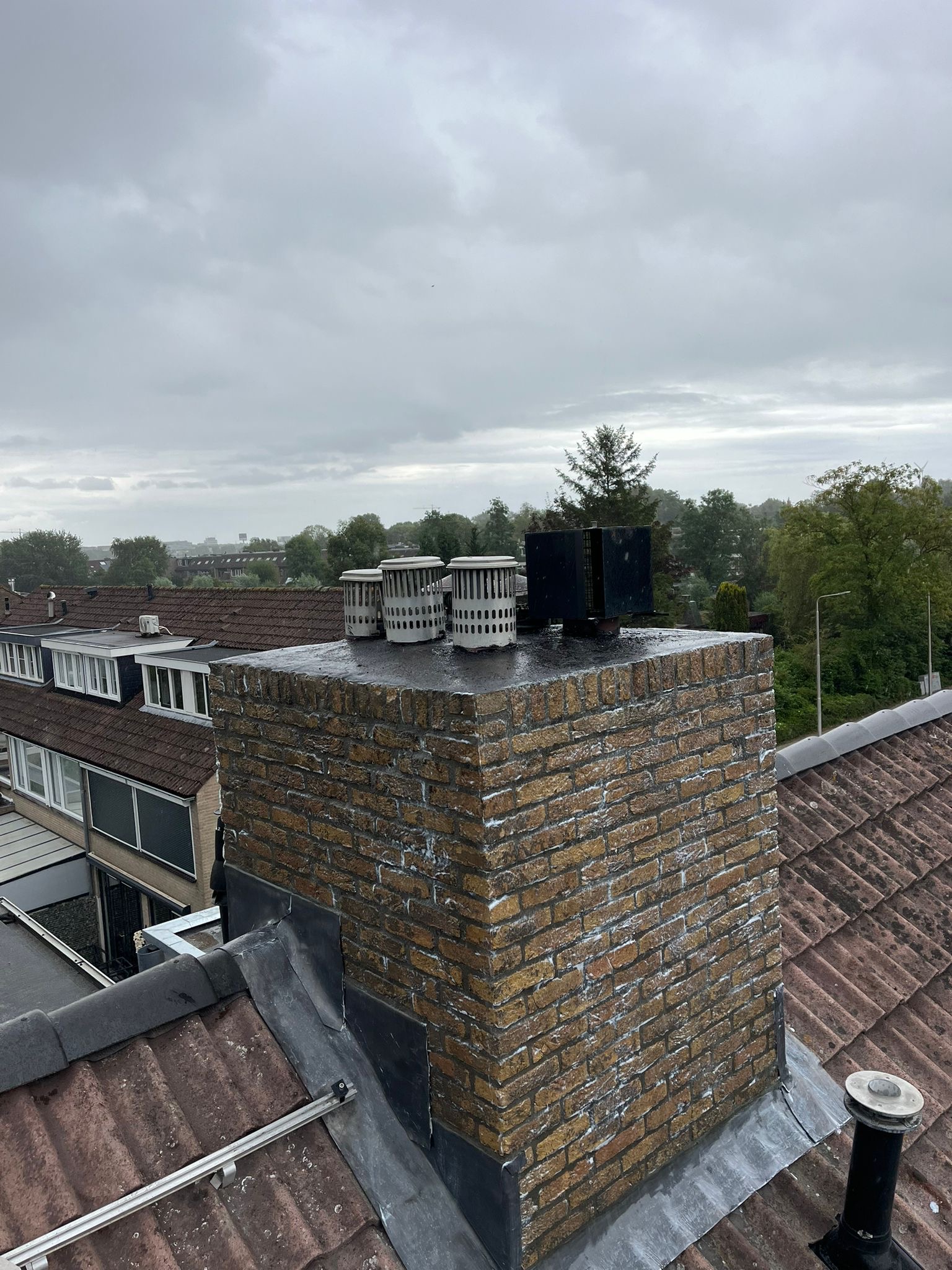 De bovenkant van de schoorsteen wordt meegenomen met het reinigen. (cement deklaag) mocht deze kapot zijn of beschadigd zijn dan zullen wij dit repareren of vervangen. Naderhand zullen wij de cement deklaag behandelen met fillcoat. Dit is een coating dit voorkomt dat regenkant via de bovenkant van de schoorsteen kan indringen. Het dak wordt na het beëindigen van de werkzaamheden weer schoon opgeleverd, incl. het schoonmaken van de dakgoten.