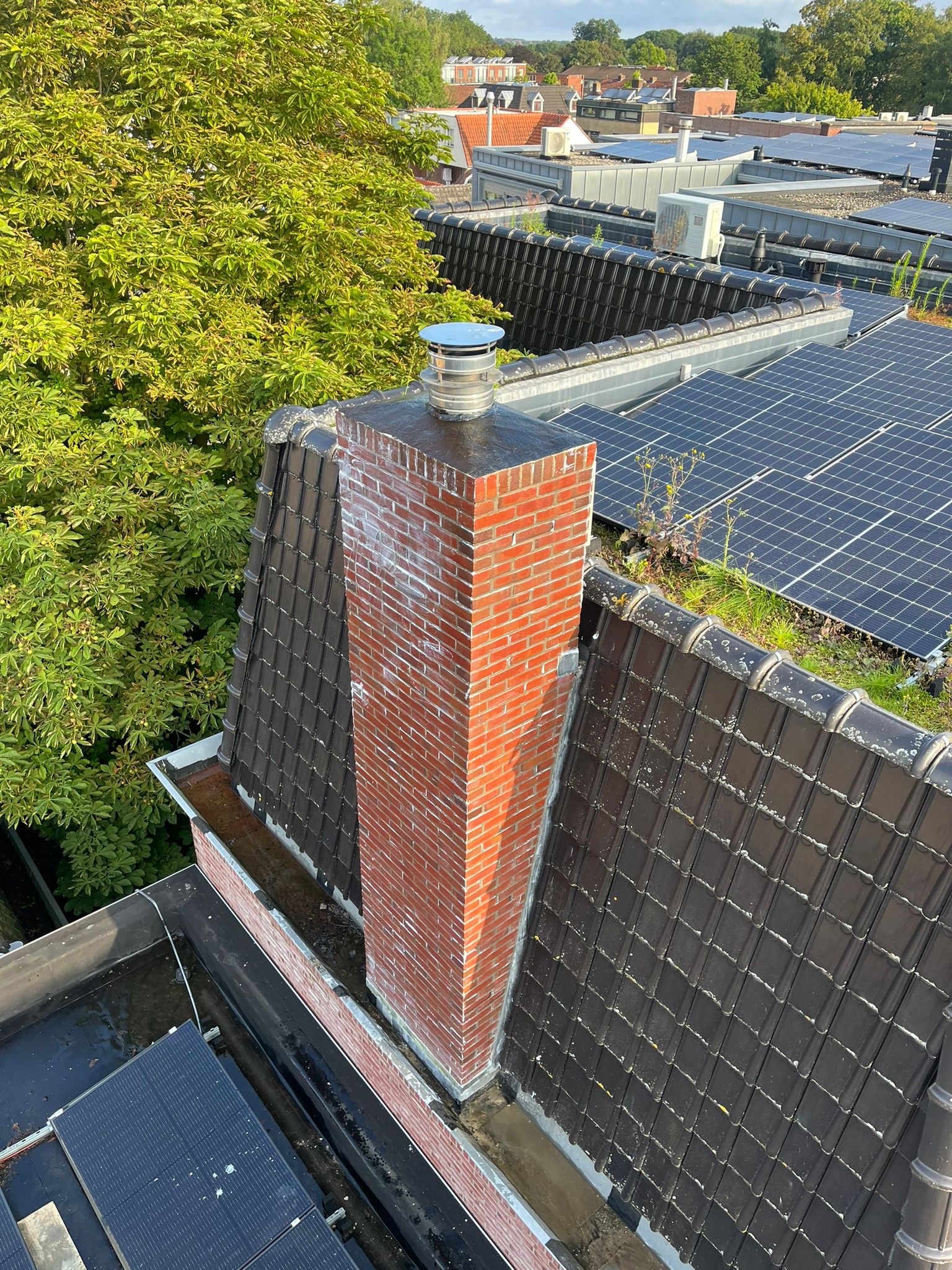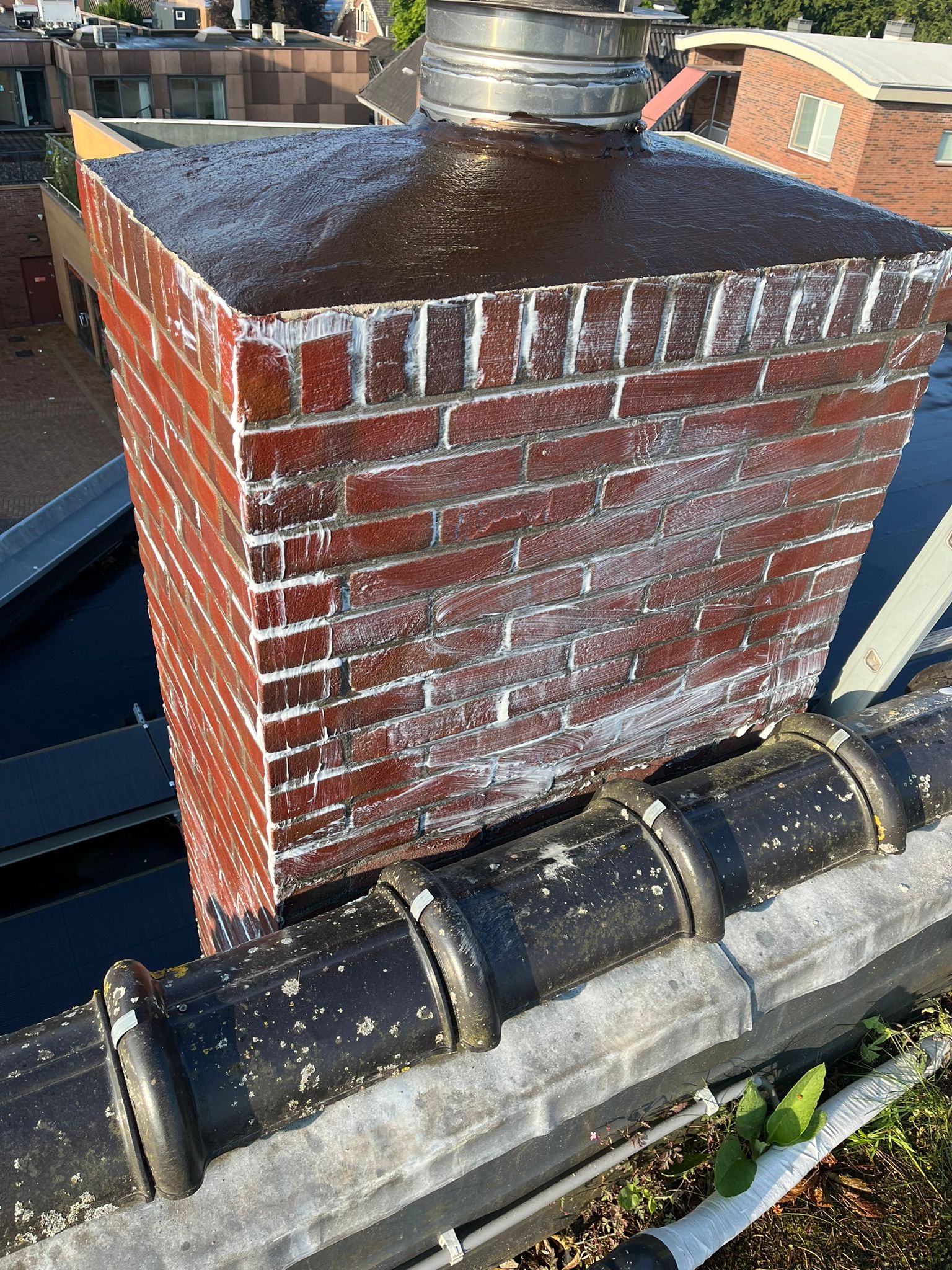 De bovenkant van de schoorsteen wordt meegenomen met het reinigen. (cement deklaag) mocht deze kapot zijn of beschadigd zijn dan zullen wij dit repareren of vervangen. Naderhand zullen wij de cement deklaag behandelen met fillcoat. Dit is een coating dit voorkomt dat regenkant via de bovenkant van de schoorsteen kan indringen. Het dak wordt na het beëindigen van de werkzaamheden weer schoon opgeleverd, incl. het schoonmaken van de dakgoten.