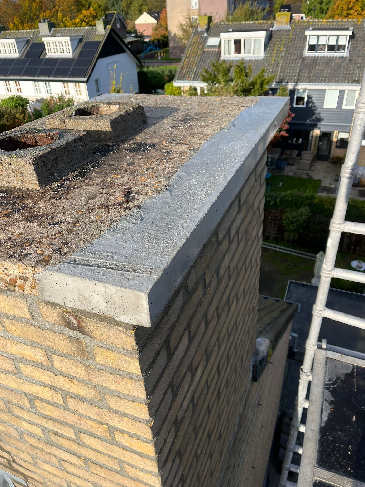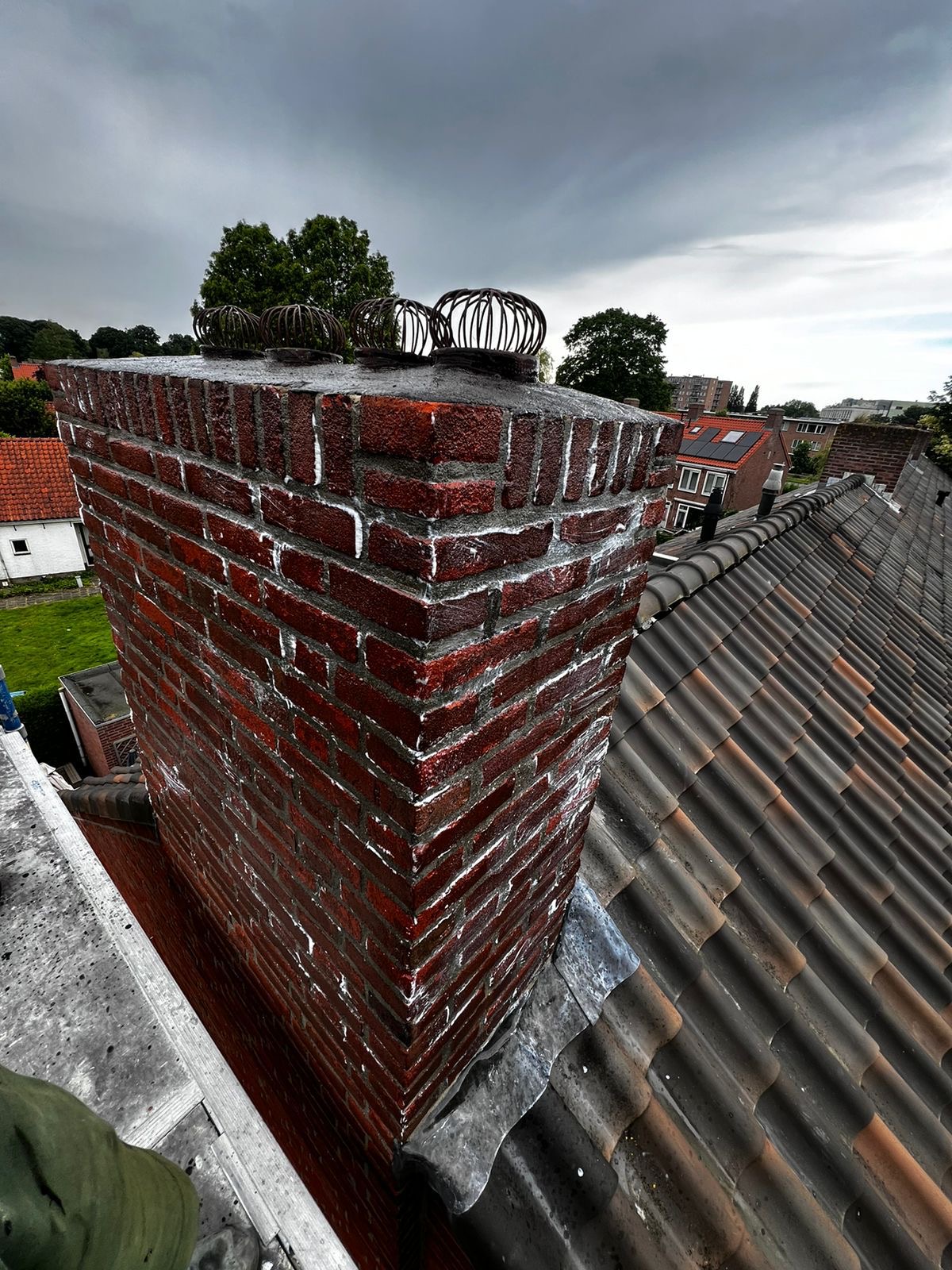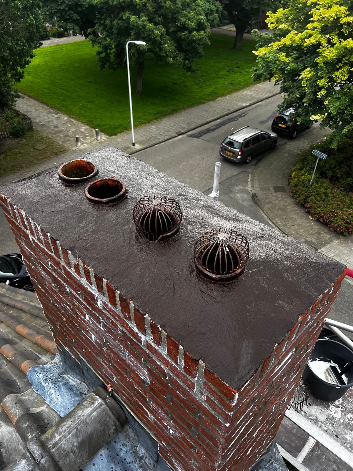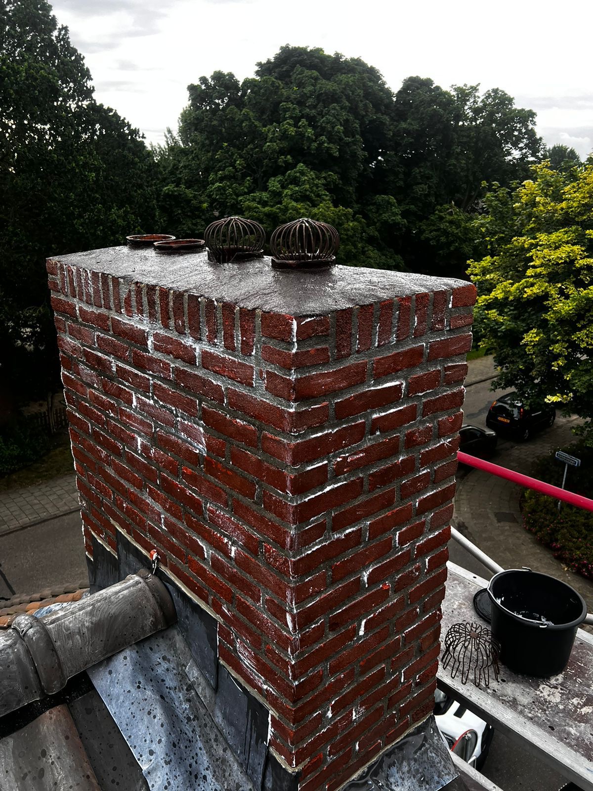 De bovenkant van de schoorsteen wordt meegenomen met het reinigen. (cement deklaag) Mocht deze kapot zijn of beschadigd zijn dan zullen wij dit repareren of vervangen. Naderhand zullen wij de cement deklaag behandelen met fillcoat. Dit is een coating dit voorkomt dat regenkant via de bovenkant van de schoorsteen kan indringen. Het dak wordt na het beëindigen van de werkzaamheden weer schoon opgeleverd, incl. het schoonmaken van de dakgoten.