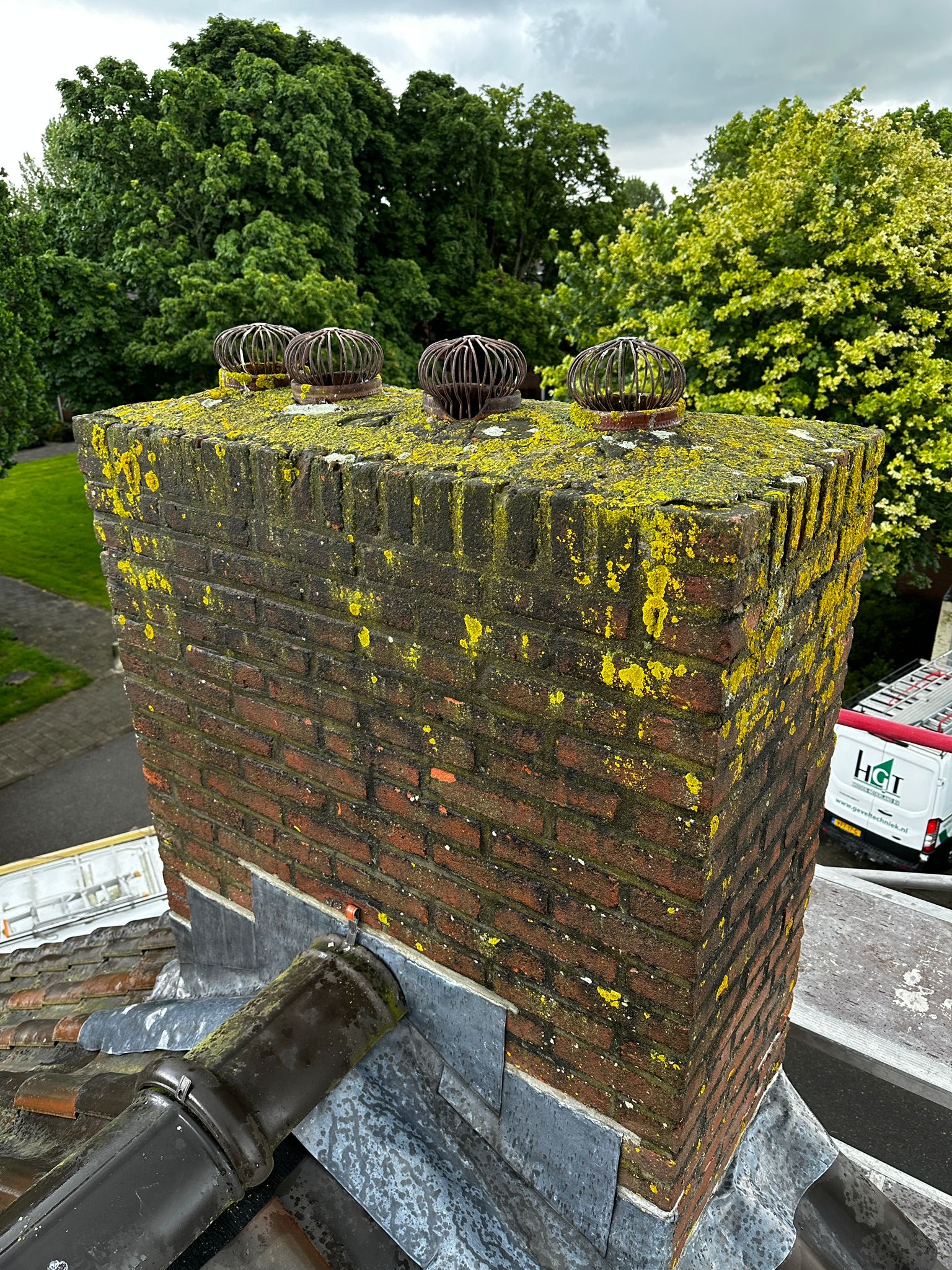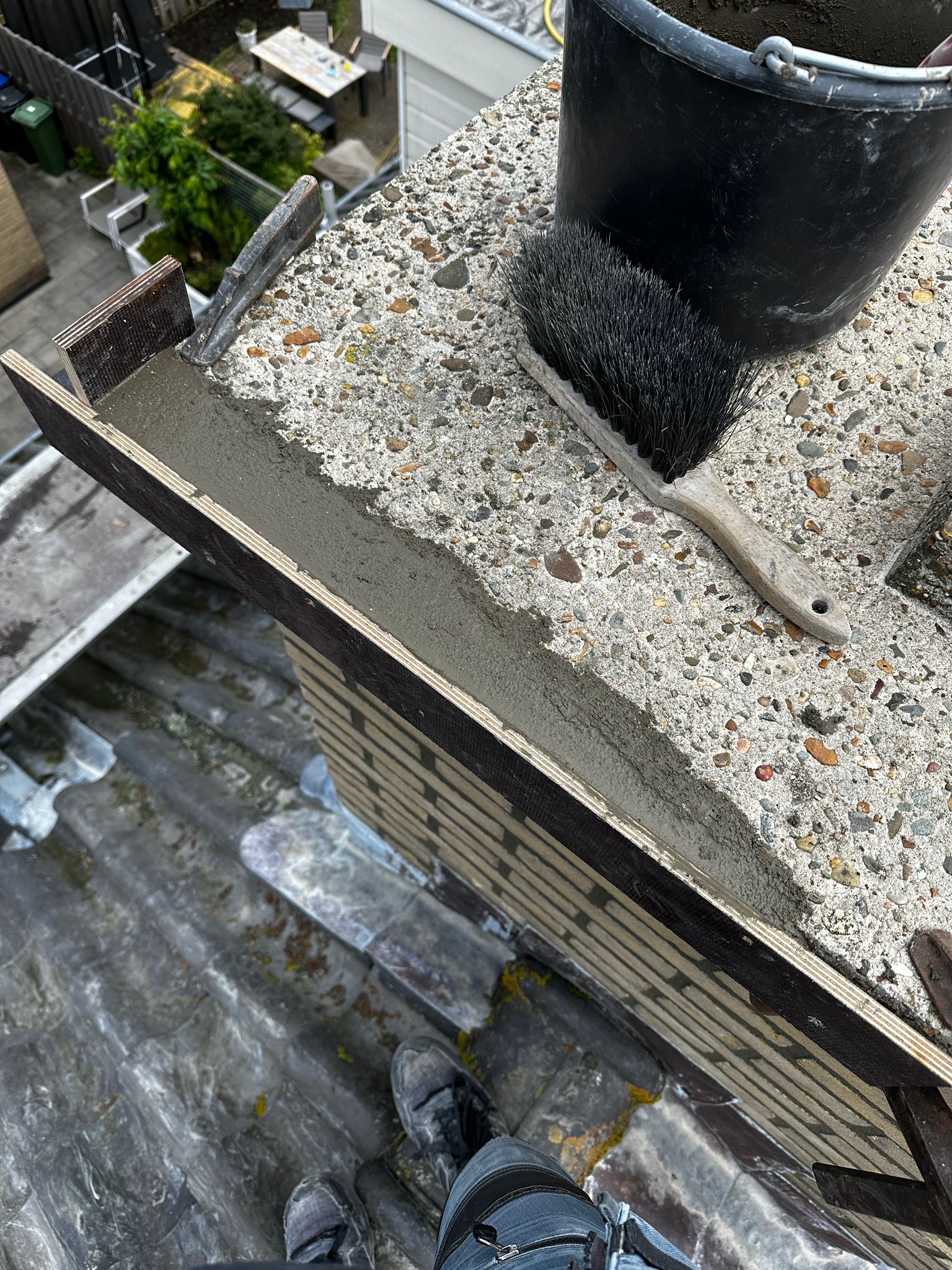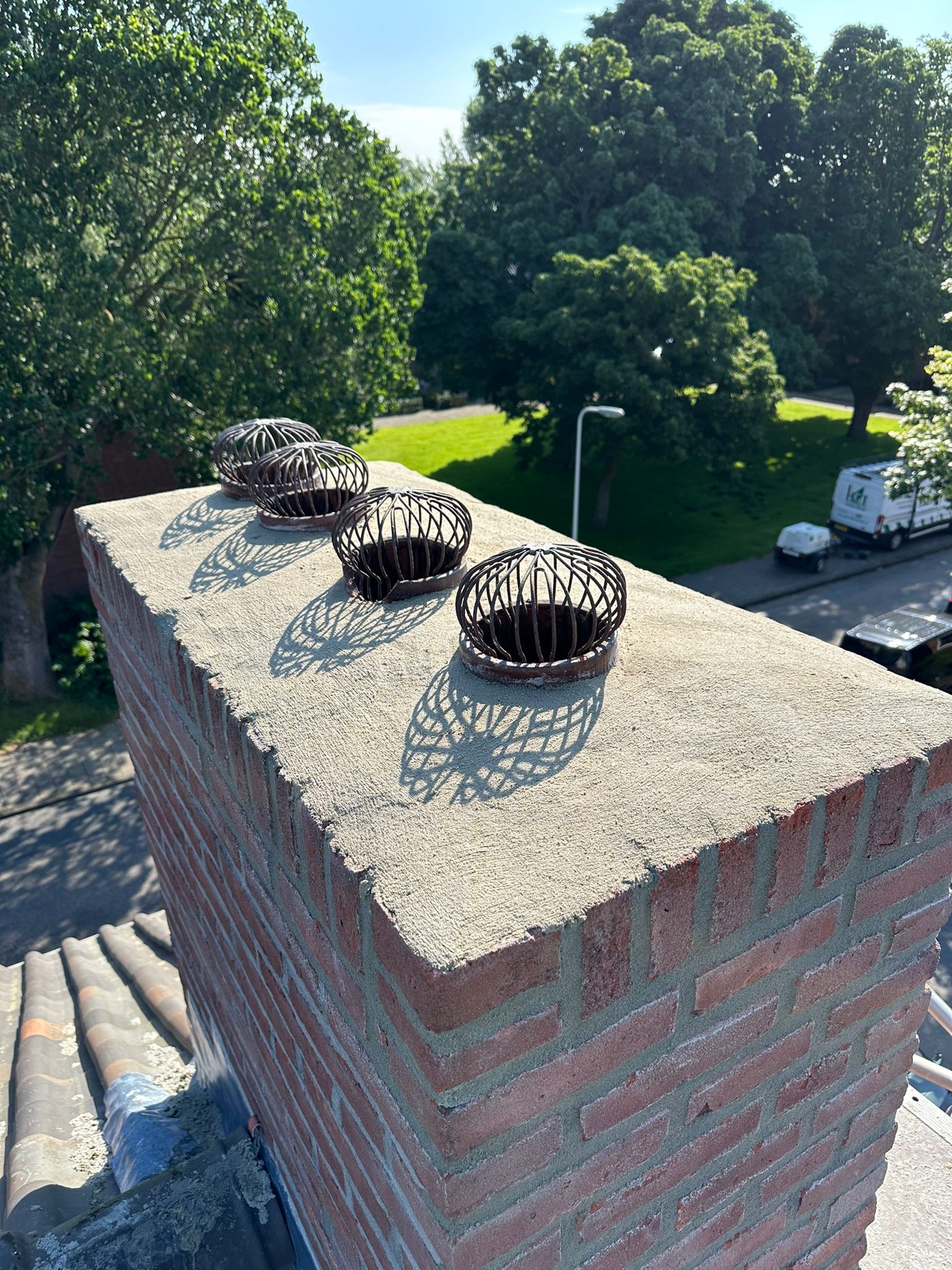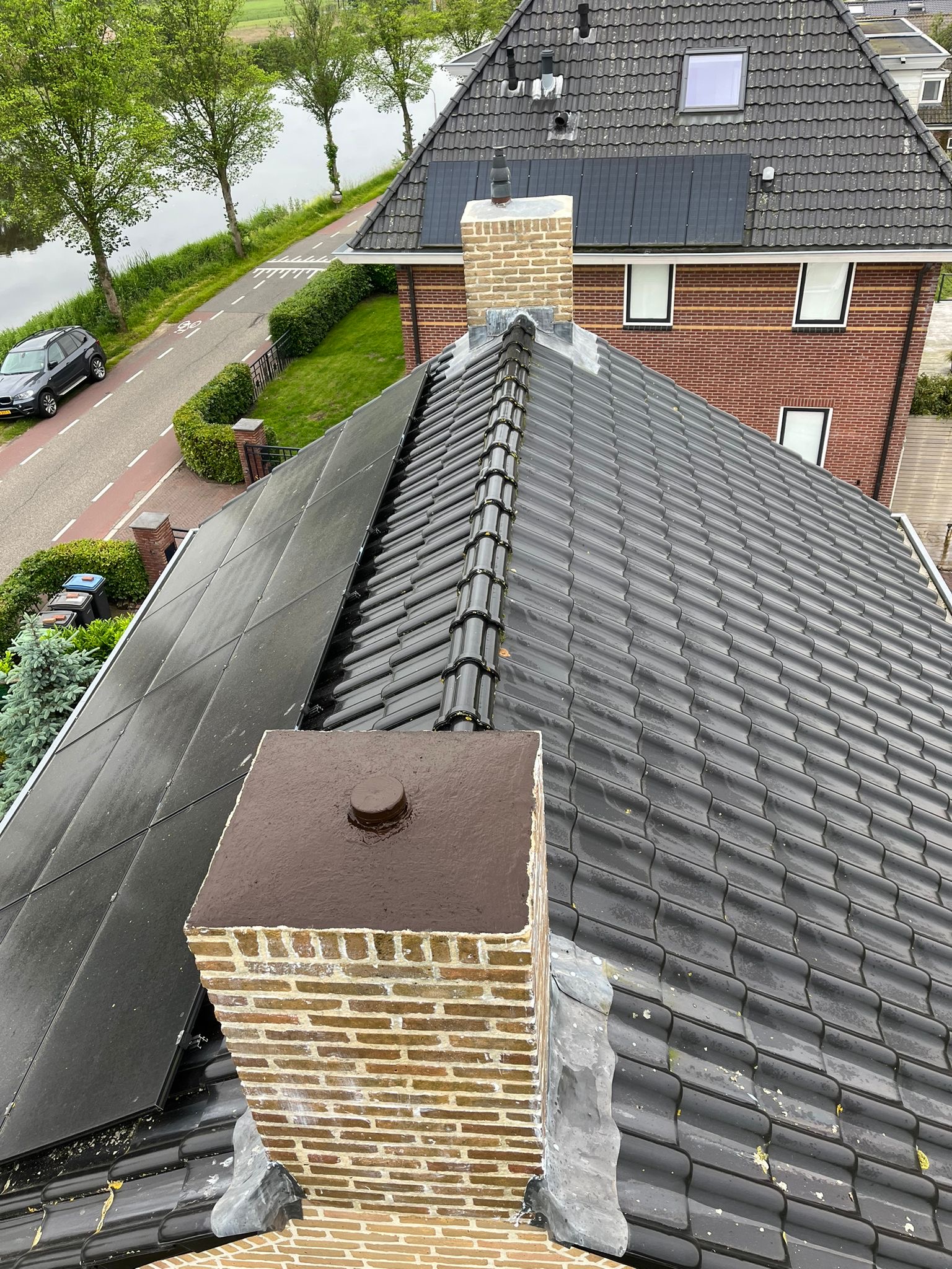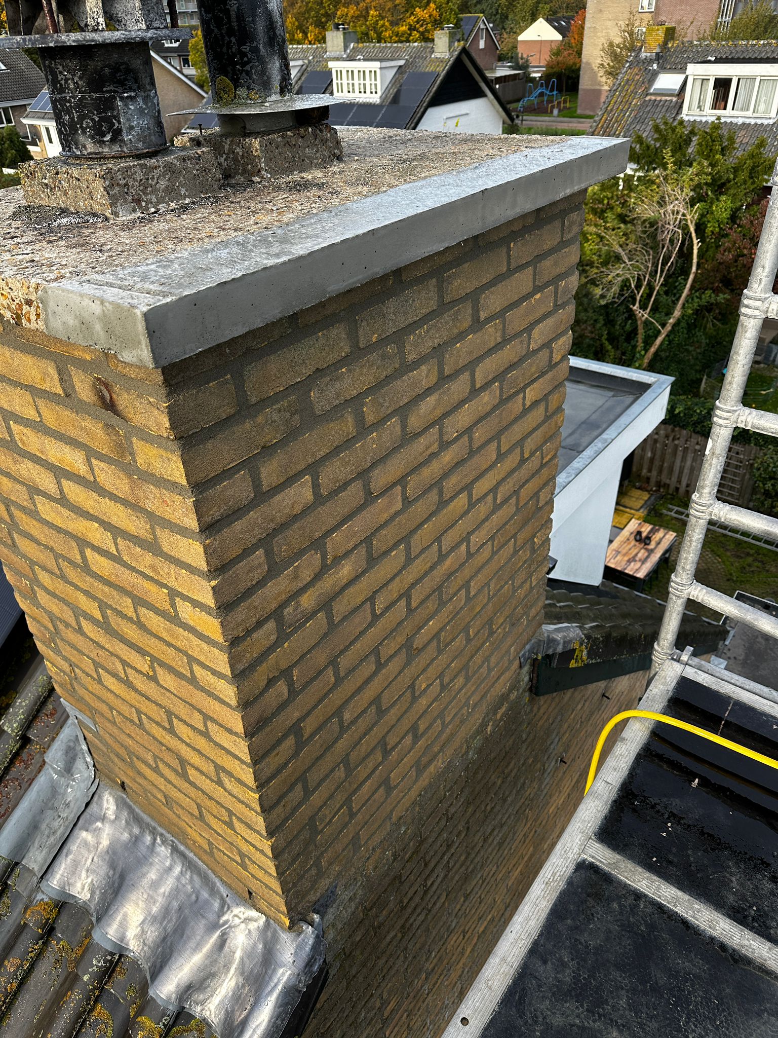 De bovenkant van de schoorsteen wordt meegenomen met het reinigen. (cement deklaag) Mocht deze kapot zijn of beschadigd zijn dan zullen wij dit repareren of vervangen. Naderhand zullen wij de cement deklaag behandelen met fillcoat. Dit is een coating dit voorkomt dat regenkant via de bovenkant van de schoorsteen kan indringen. Het dak wordt na het beëindigen van de werkzaamheden weer schoon opgeleverd, incl. het schoonmaken van de dakgoten.