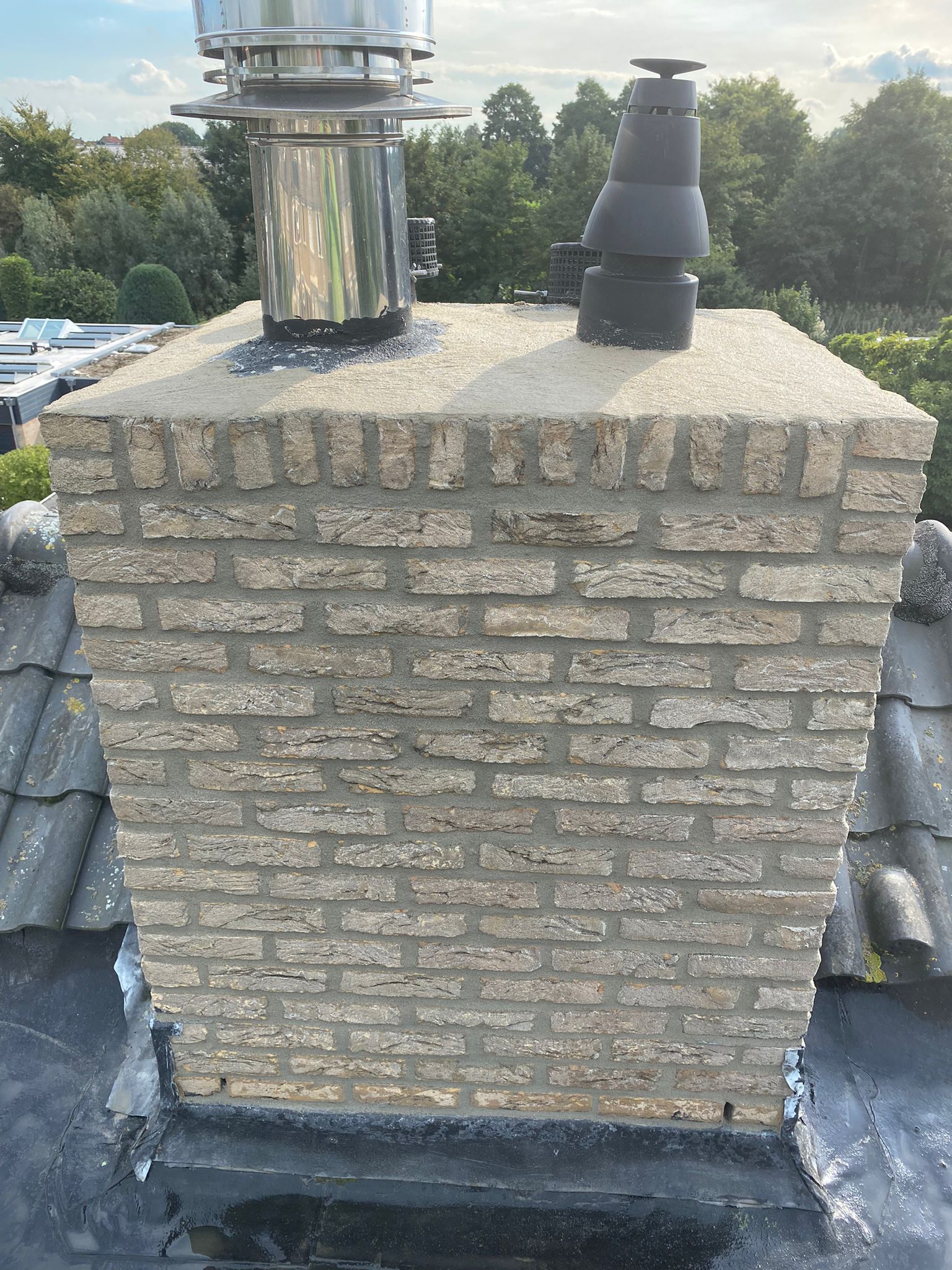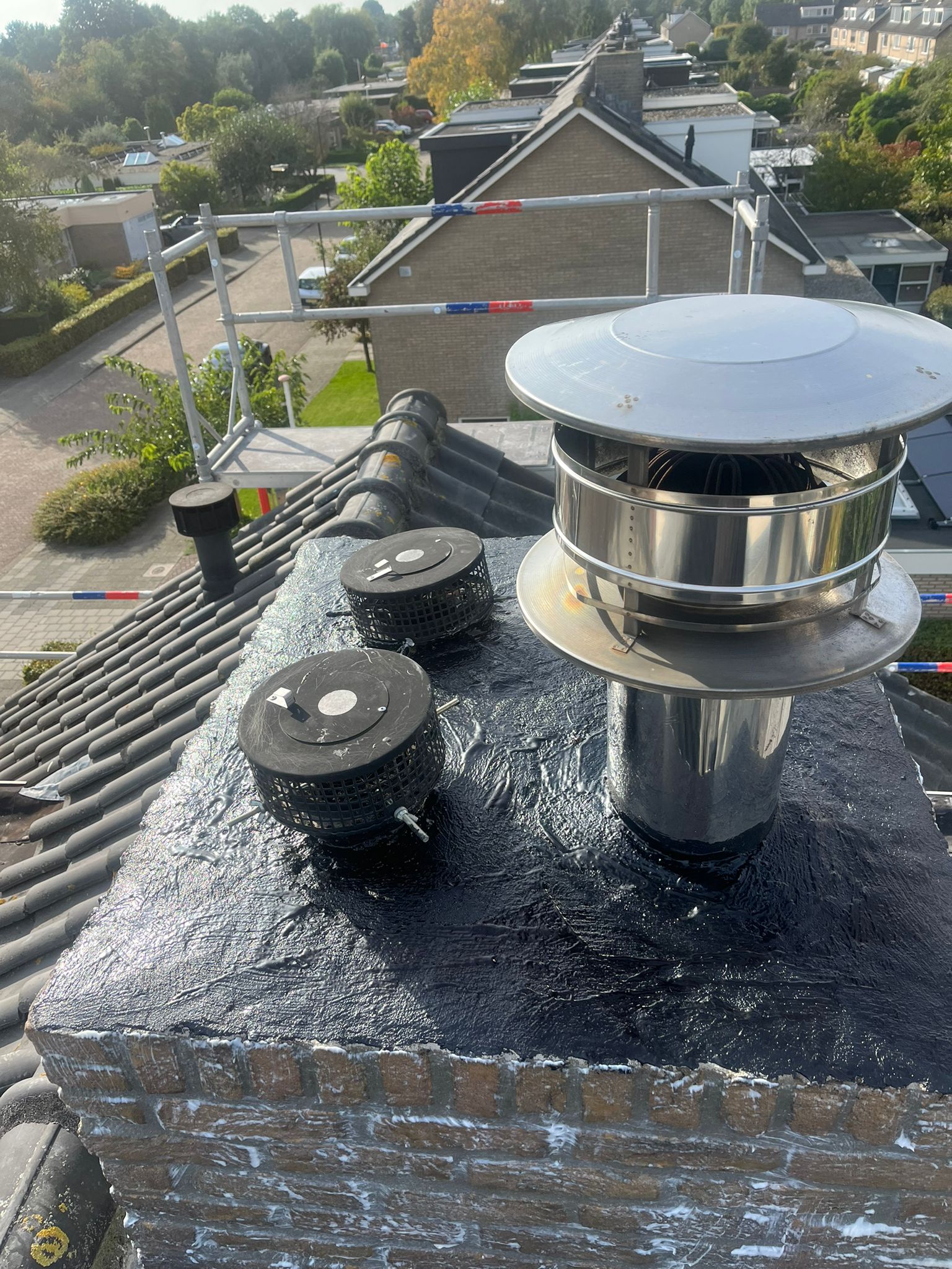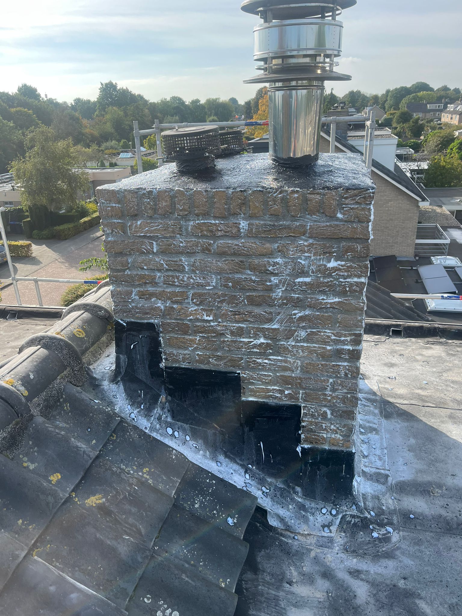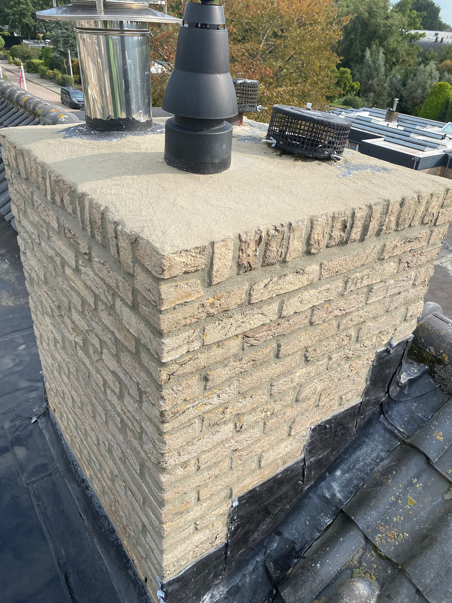 De bovenkant van de schoorsteen wordt meegenomen met het reinigen. (cement deklaag) Mocht deze kapot zijn of beschadigd zijn dan zullen wij dit repareren of vervangen. Naderhand zullen wij de cement deklaag behandelen met fillcoat. Dit is een coating dit voorkomt dat regenkant via de bovenkant van de schoorsteen kan indringen. Het dak wordt na het beëindigen van de werkzaamheden weer schoon opgeleverd, incl. het schoonmaken van de dakgoten.