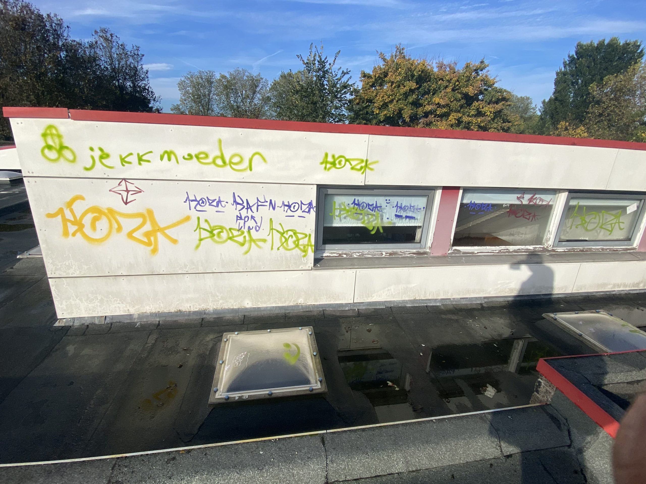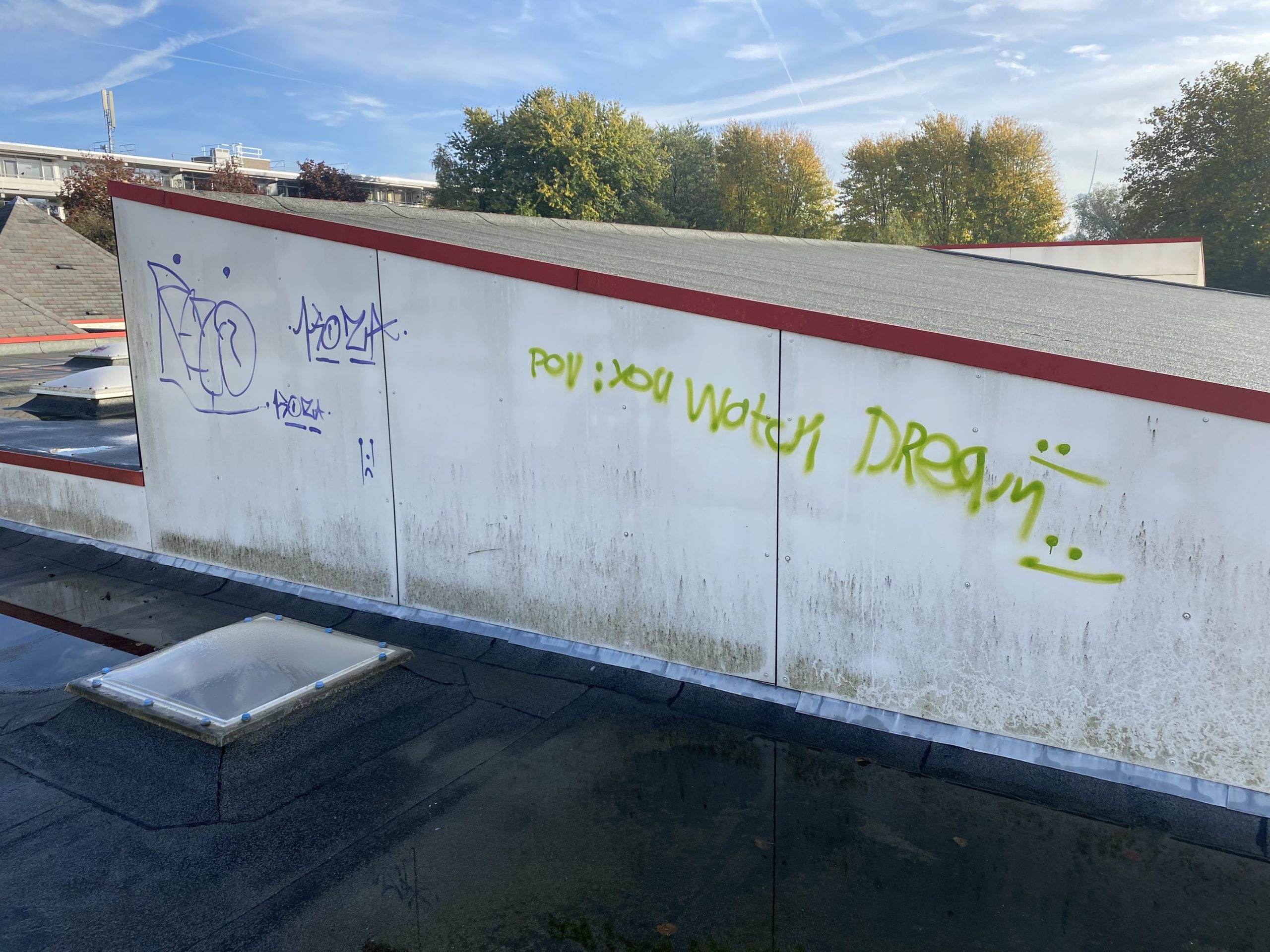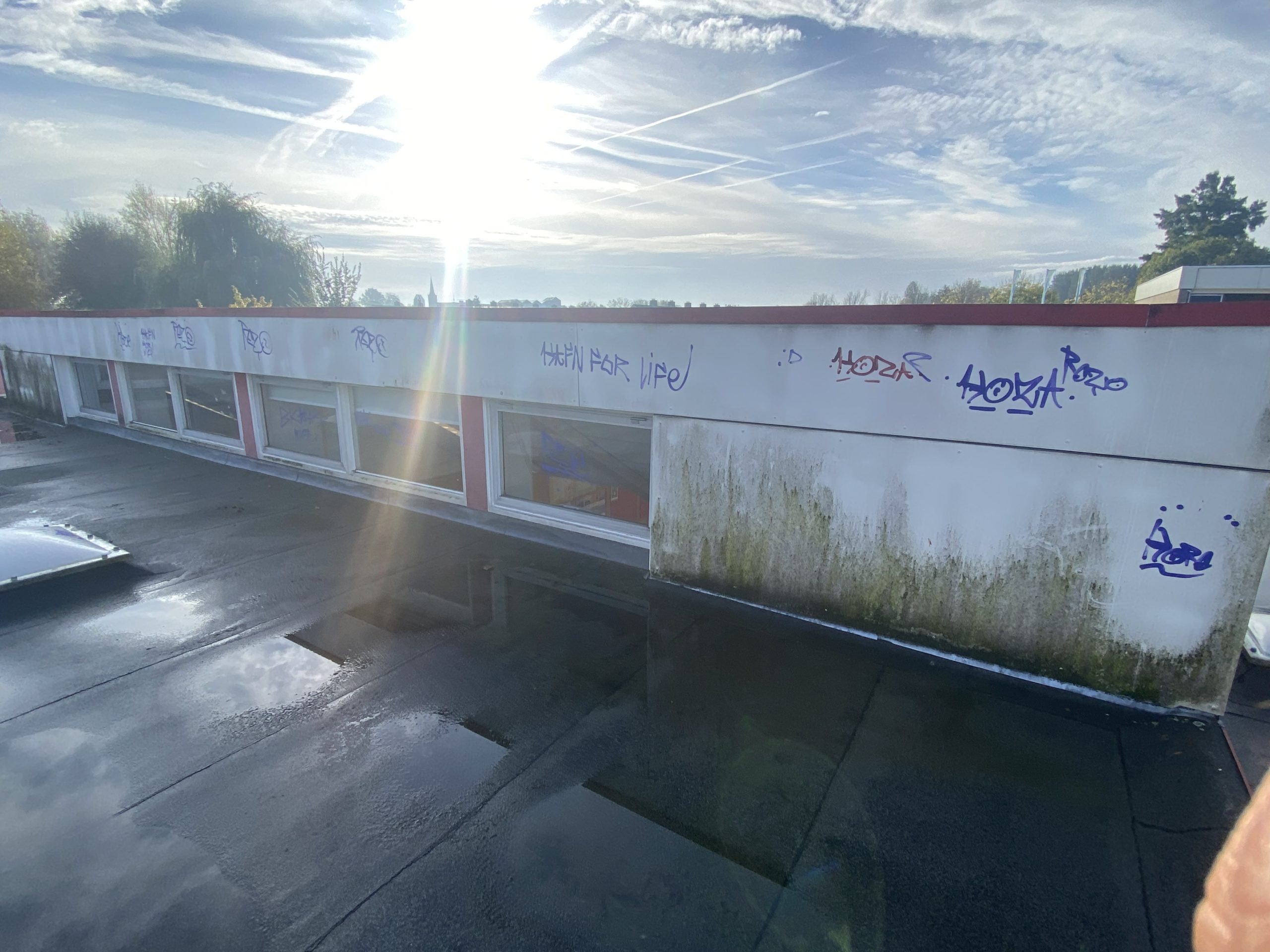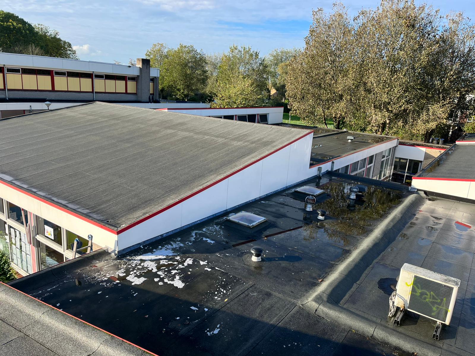 Bovenop het dak van de eendracht en Hofland school zit behoorlijk veel graffiti. Wij zullen daar waar de graffiti zit de trespa geveldelen en op de ramen voorbehandelen met een verfstripper, dit zullen wij adviseren door met schuurpads het verf los te weken van de ondergrond. De schuurpats zijn gemaakt zodat de ondergrond niet beschadigd raakt. Na een inwerk periode van minimaal 15 min zullen wij de graffiti reinigen. De druk van het water zullen we ter plaatsen afstellen aan de verschillende ondergronden, het temperatuur van het water loopt op tot 100 graden heet water. Hierdoor zal de graffiti loskomen en wegspoelen zonder de ondergrond te beschadigen.
