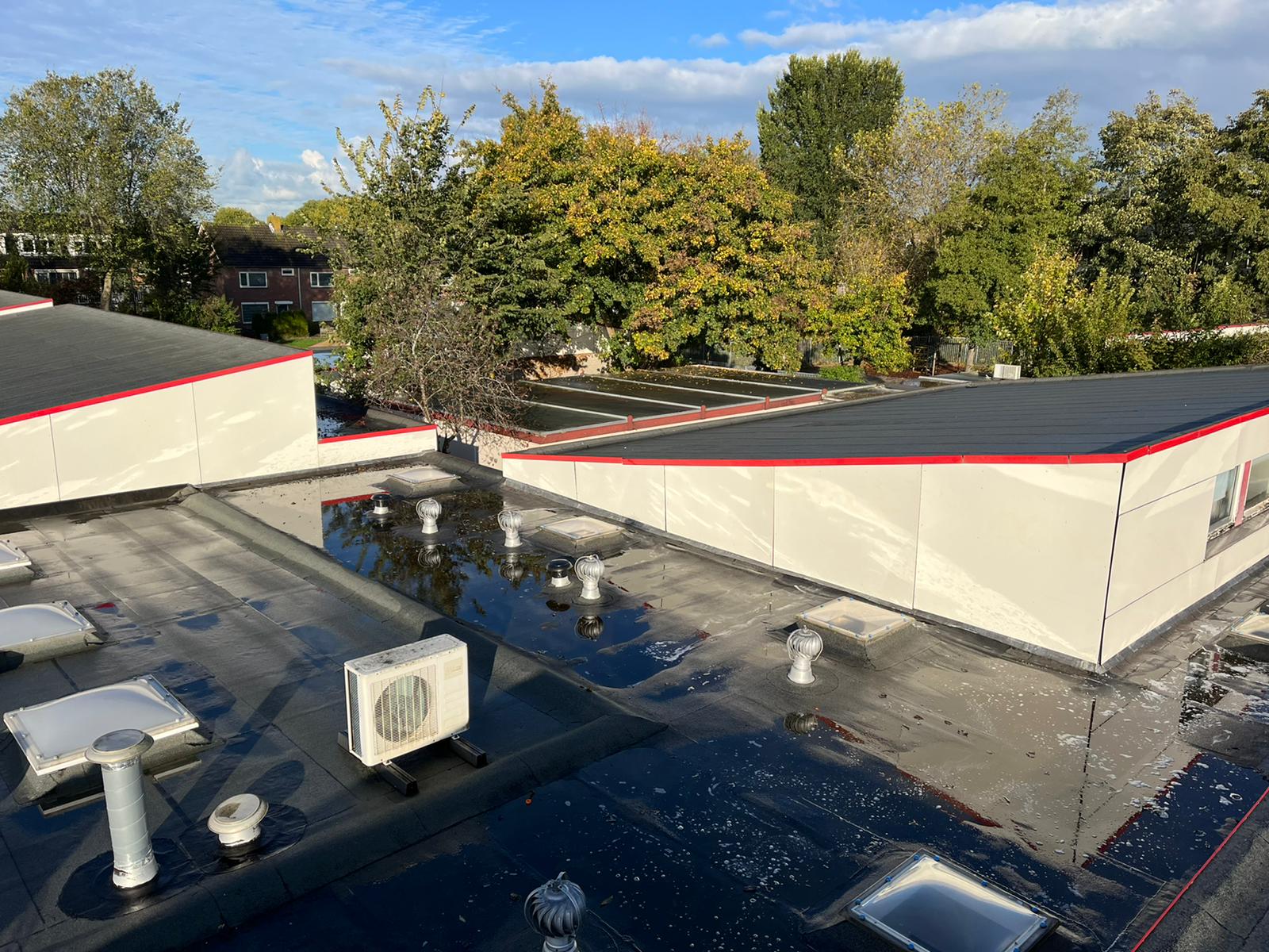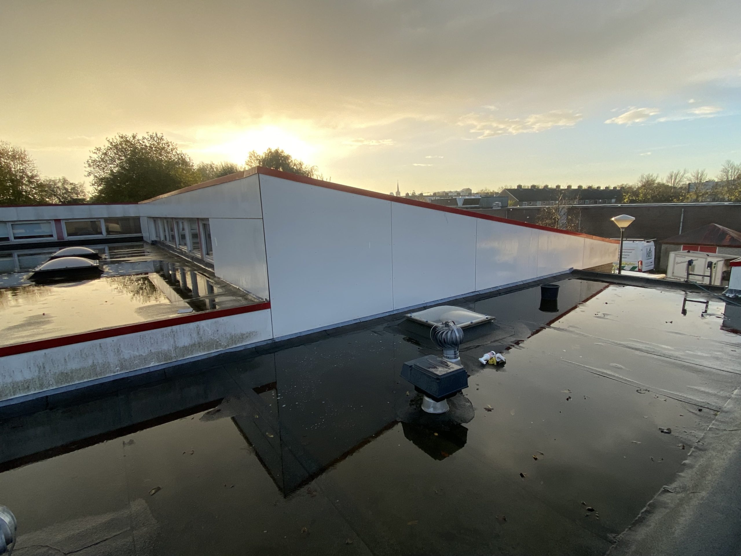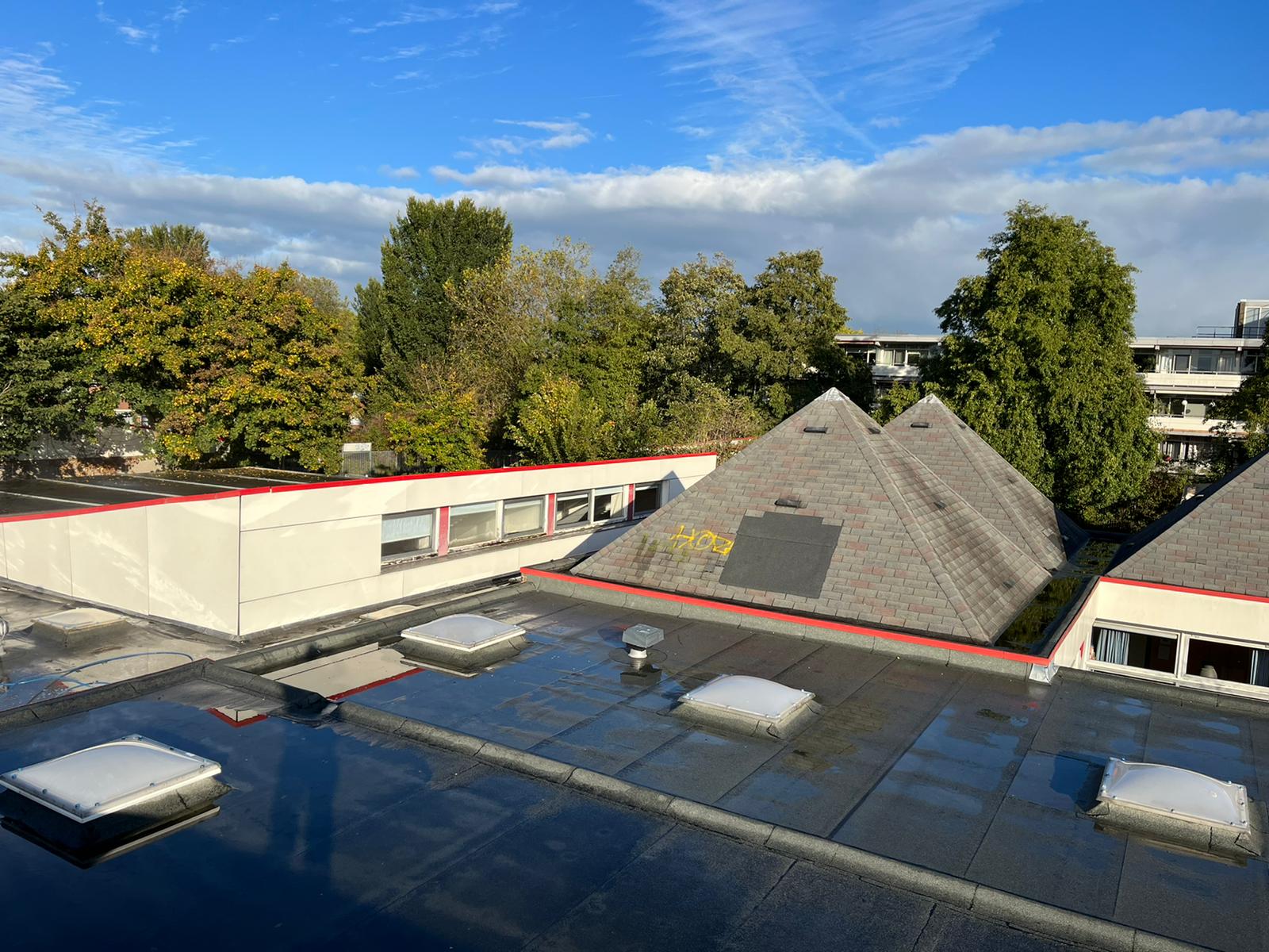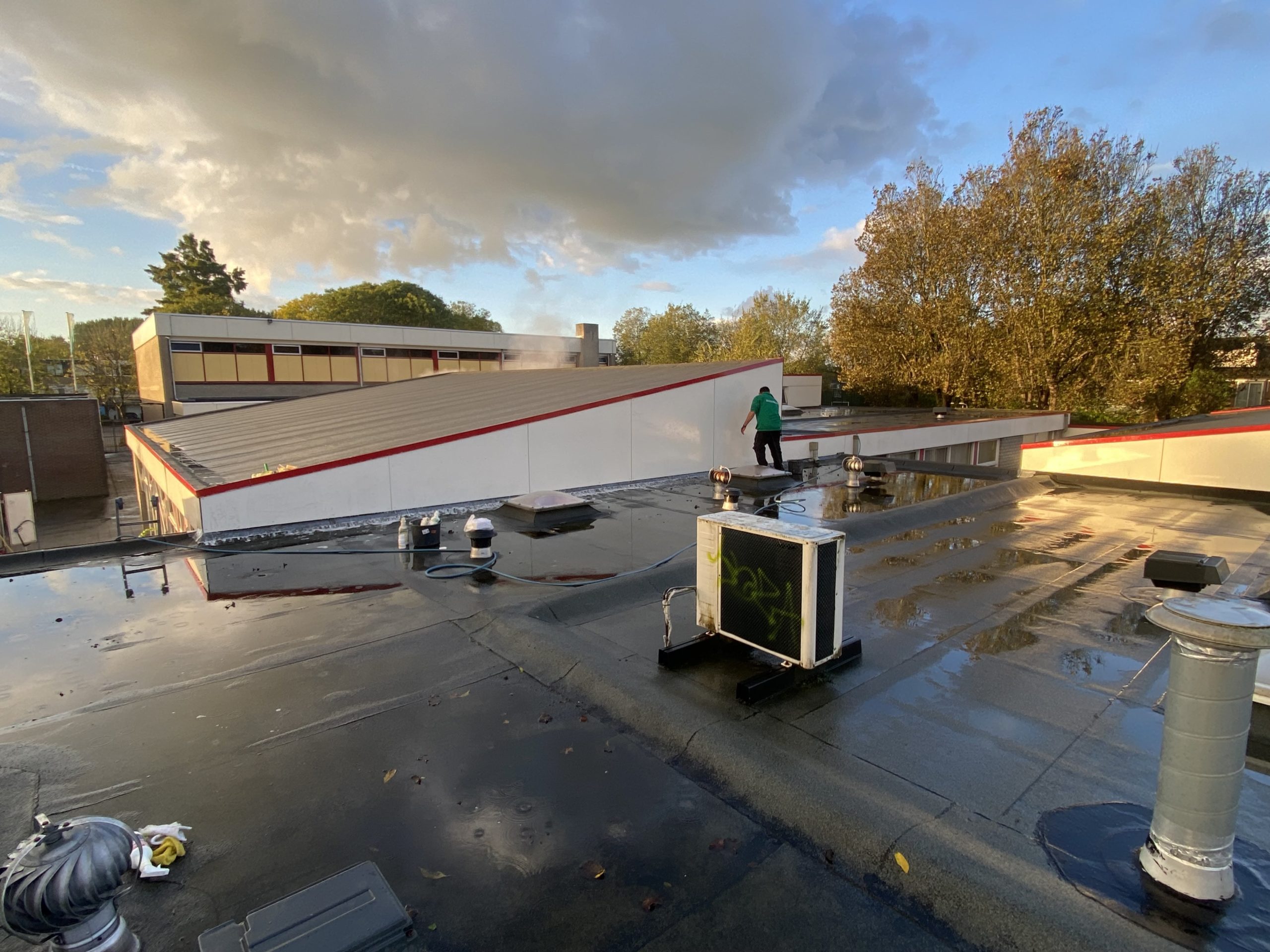Bovenop het dak van de eendracht en Hofland school zit behoorlijk veel graffiti. Wij zullen daar waar de graffiti zit de trespa geveldelen en op de ramen voorbehandelen met een verfstripper, dit zullen wij adviseren door met schuurpads het verf los te weken van de ondergrond. De schuurpats zijn gemaakt zodat de ondergrond niet beschadigd raakt. Na een inwerk periode van minimaal 15 min zullen wij de graffiti reinigen. De druk van het water zullen we ter plaatsen afstellen aan de verschillende ondergronden, het temperatuur van het water loopt op tot 100 graden heet water. Hierdoor zal de graffiti loskomen en wegspoelen zonder de ondergrond te beschadigen.