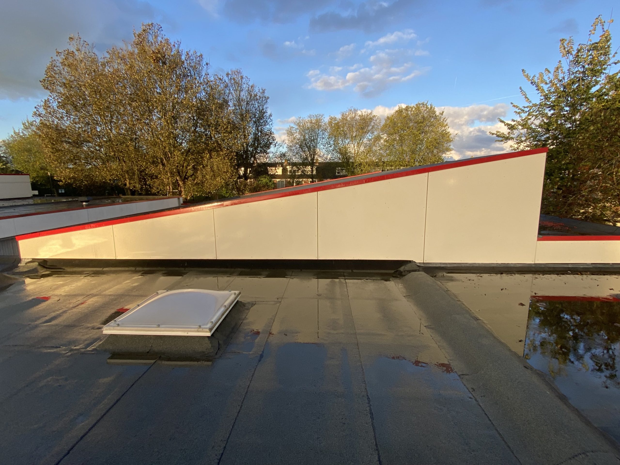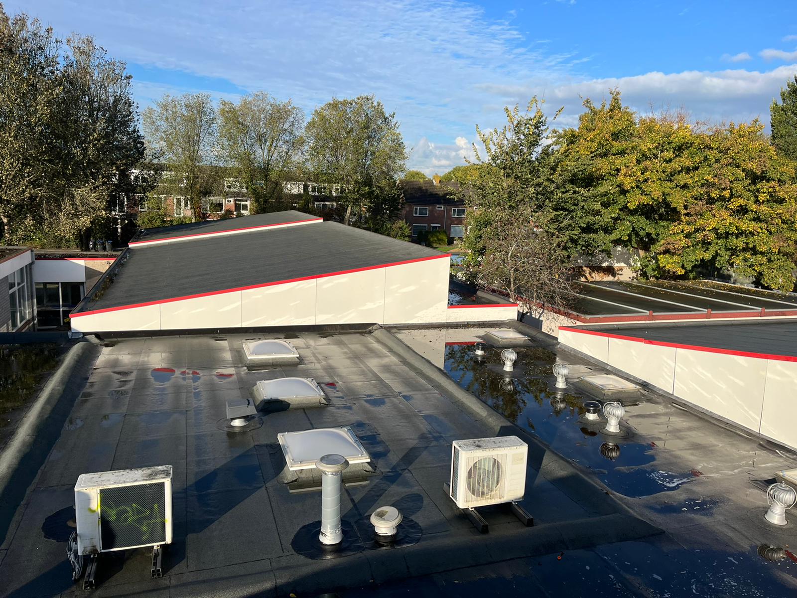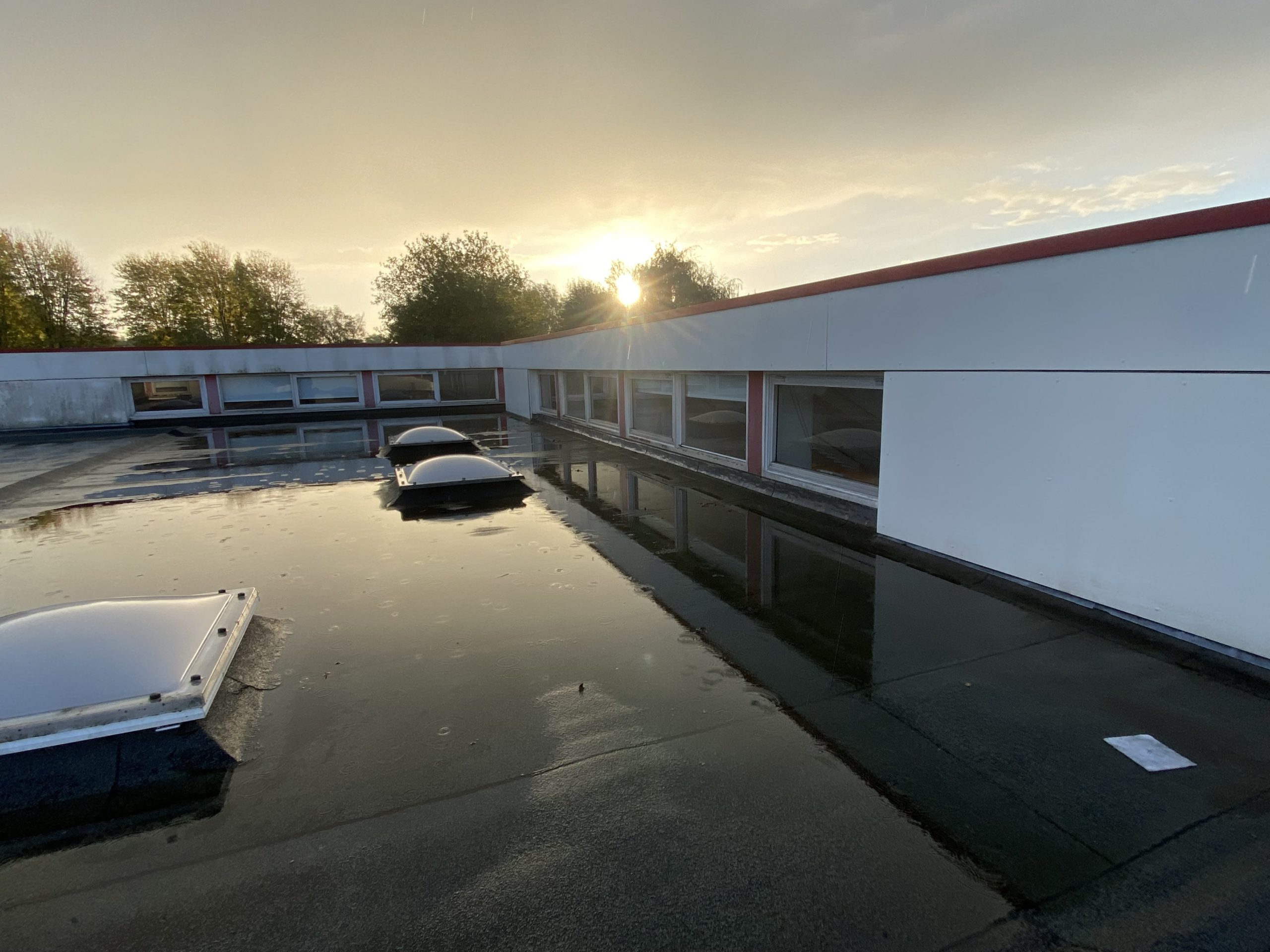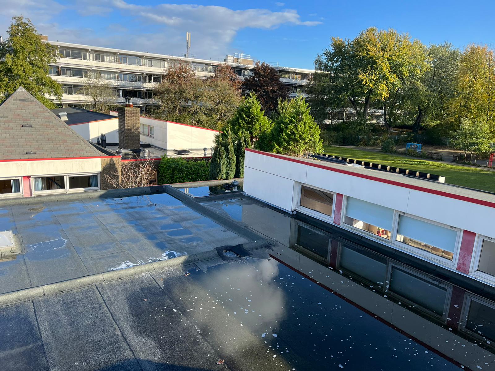 Bovenop het dak van de eendracht en Hofland school zit behoorlijk veel graffiti. Wij zullen daar waar de graffiti zit de trespa geveldelen en op de ramen voorbehandelen met een verfstripper, dit zullen wij adviseren door met schuurpads het verf los te weken van de ondergrond. De schuurpats zijn gemaakt zodat de ondergrond niet beschadigd raakt. Na een inwerk periode van minimaal 15 min zullen wij de graffiti reinigen. De druk van het water zullen we ter plaatsen afstellen aan de verschillende ondergronden, het temperatuur van het water loopt op tot 100 graden heet water. Hierdoor zal de graffiti loskomen en wegspoelen zonder de ondergrond te beschadigen.