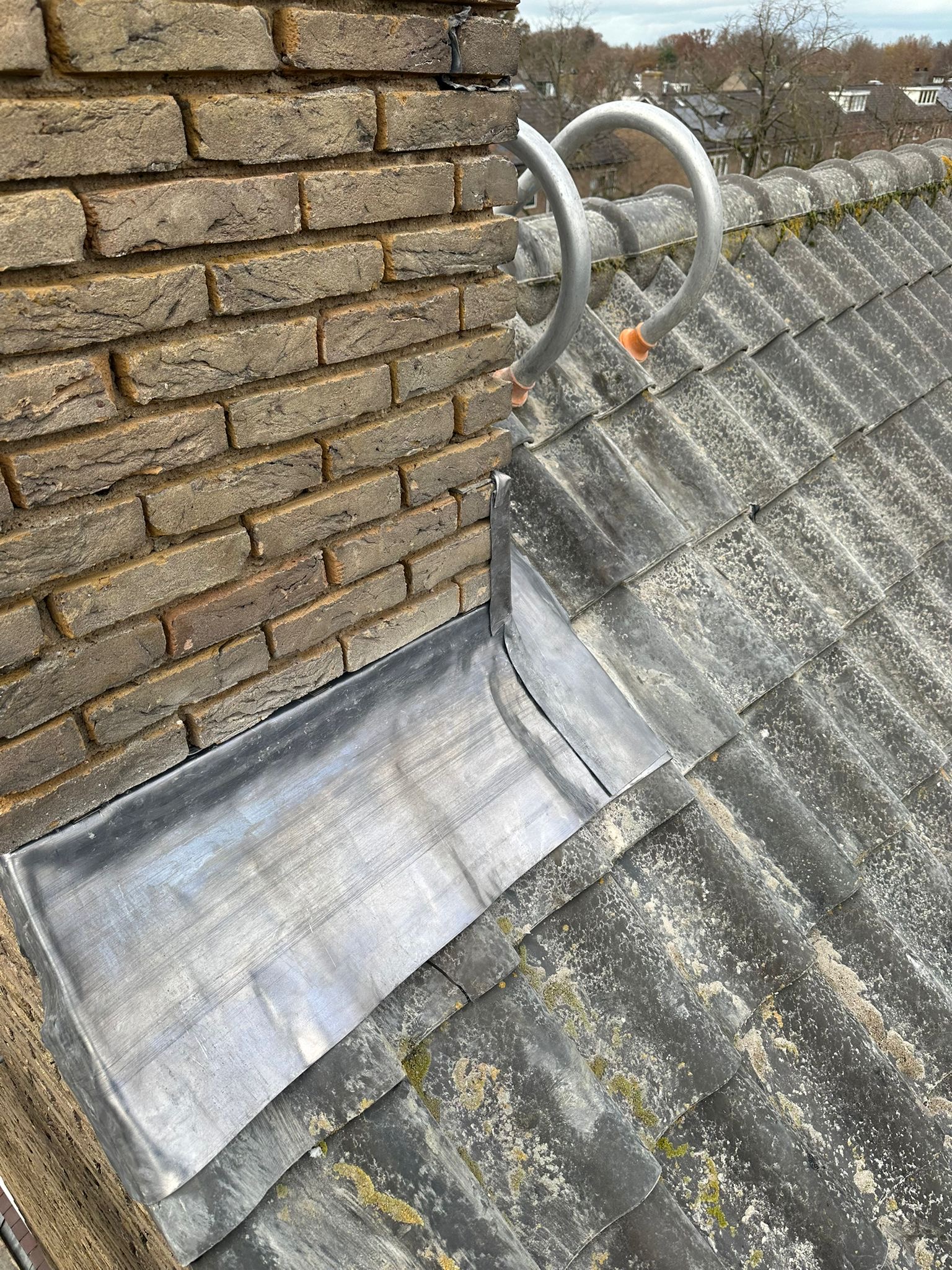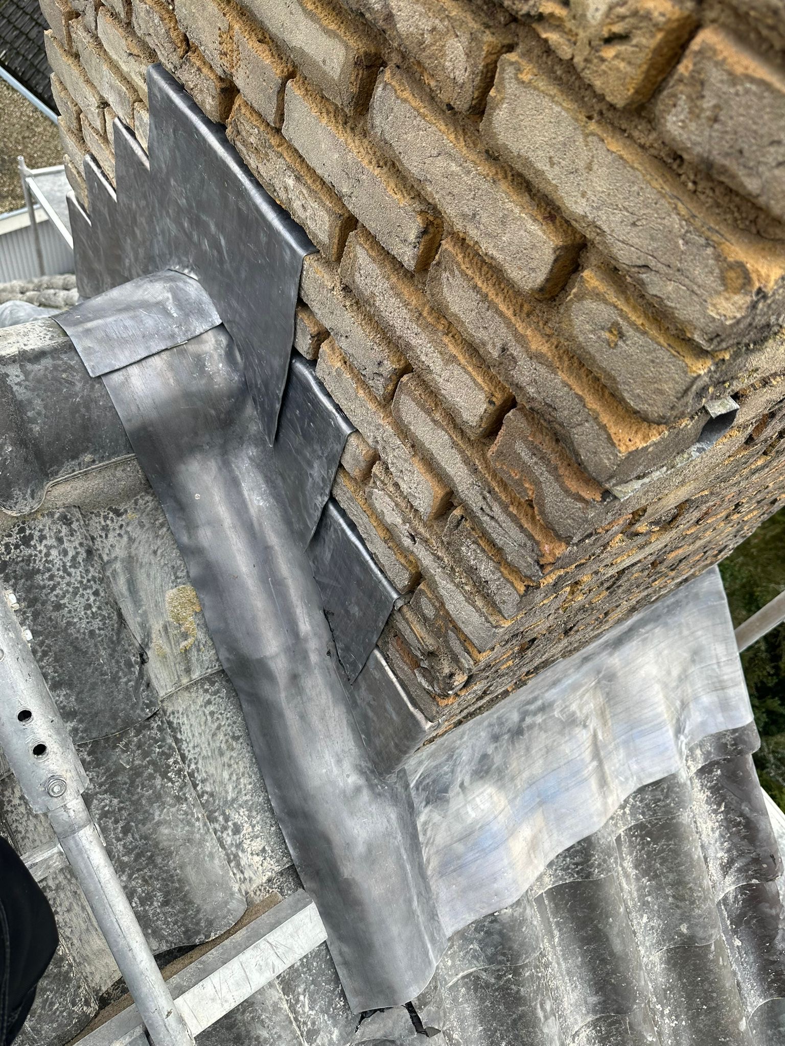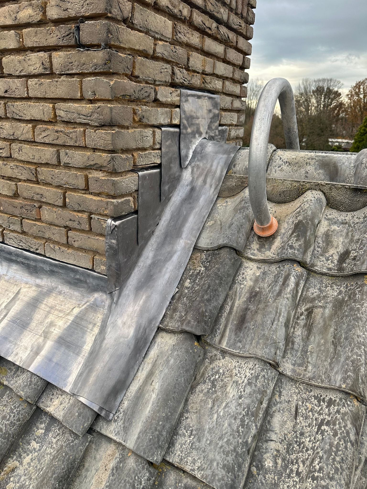Het lood van de schoorsteen wordt compleet vervangen voor nieuw 18 ponds lood. Het oude bestaande lood wordt verwijderd en afgevoerd, daar waar het nieuw lood komt zullen wij het metselwerk inslijpen tot een diepte van ongeveer 30 a 35 mm. De ondergrond zullen wij stofvrij maken, nu kan het nieuwe lood worden aangebracht. Het lood wordt in de gevel vastgezet met loodklemmen. Als het lood is aanbracht wordt de schoorsteen gevoegd.