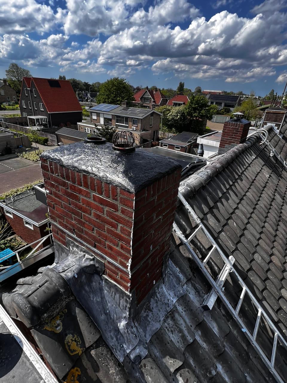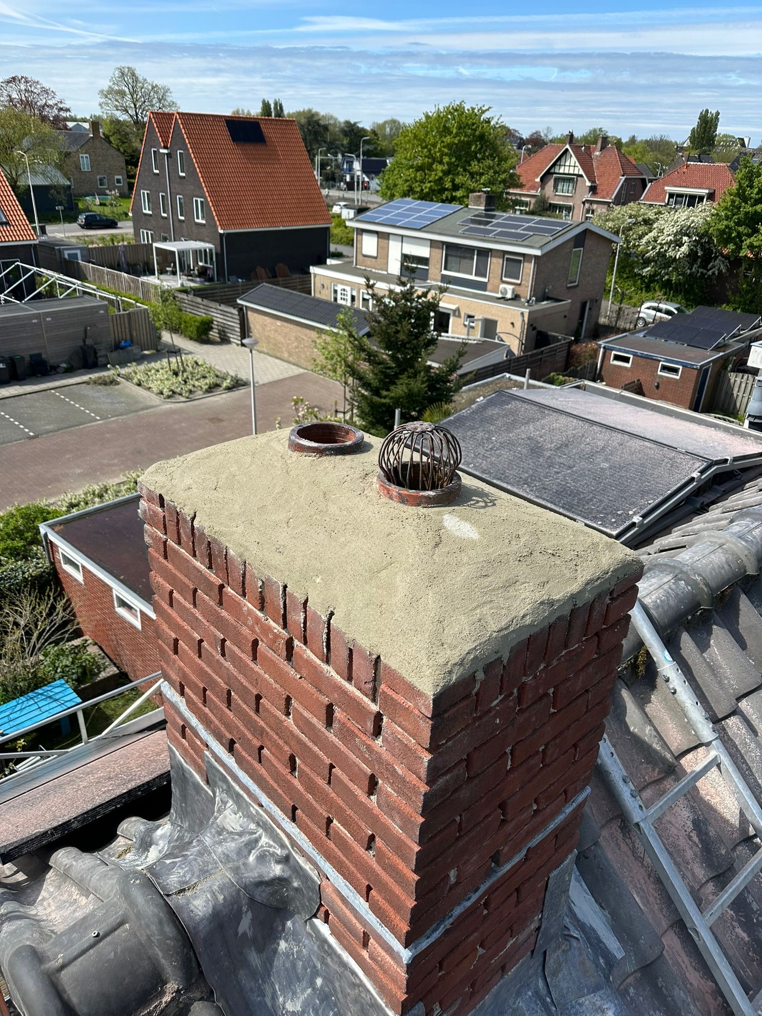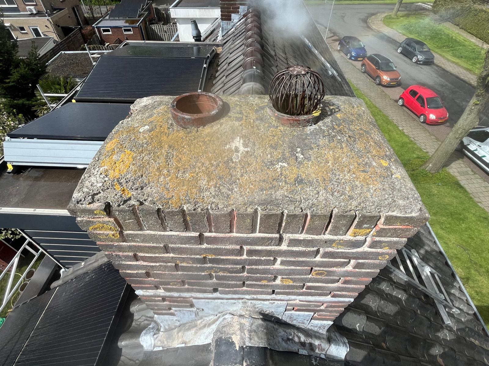 De bovenkant van de schoorsteen wordt meegenomen met het reinigen. (cement deklaag) Mocht deze kapot zijn of beschadigd zijn dan zullen wij dit repareren of vervangen. Naderhand zullen wij de cement deklaag behandelen met fillcoat. Dit is een coating dit voorkomt dat regenkant via de bovenkant van de schoorsteen kan indringen. Het dak wordt na het beëindigen van de werkzaamheden weer schoon opgeleverd, incl. het schoonmaken van de dakgoten.
