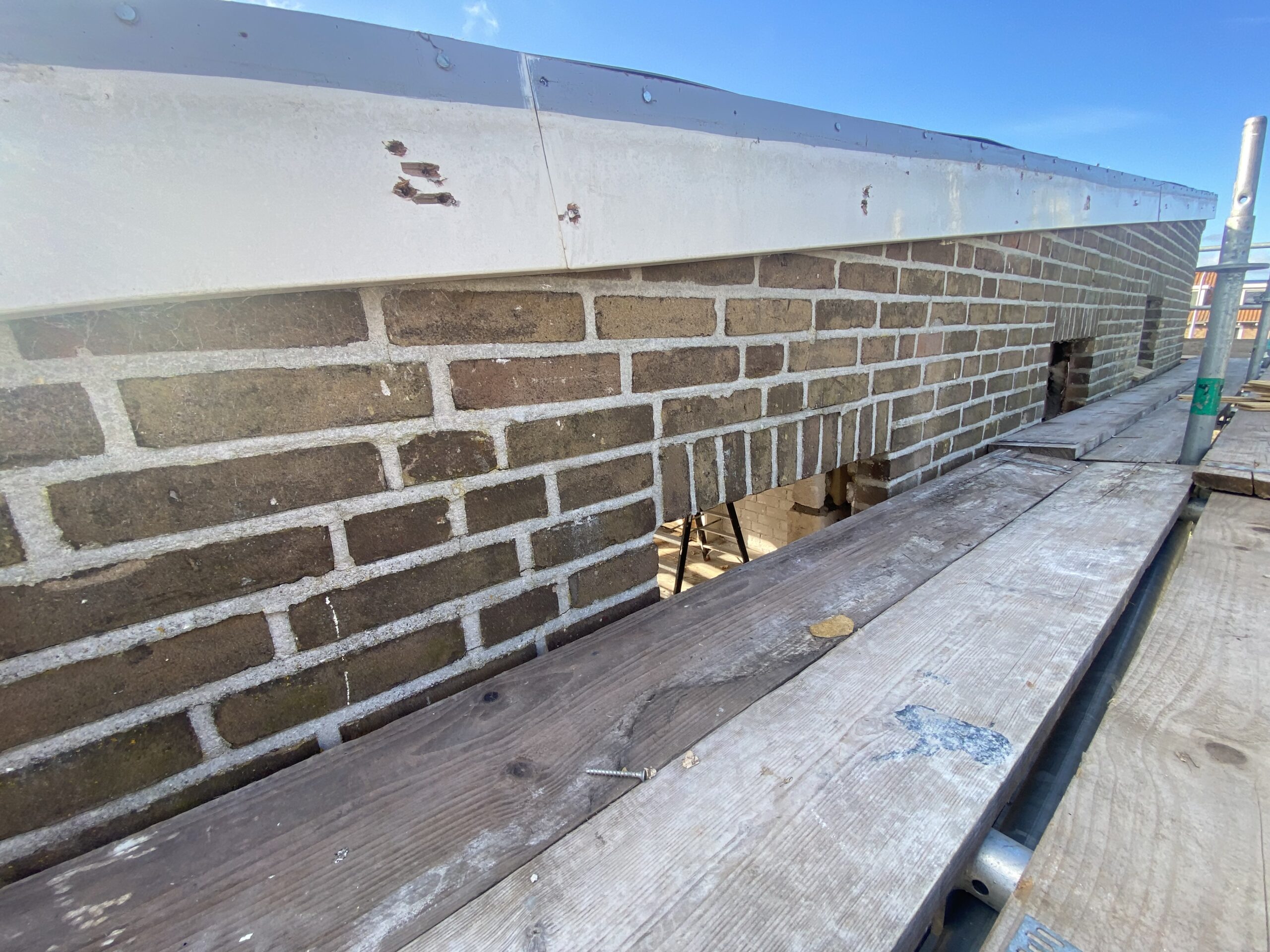 Het lood van de schoorsteen wordt compleet vervangen voor nieuw 18 ponds lood. Het oude bestaande lood wordt verwijderd en afgevoerd, daar waar het nieuw lood komt zullen wij het metselwerk inslijpen tot een diepte van ongeveer 30 a 35 mm. De ondergrond zullen wij stofvrij maken, nu kan het nieuwe lood worden aangebracht. Het lood wordt in de gevel vastgezet met loodklemmen. Als het lood is aanbracht wordt de schoorsteen gevoegd.